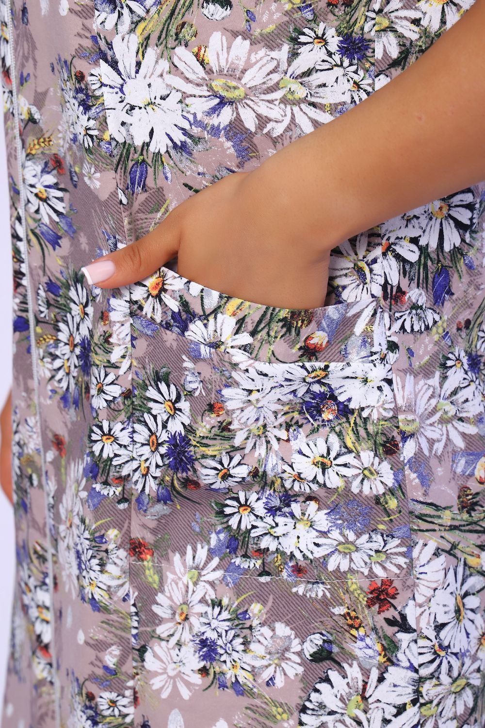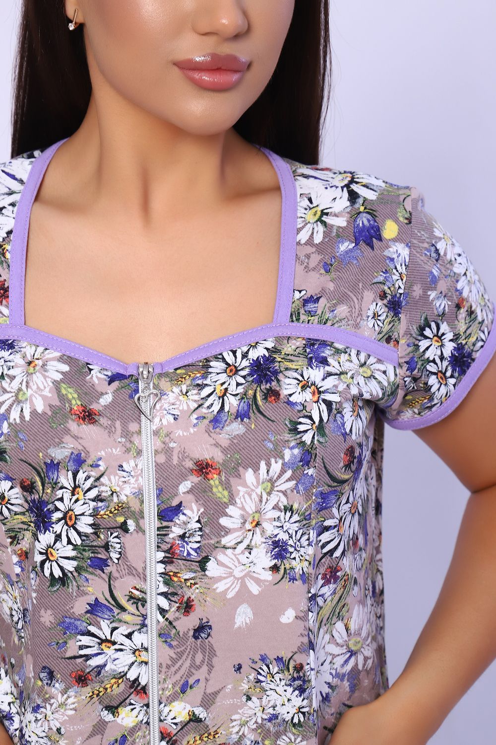Красивый женский халат на молнии. На полочках рельеф, который подчеркнет вашу фигуру. В рельефе карман. Рукав короткий. Горловина, кокетки и рукава обработаны бейкой из отделочной ткани. Халат прекрасно подойдет для дома, дачи и отдыха. А принт из луговых цветов придаст вам летнее настроение.