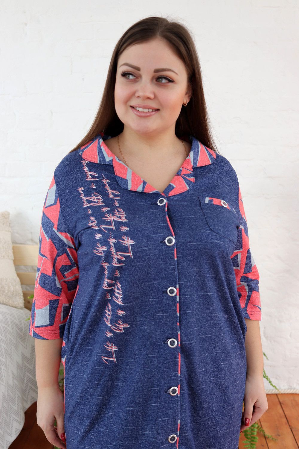 Халат женский полуприлегающего силуэта. Воротник английского типа, рукав втачной 3/4. Застежка на петли - пуговицы. Воротник, спинка, рукава и обтачка нагрудного кармана из отделочной ткани. На полочках два внутренних кармана, на левой полочке нагрудный карман, на правой полочке принт.