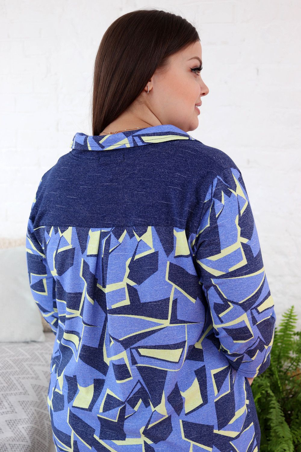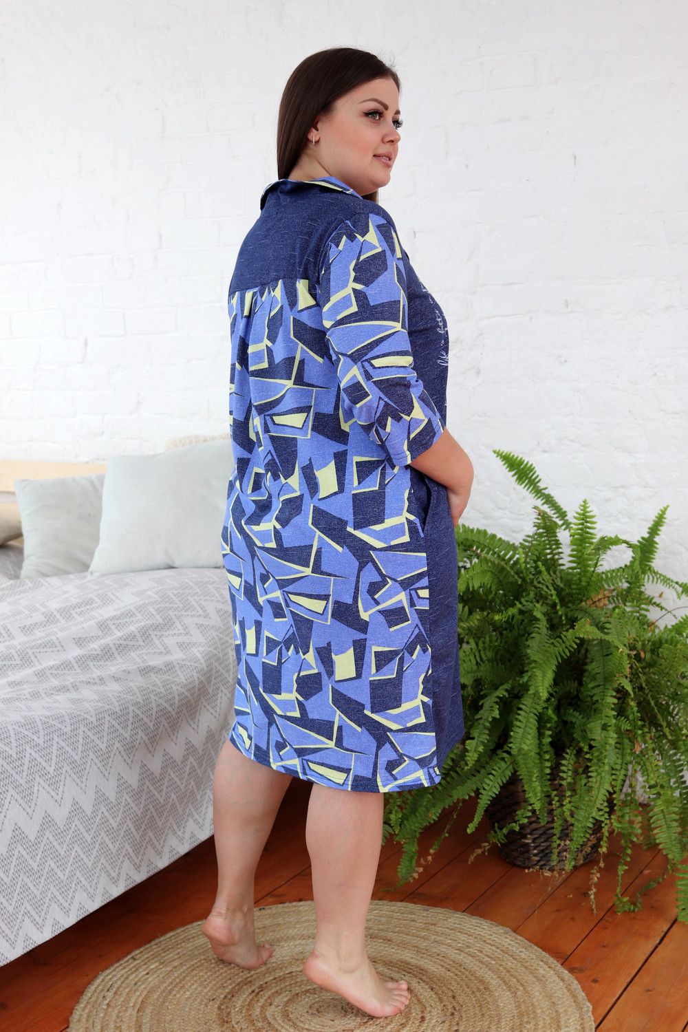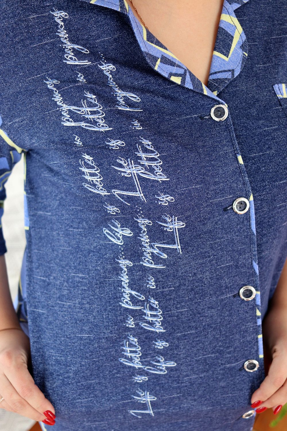 Халат женский полуприлегающего силуэта. Воротник английского типа, рукав втачной 3/4. Застежка на петли - пуговицы. Воротник, спинка, рукава и обтачка нагрудного кармана из отделочной ткани. На полочках два внутренних кармана, на левой полочке нагрудный карман, на правой полочке принт.