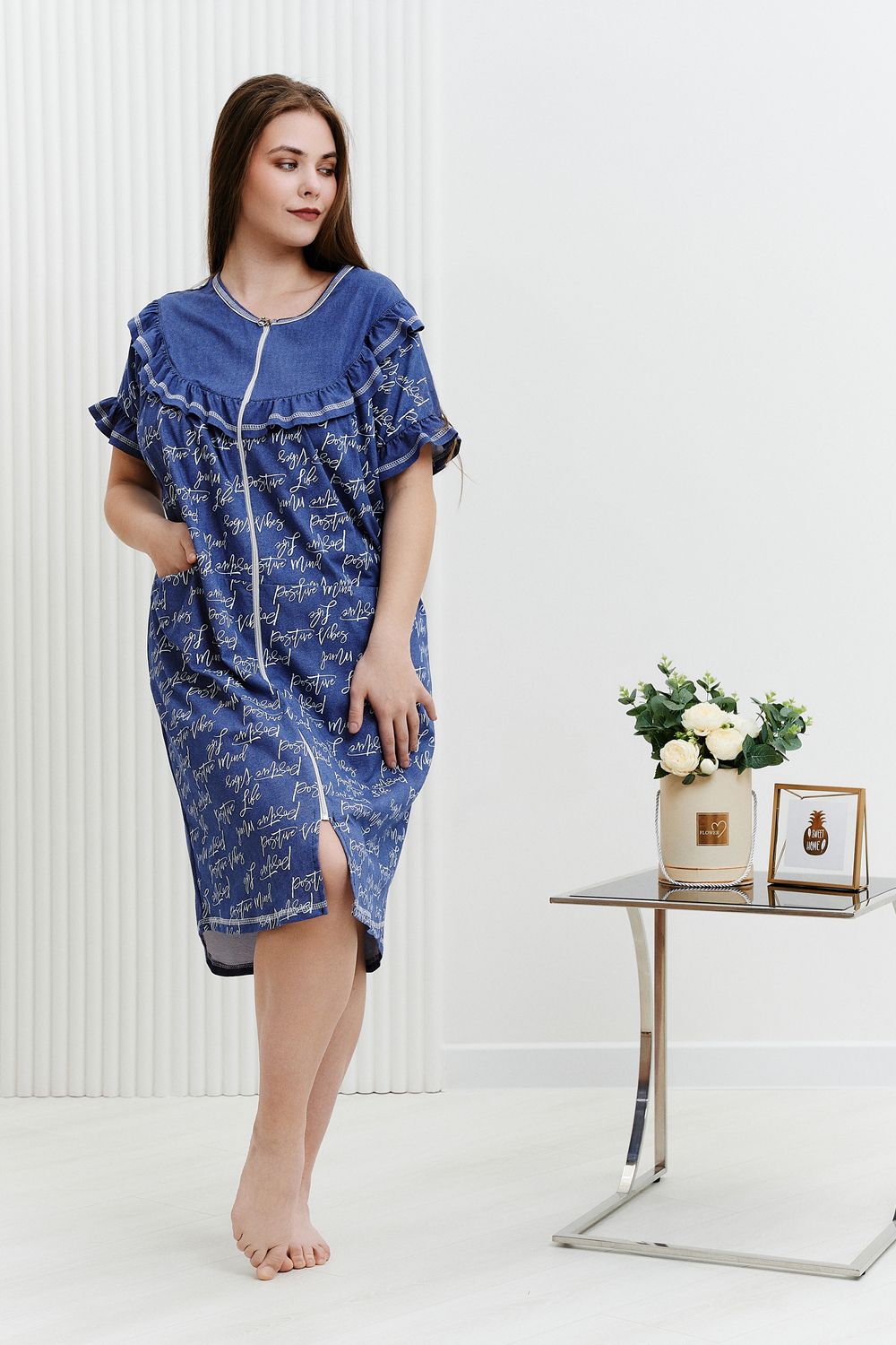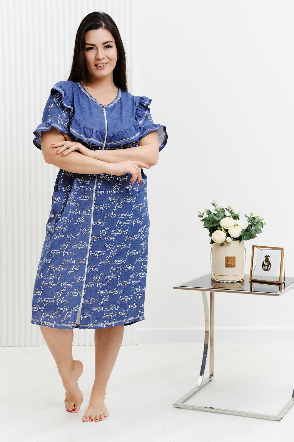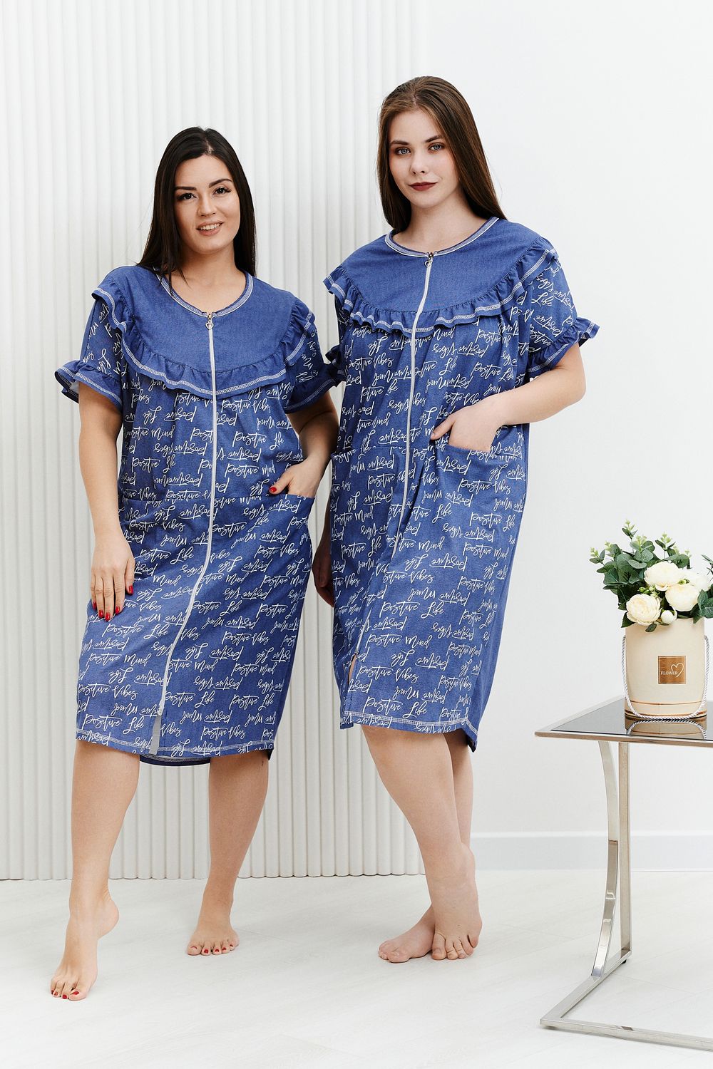 Халат женский, полуприлегающего силуэта, горловина округлая, застежка на тесьму-молнию. На полочке кокетка с рюшей, также рюша внизу цельнокроенного короткого рукава из отделочной ткани. Внутренние горизонтальные карманы в шве стачивания верхней и нижней части полочки.