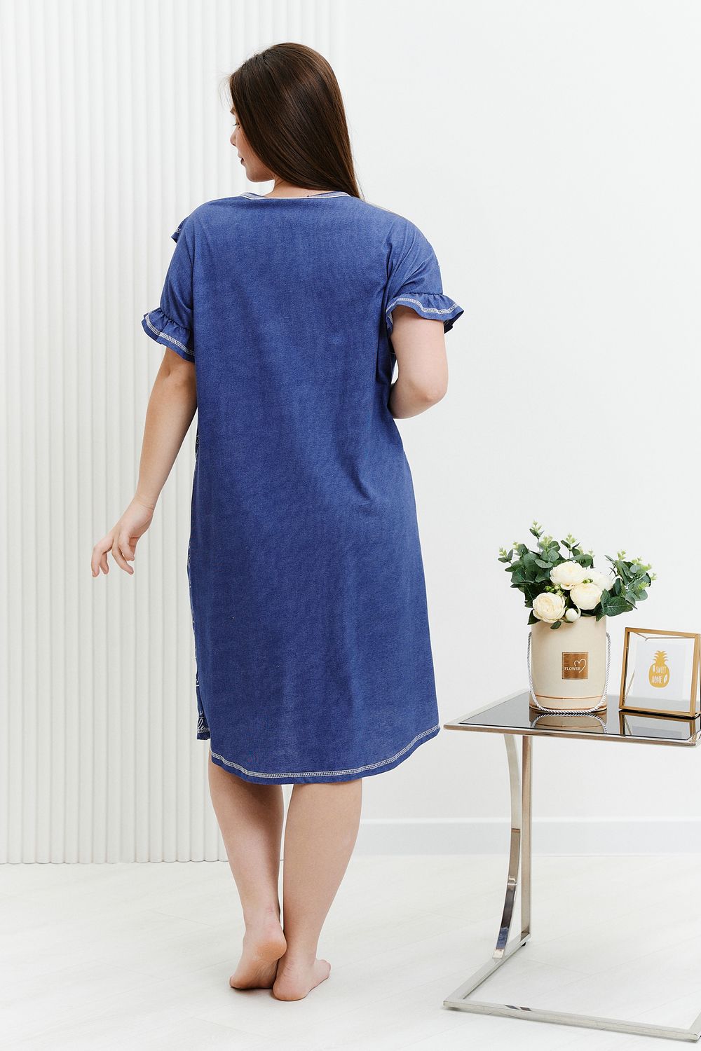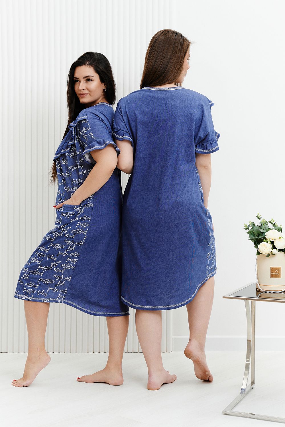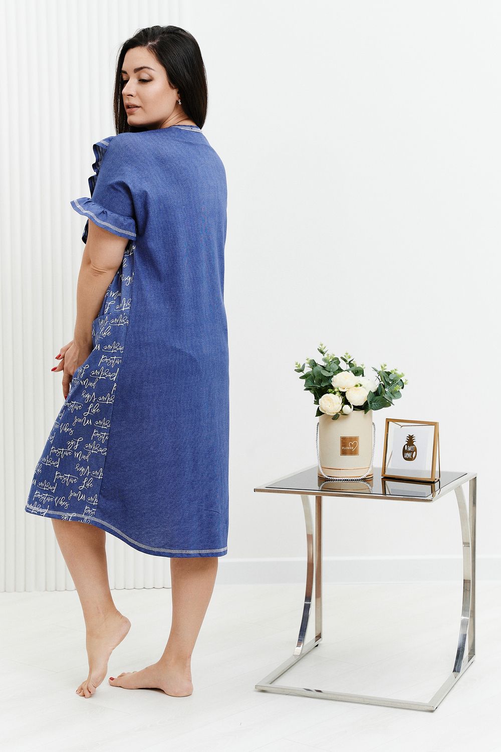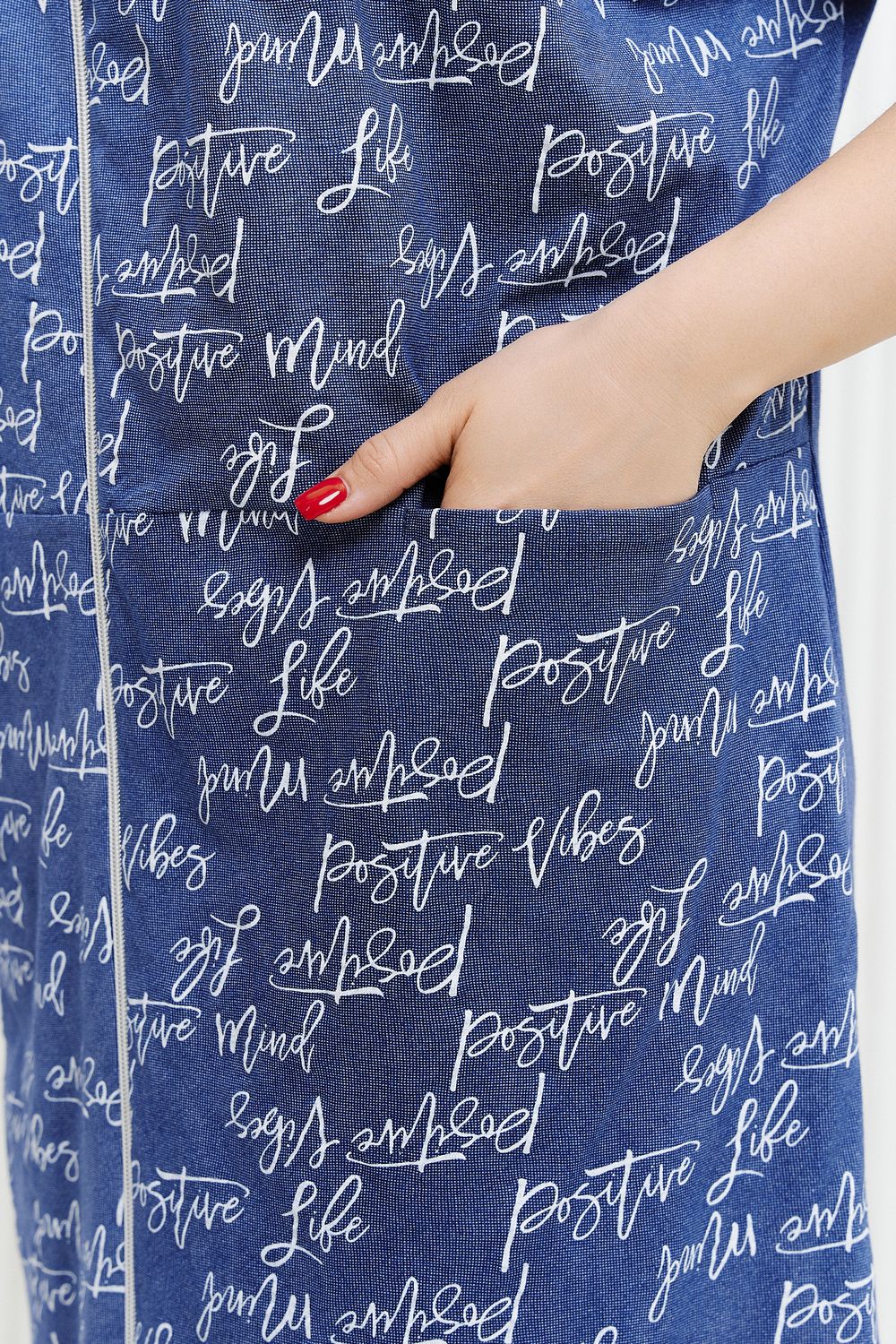 Халат женский, полуприлегающего силуэта, горловина округлая, застежка на тесьму-молнию. На полочке кокетка с рюшей, также рюша внизу цельнокроенного короткого рукава из отделочной ткани. Внутренние горизонтальные карманы в шве стачивания верхней и нижней части полочки.