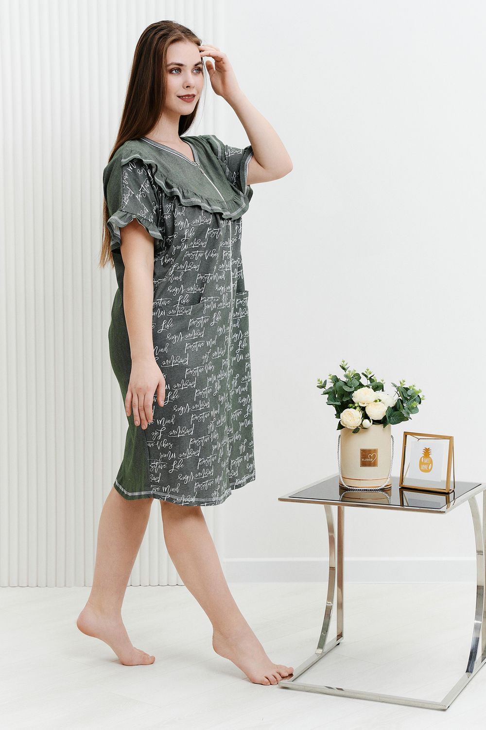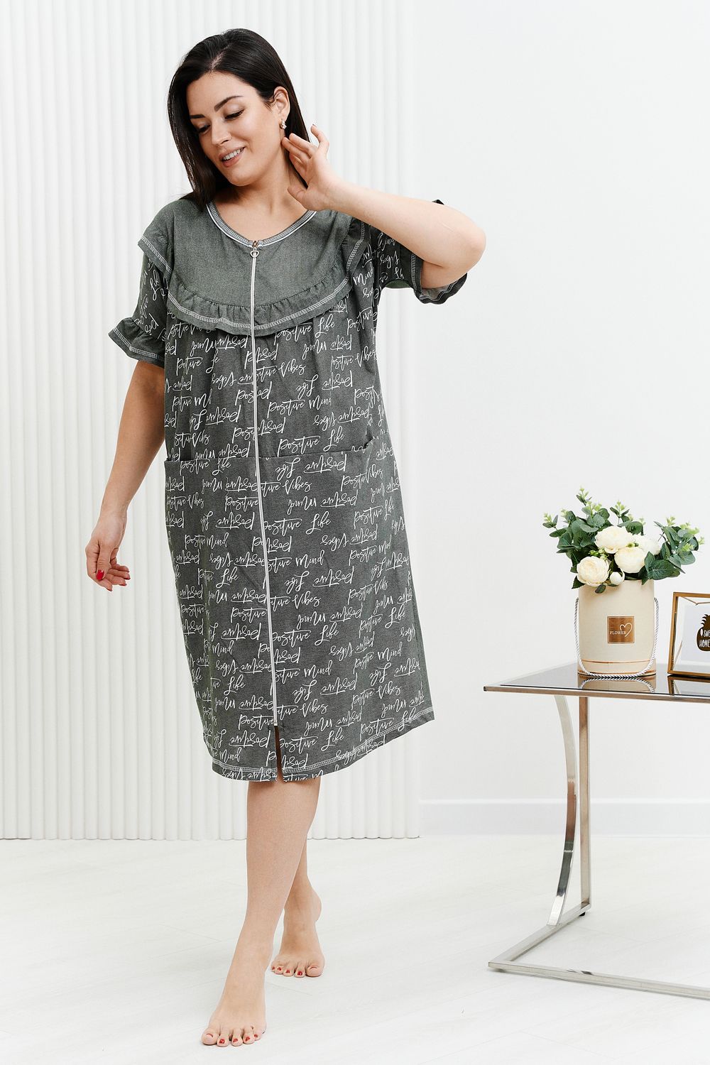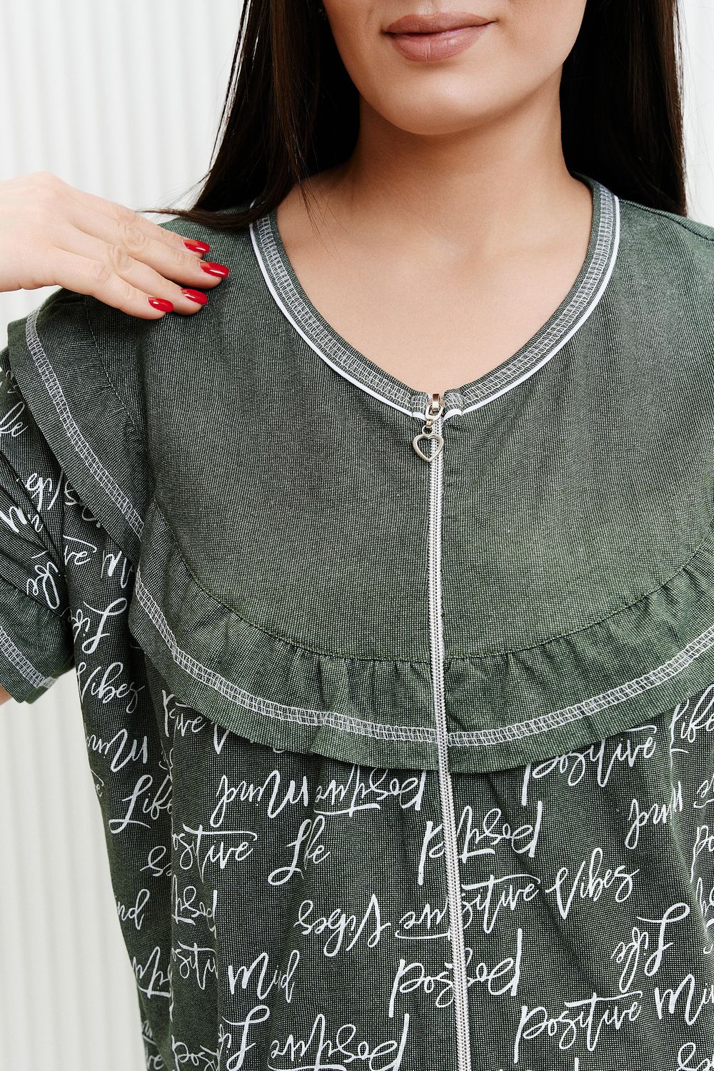 Халат женский, полуприлегающего силуэта, горловина округлая, застежка на тесьму-молнию. На полочке кокетка с рюшей, также рюша внизу цельнокроенного короткого рукава из отделочной ткани. Внутренние горизонтальные карманы в шве стачивания верхней и нижней части полочки.
