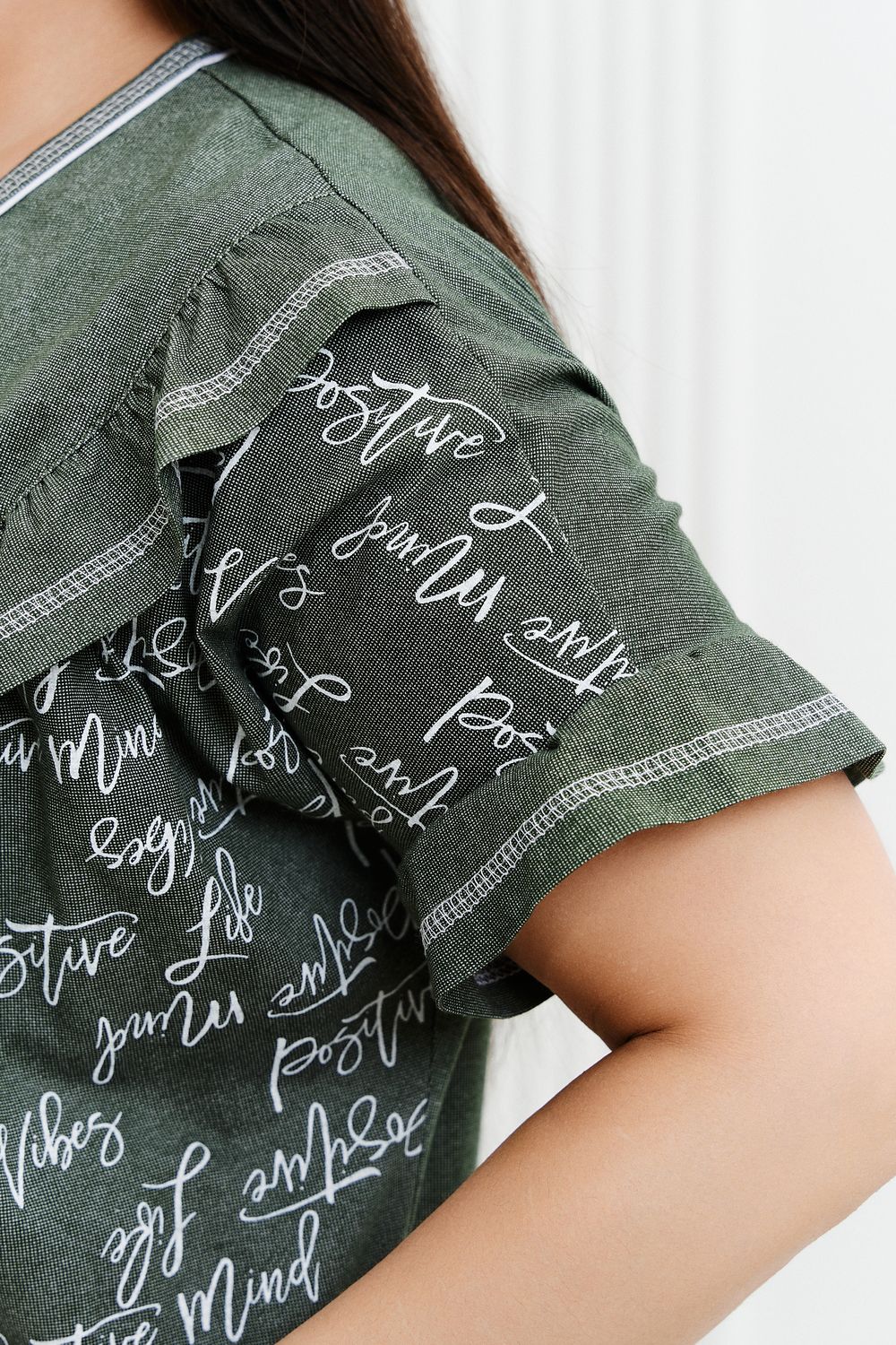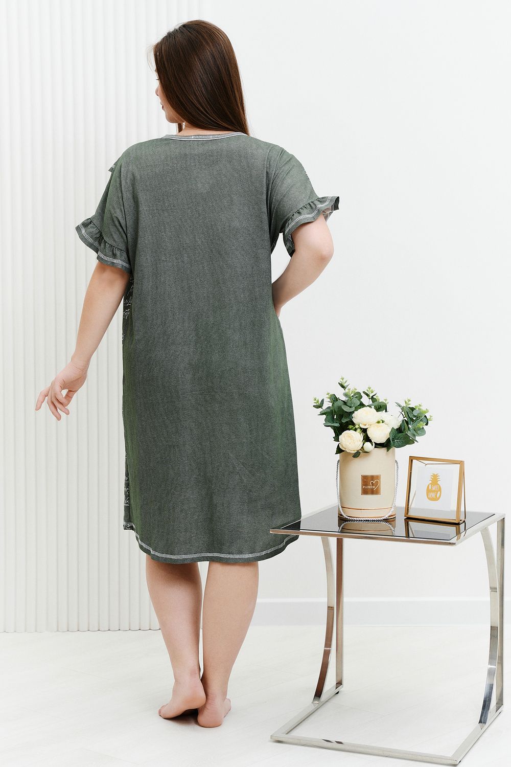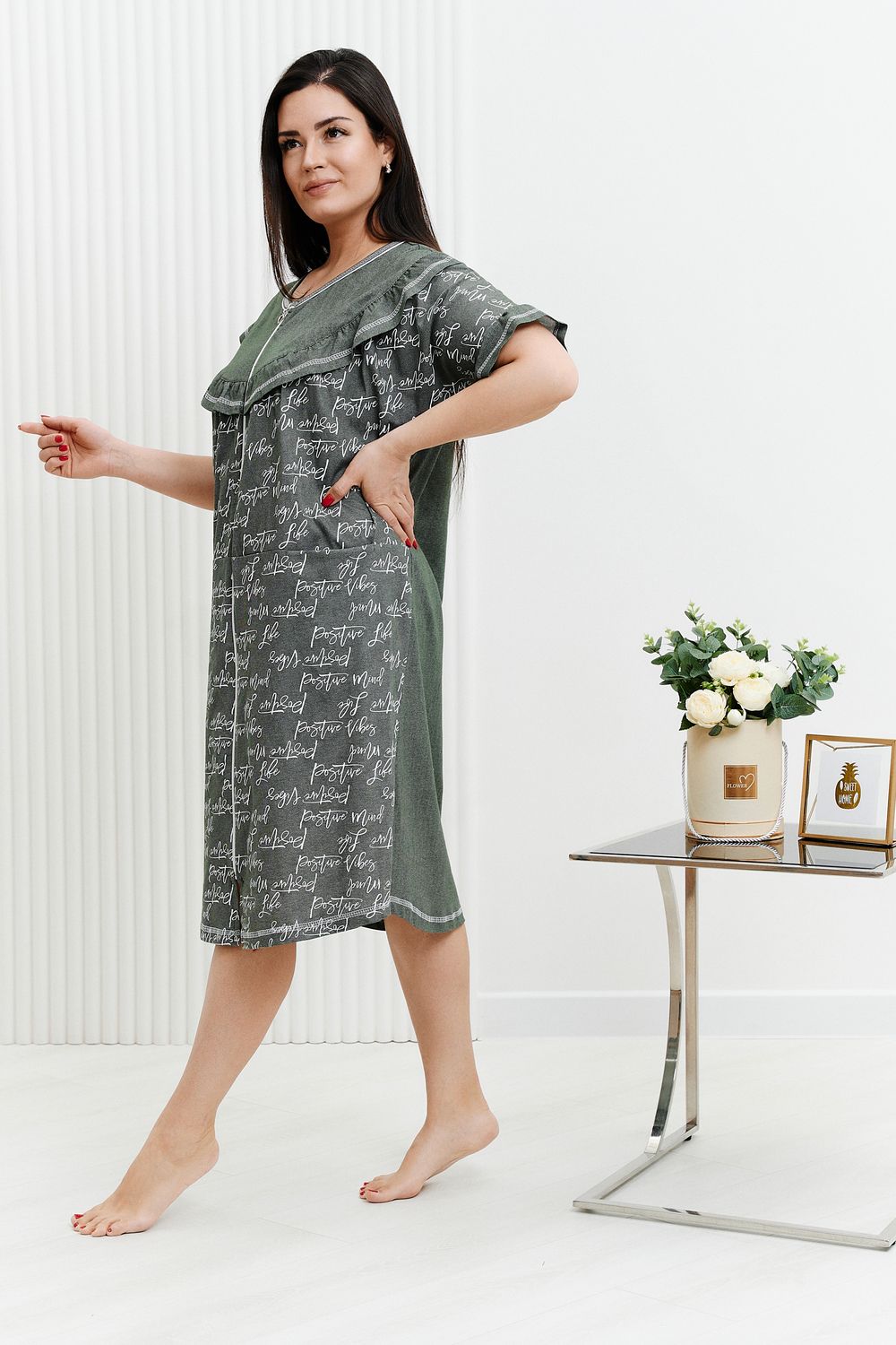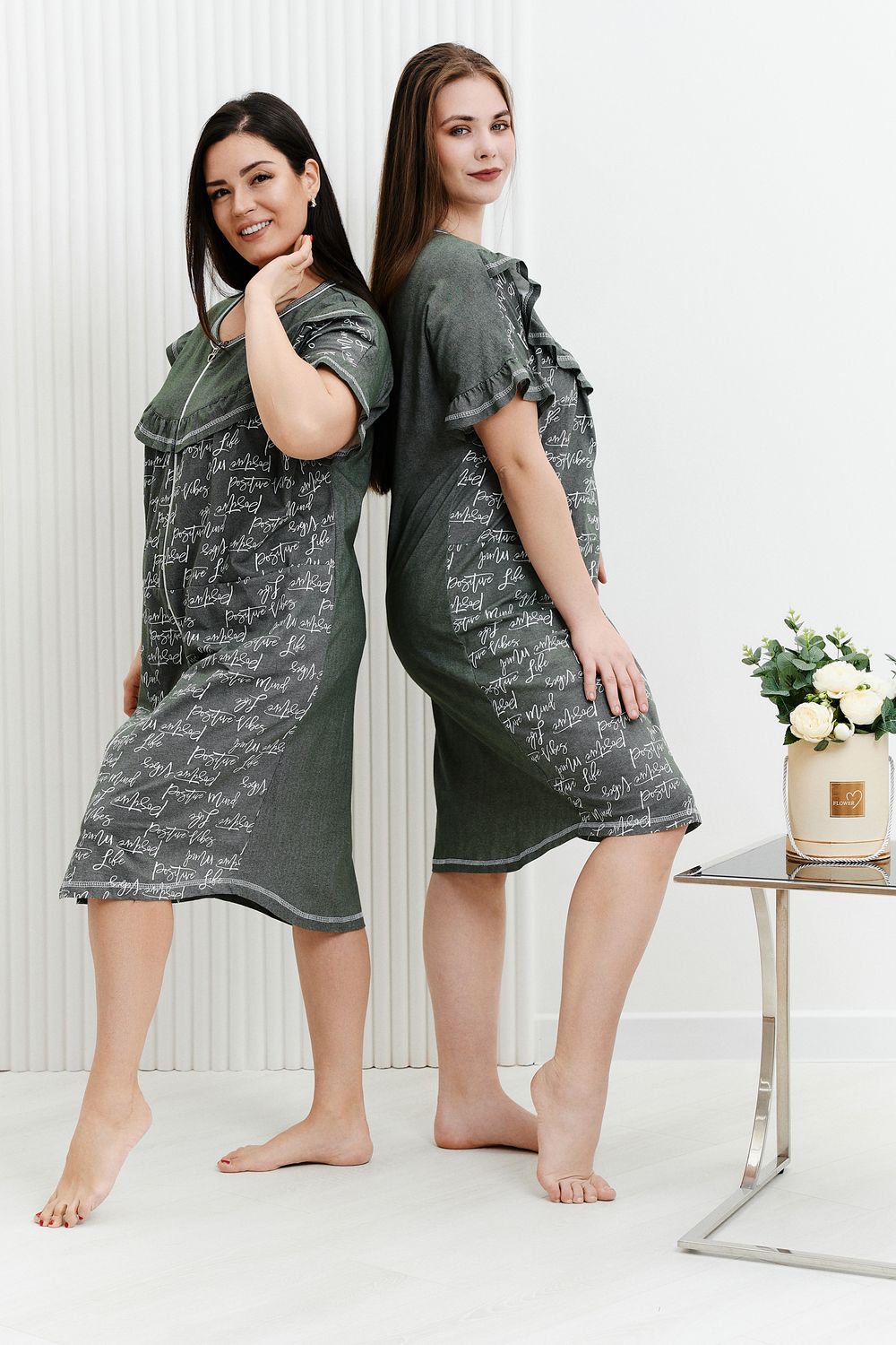 Халат женский, полуприлегающего силуэта, горловина округлая, застежка на тесьму-молнию. На полочке кокетка с рюшей, также рюша внизу цельнокроенного короткого рукава из отделочной ткани. Внутренние горизонтальные карманы в шве стачивания верхней и нижней части полочки.