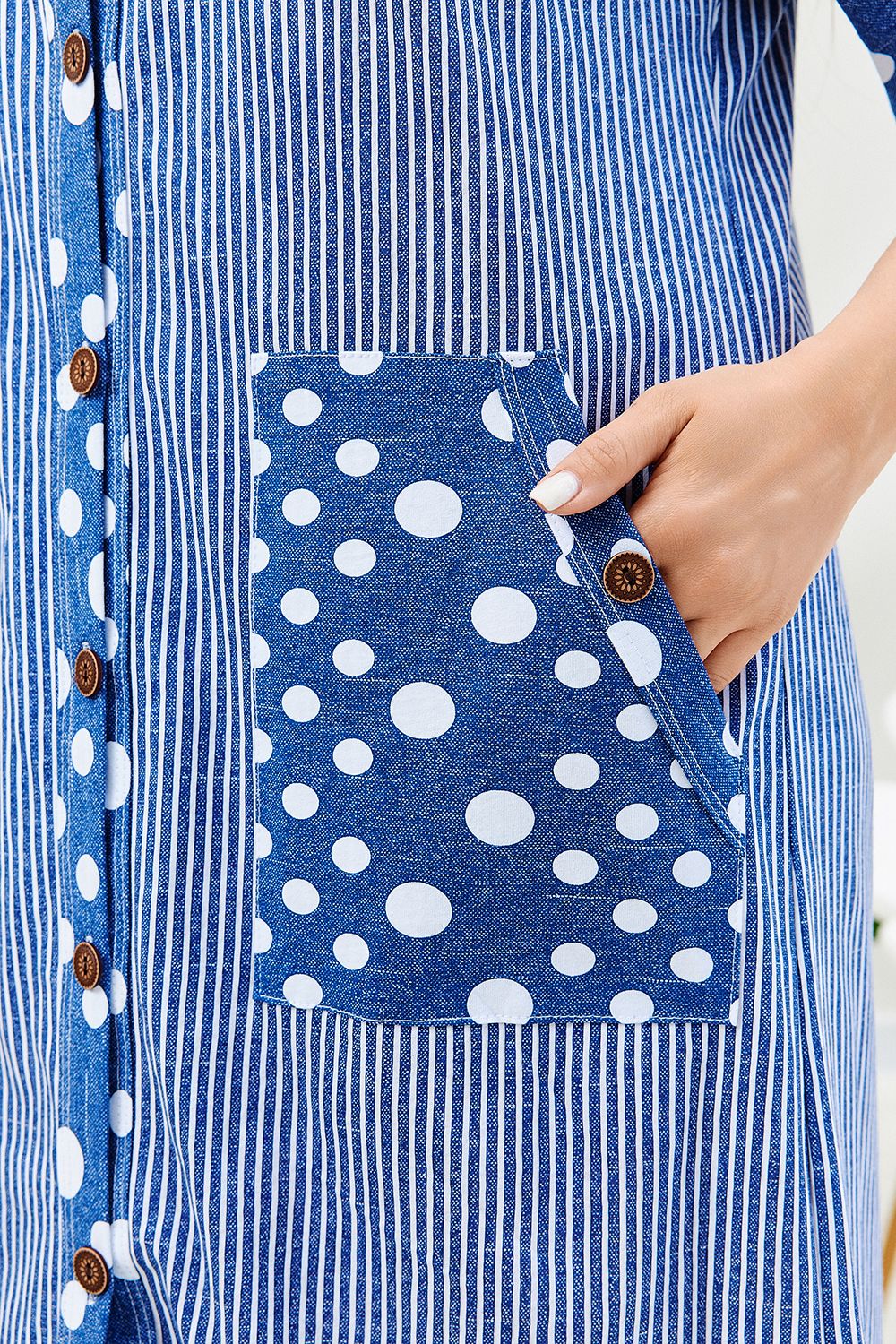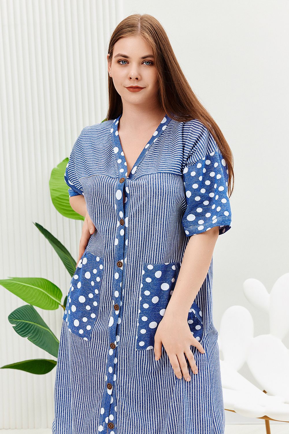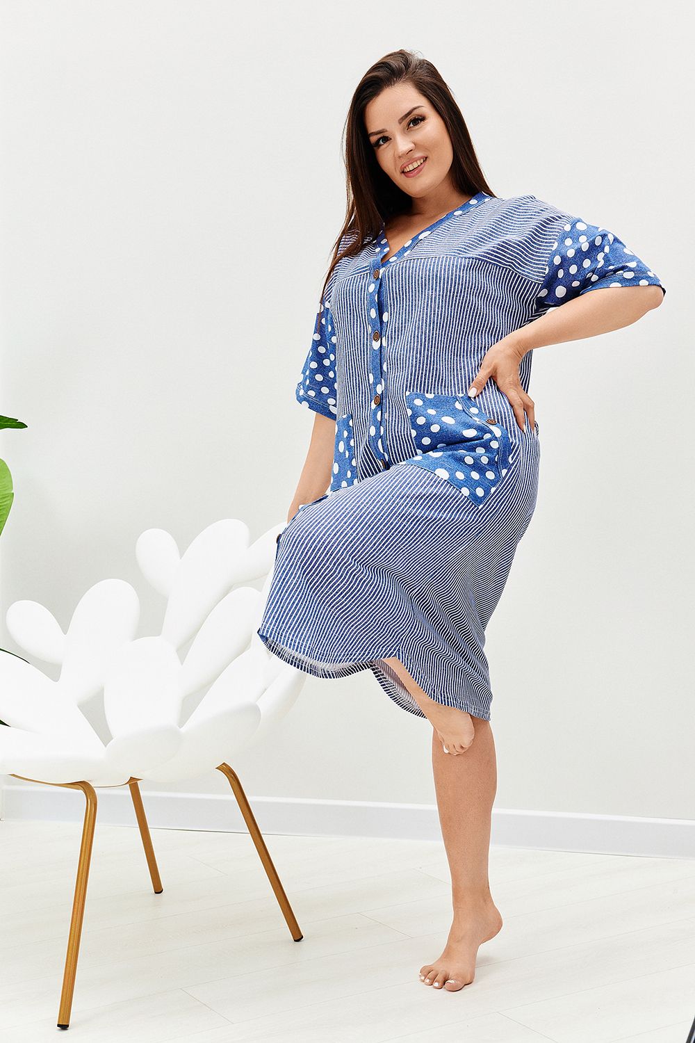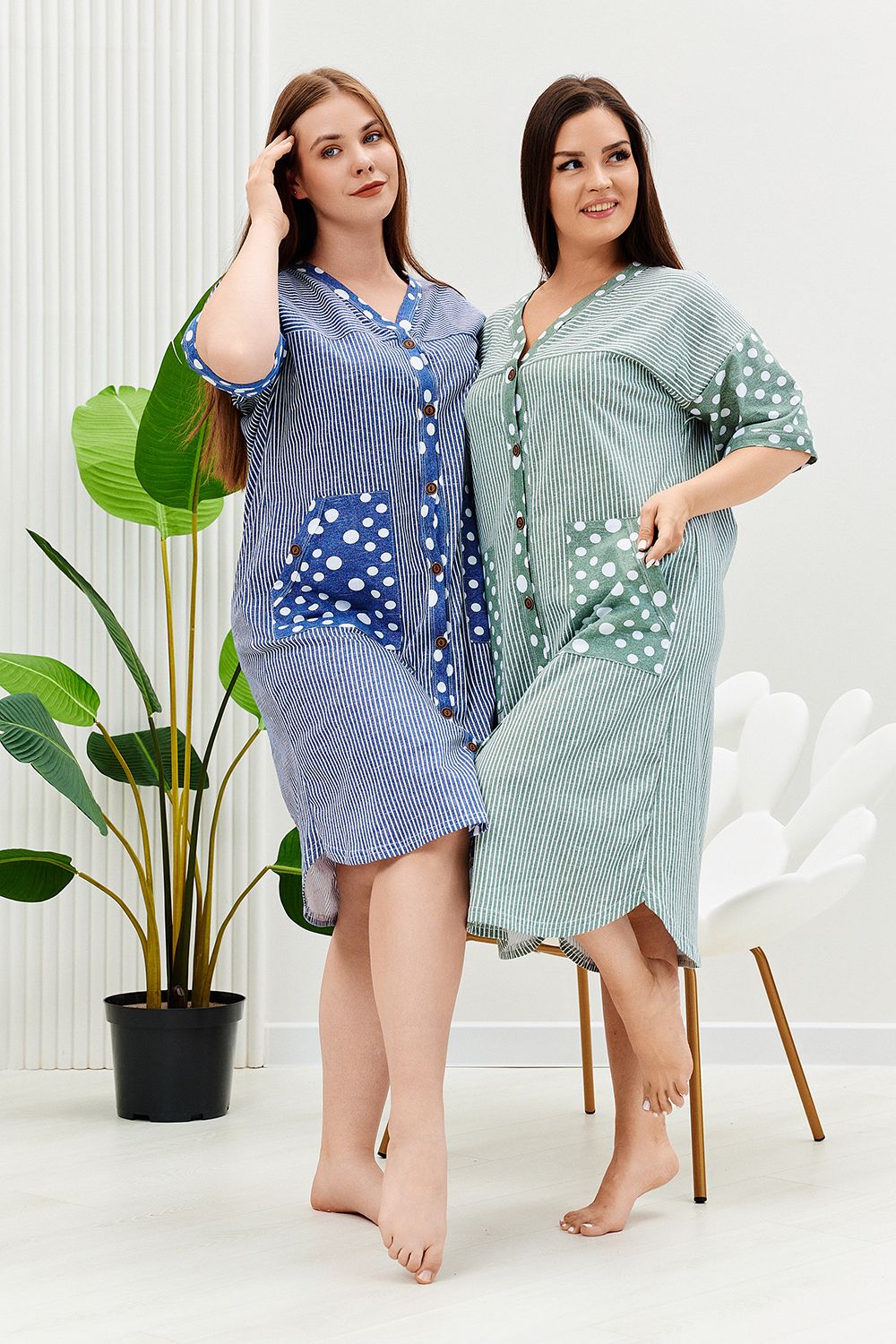 Халат женский прямого силуэта, расширение к низу за счет складки на спинке. Рукав короткий цельнокроенныйсо швом. На полочке и спинке кокетки и накладные карманы. Борт изделия, низ рукавов и вход в карман окантованы широкой бейкой из отделочной ткани. Сочетание отделки из гороха и основной ткани из полоски придают изделию особую актуальность.