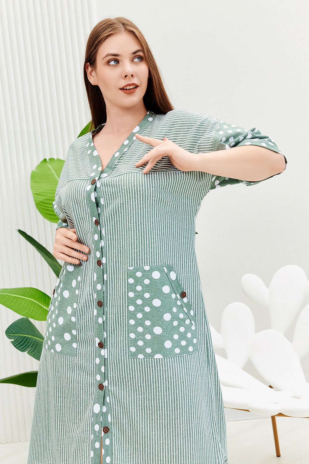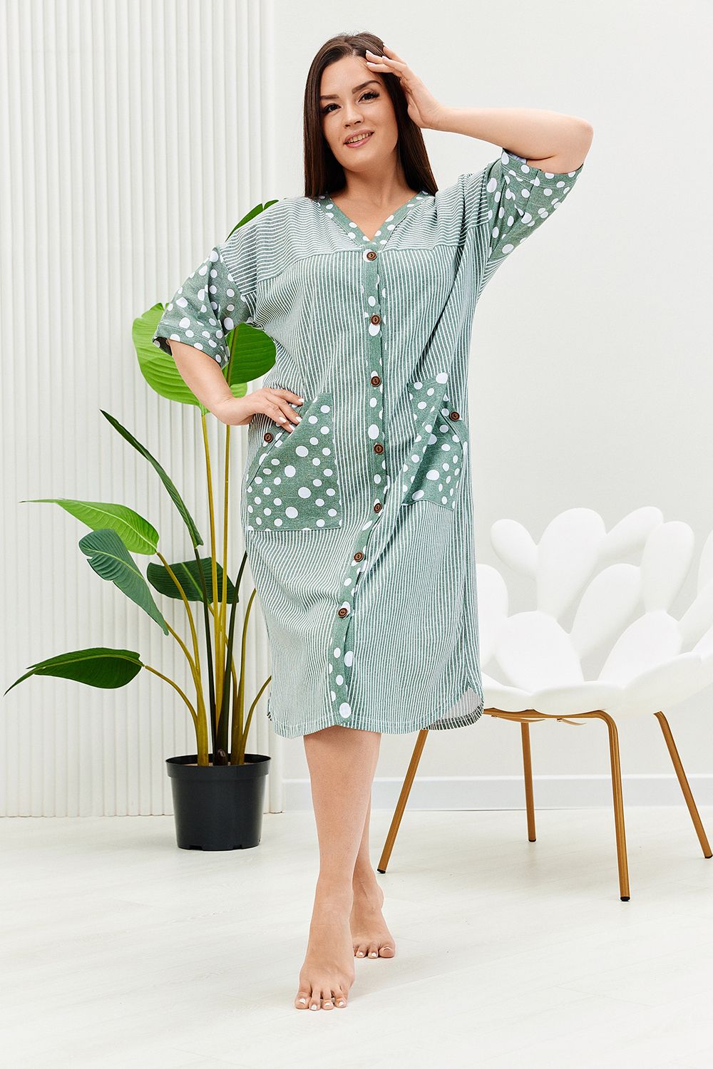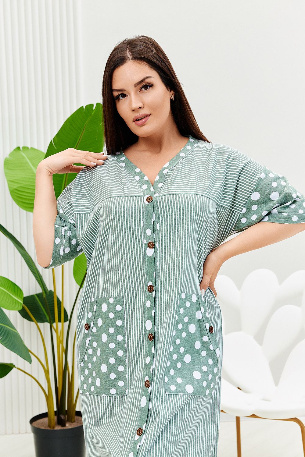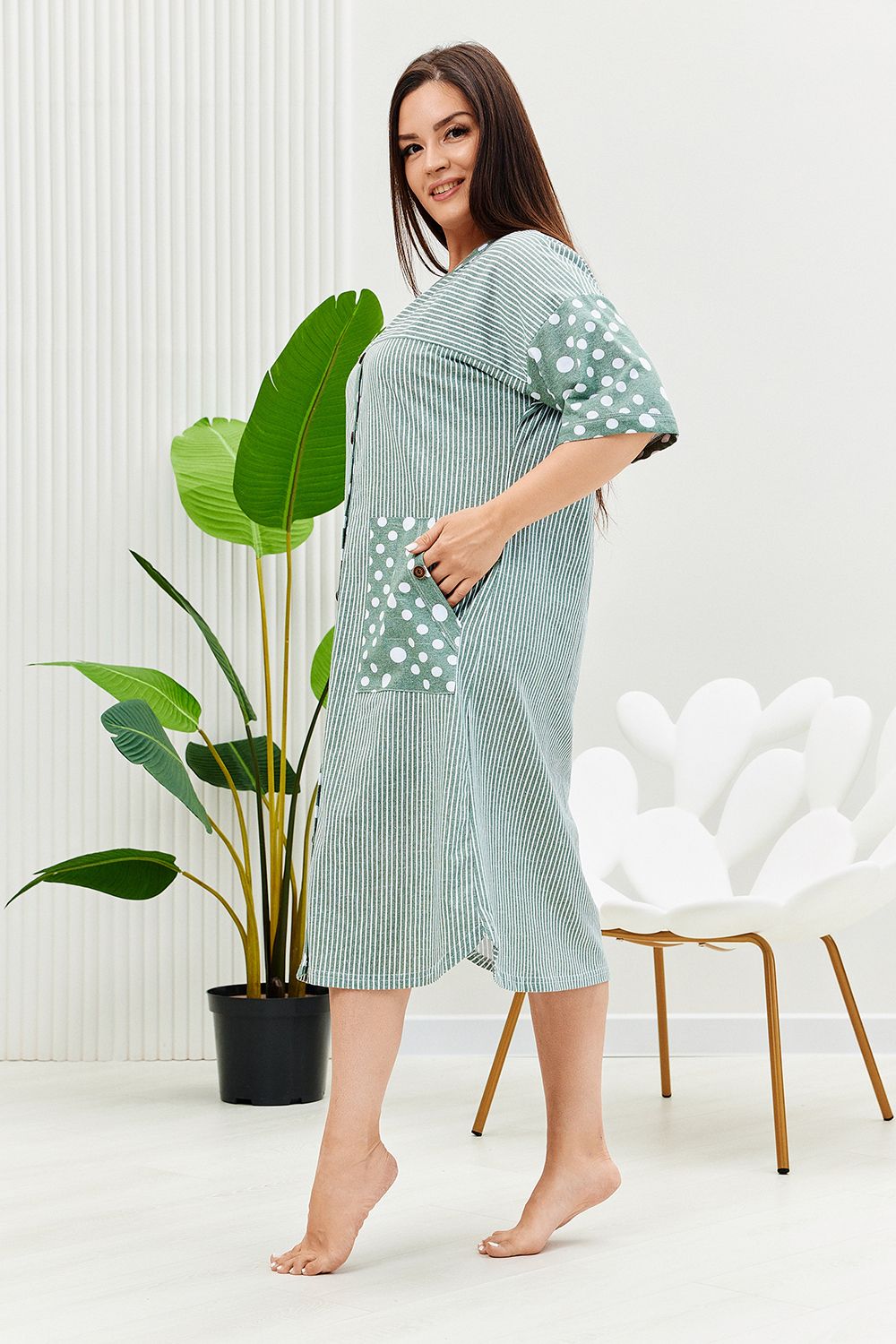 Халат женский прямого силуэта, расширение к низу за счет складки на спинке. Рукав короткий цельнокроенныйсо швом. На полочке и спинке кокетки и накладные карманы. Борт изделия, низ рукавов и вход в карман окантованы широкой бейкой из отделочной ткани. Сочетание отделки из гороха и основной ткани из полоски придают изделию особую актуальность.