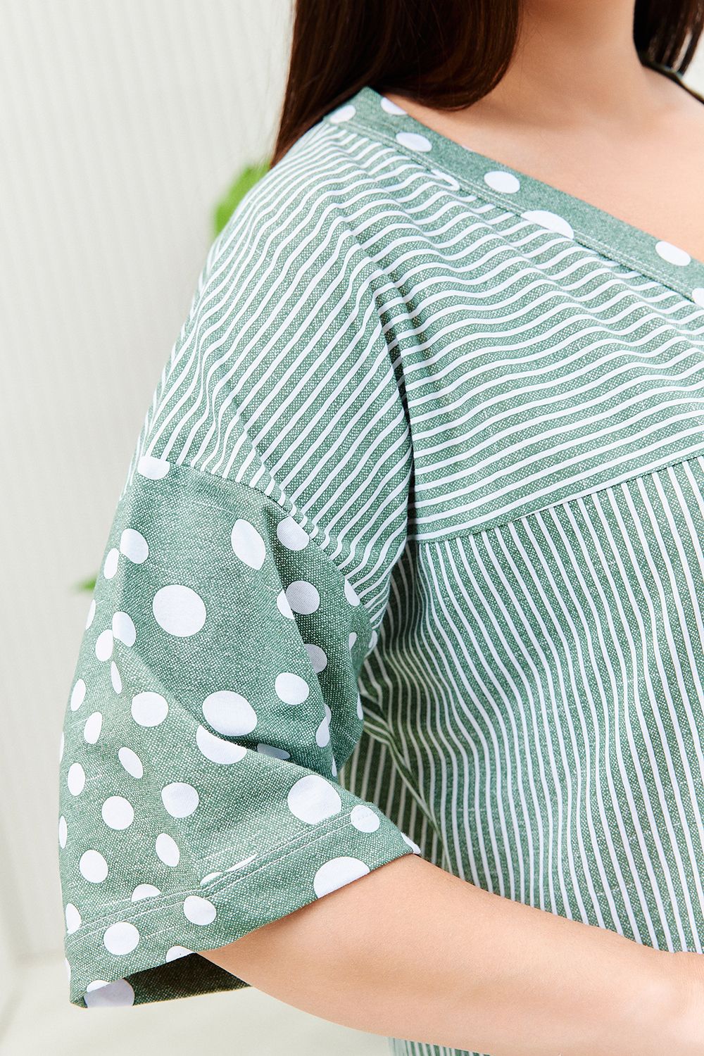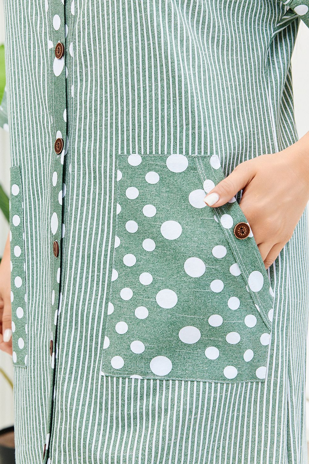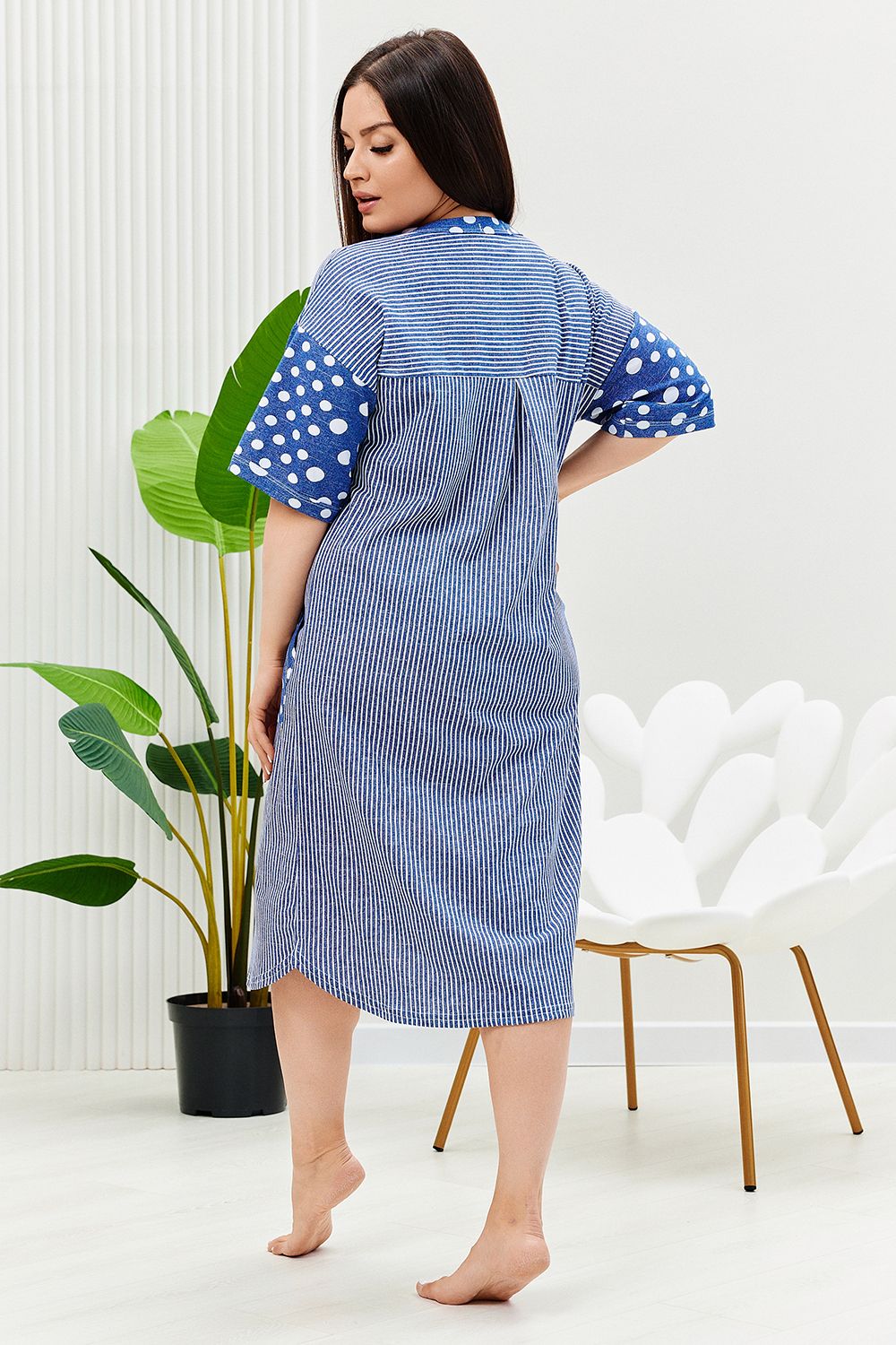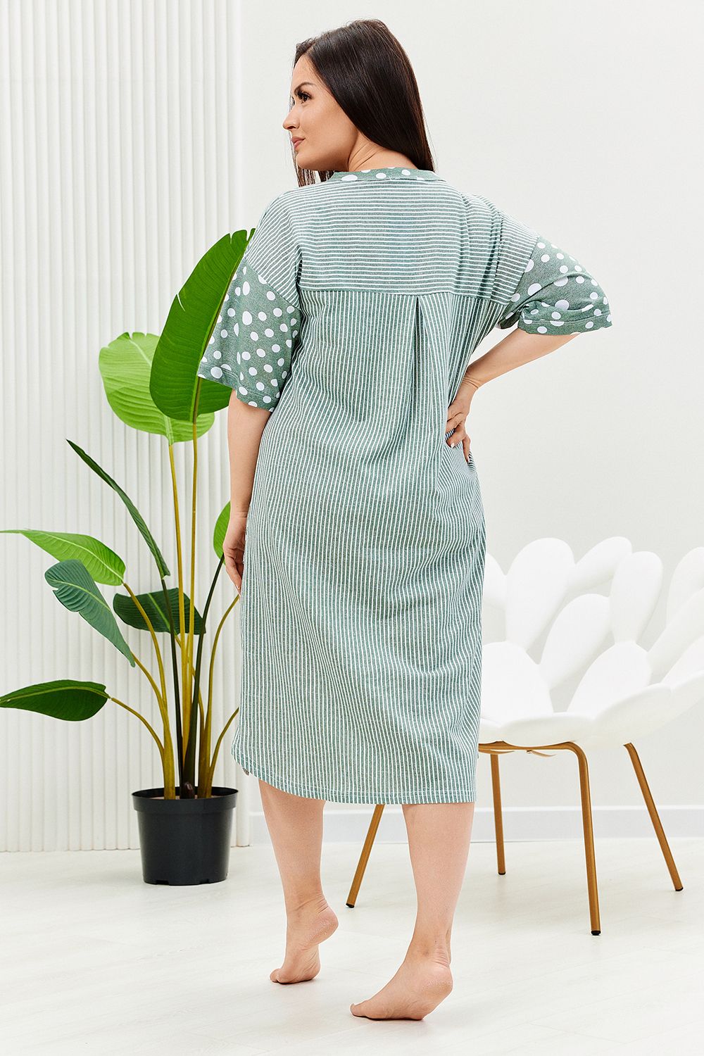 Халат женский прямого силуэта, расширение к низу за счет складки на спинке. Рукав короткий цельнокроенныйсо швом. На полочке и спинке кокетки и накладные карманы. Борт изделия, низ рукавов и вход в карман окантованы широкой бейкой из отделочной ткани. Сочетание отделки из гороха и основной ткани из полоски придают изделию особую актуальность.