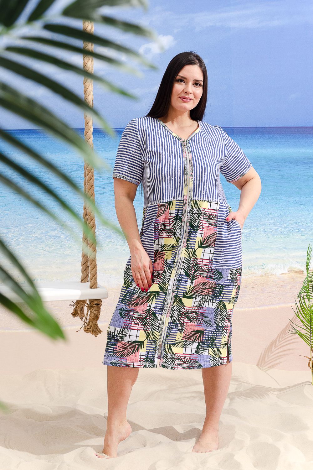 Халат женский полуприлегающего силуэта. Горловина округлая, рукав втачной короткий. Застежка на тесьму-молнию. Верхние части полочки и спинки, а также рукава и накладные фигурные карманы из ткани " в полоску". Нижние части полочки и спинки из ткани-компаньона. Край борта, горловина, низ рукавов обработан бейкой с декоративной отделочной строчкой.