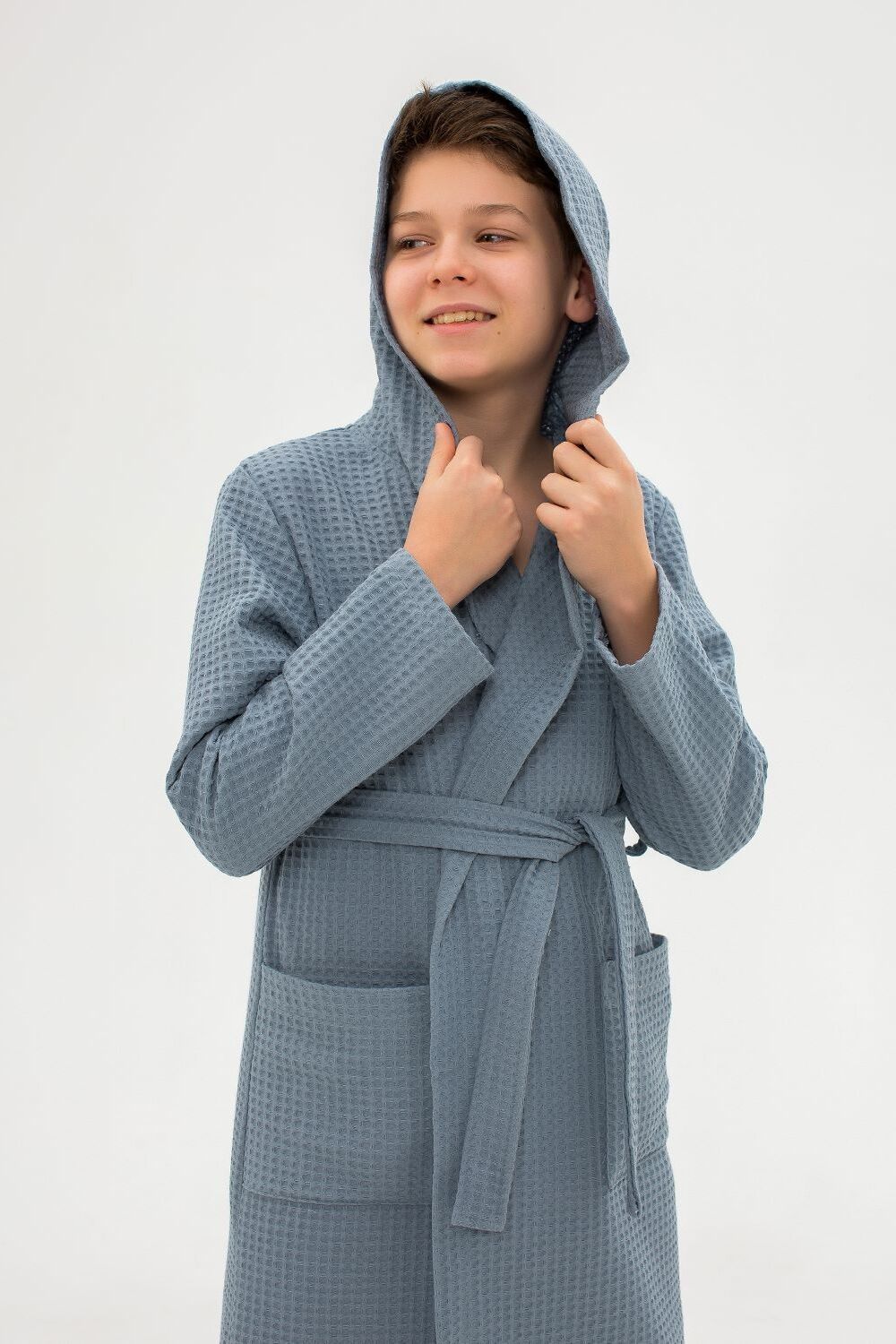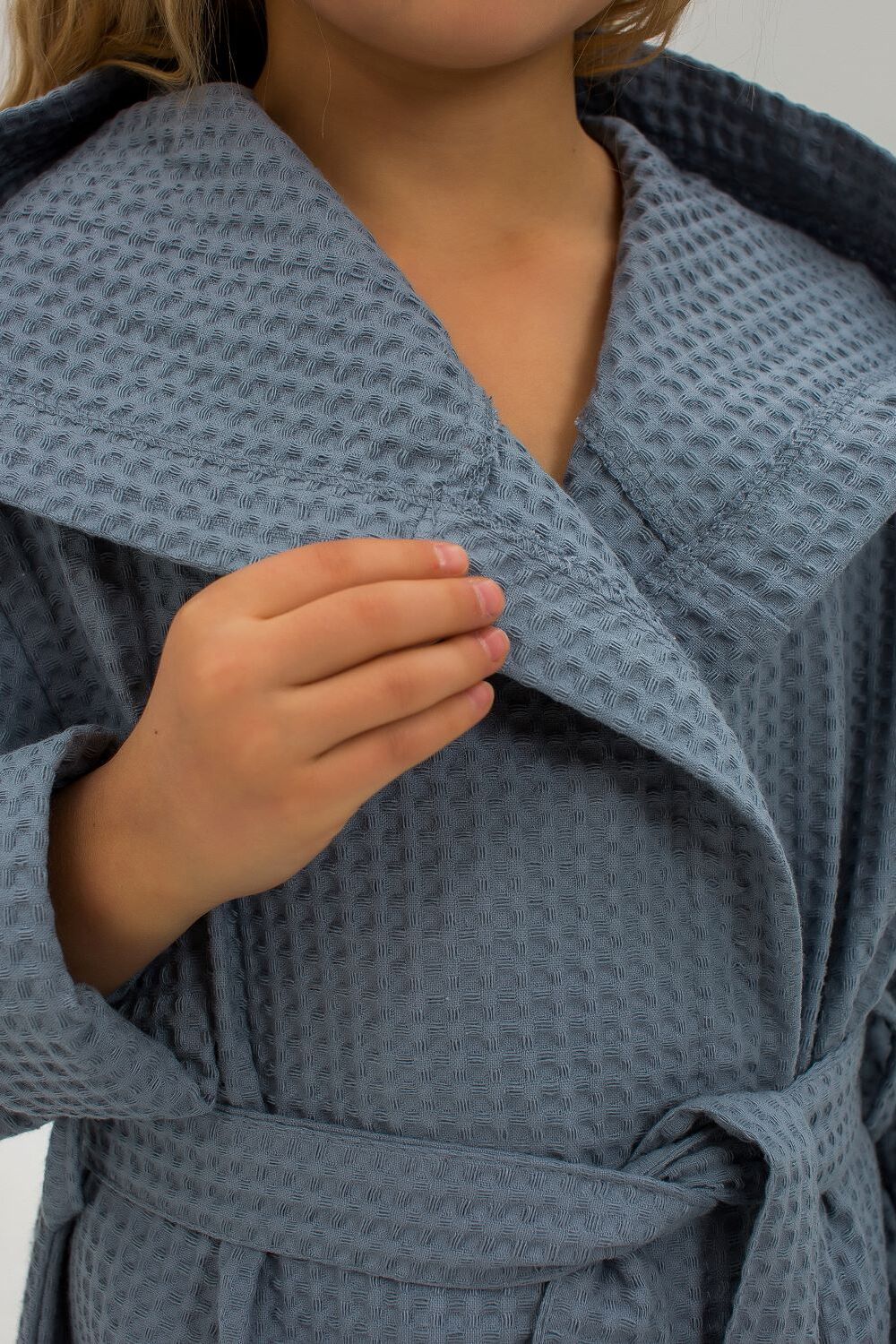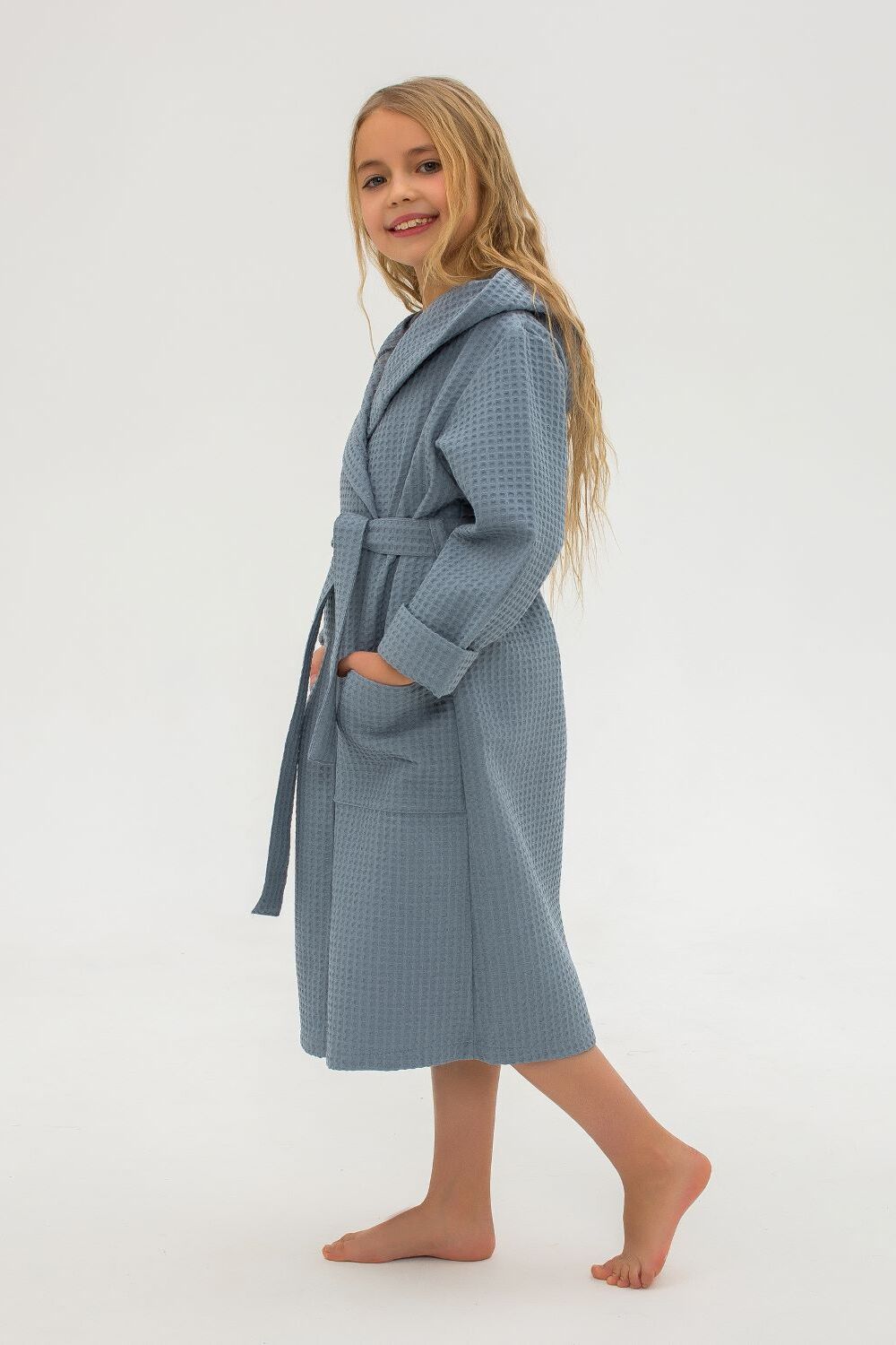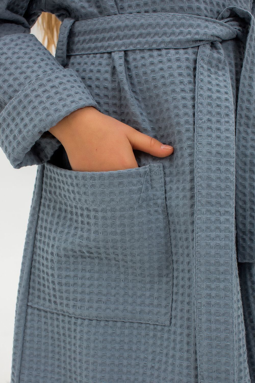 Халат вафельный детский. Модель с капюшоном на запах, с поясом в тон. Вафельное полотно 100% хлопок, плотностью 242 гр/м. Халат отлично подойдет как для дома, так и для бани, и для сауны или бассейна. Домашний халат - удобная и стильная удлиненная модель с глубоким капюшоном и длинным рукавом. Вафельный банный халат отлично впитывает влагу, дышит и очень приятен к телу.