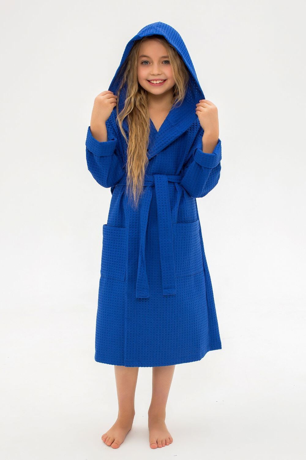 Халат вафельный детский. Модель с капюшоном на запах, с поясом в тон. Вафельное полотно 100% хлопок, плотностью 242 гр/м. Халат отлично подойдет как для дома, так и для бани, и для сауны или бассейна. Домашний халат - удобная и стильная удлиненная модель с глубоким капюшоном и длинным рукавом. Вафельный банный халат отлично впитывает влагу, дышит и очень приятен к телу.