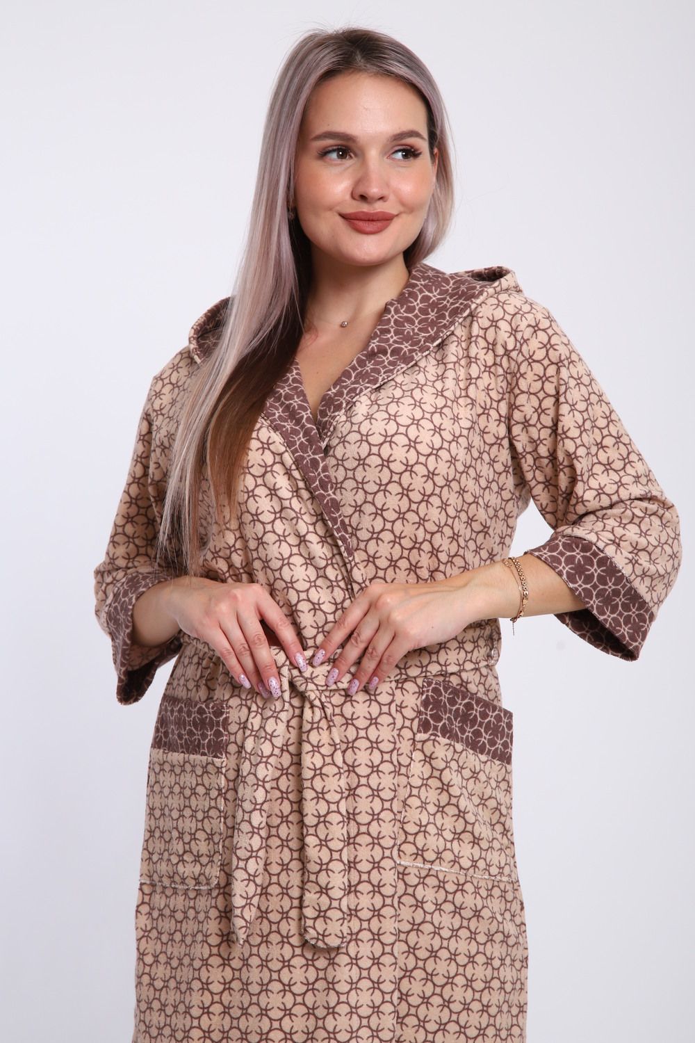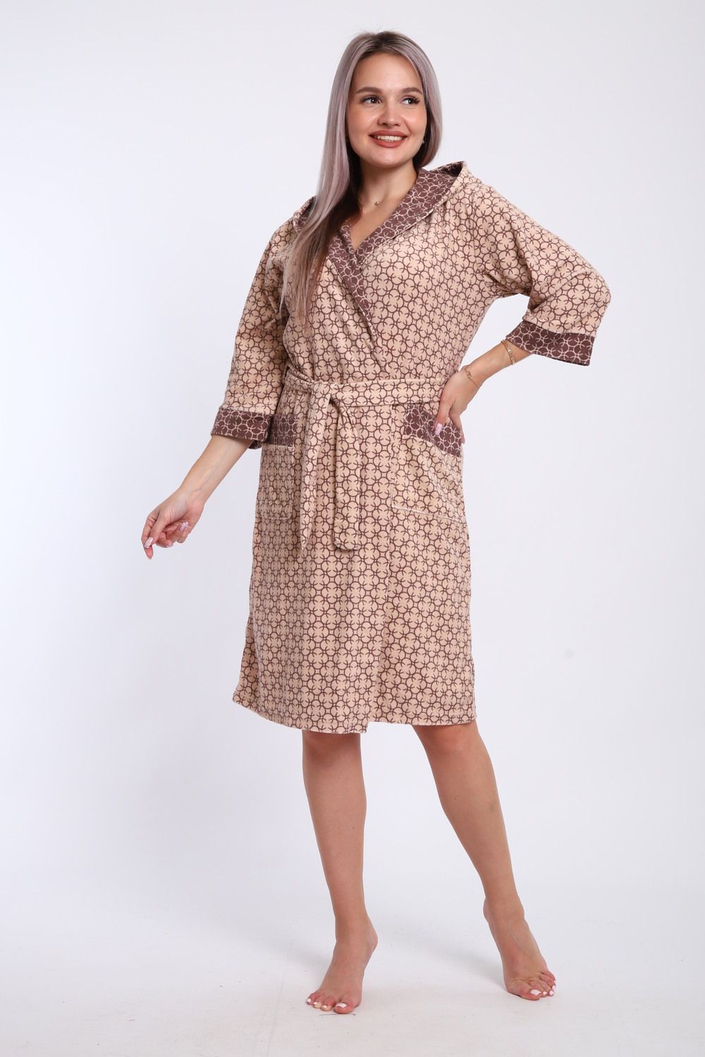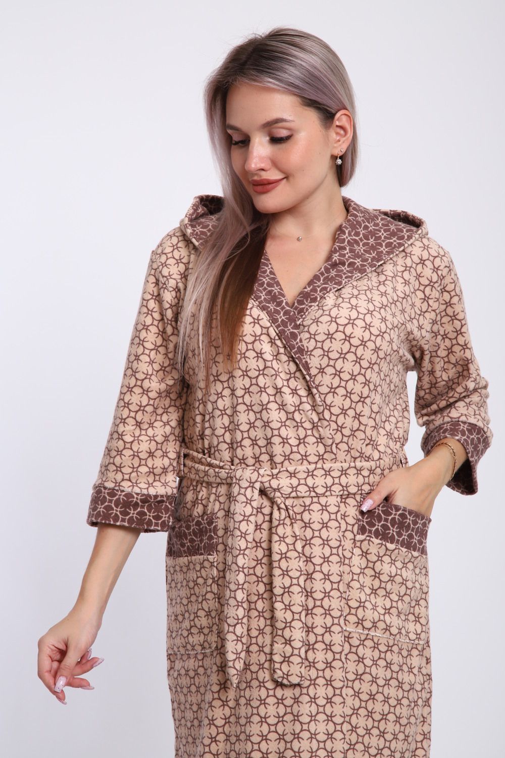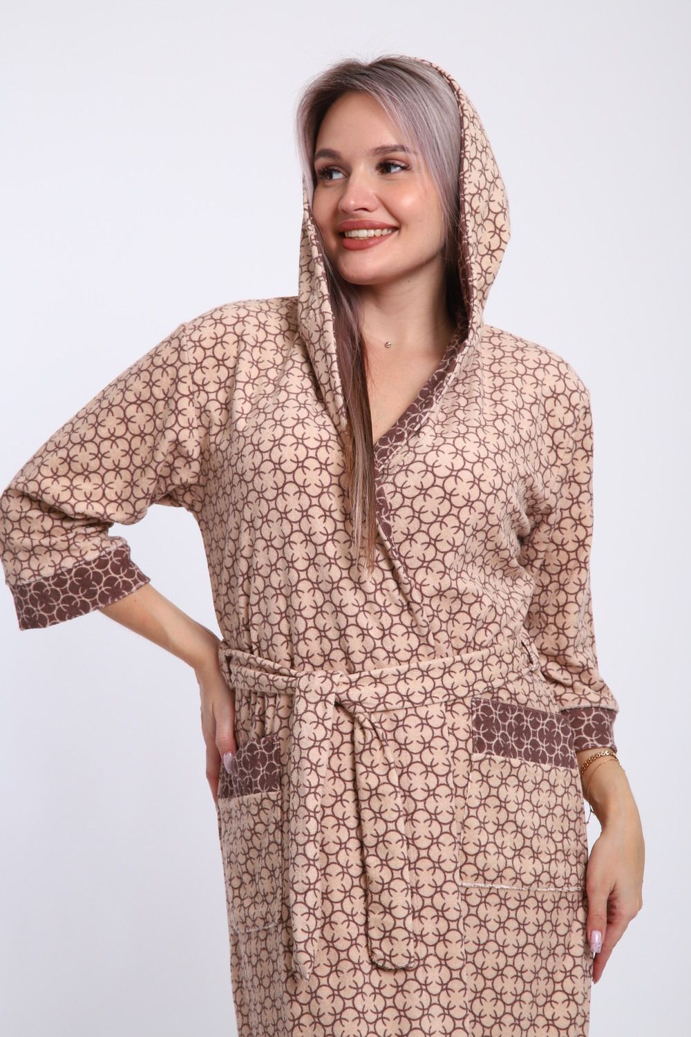 Халат женский из махры состав 80% хлопок 20% пэ. Халат с капюшоном и карманами. Халат на запах с поясом. Выполнен с тканью компаньон. Комфортный, средней длины.