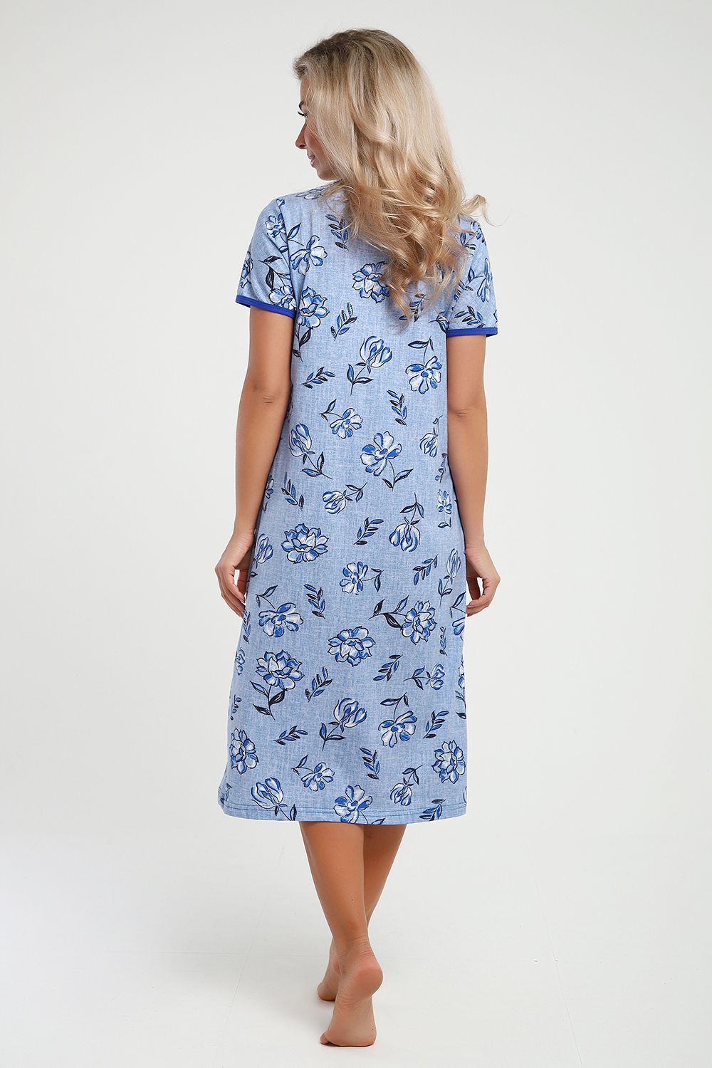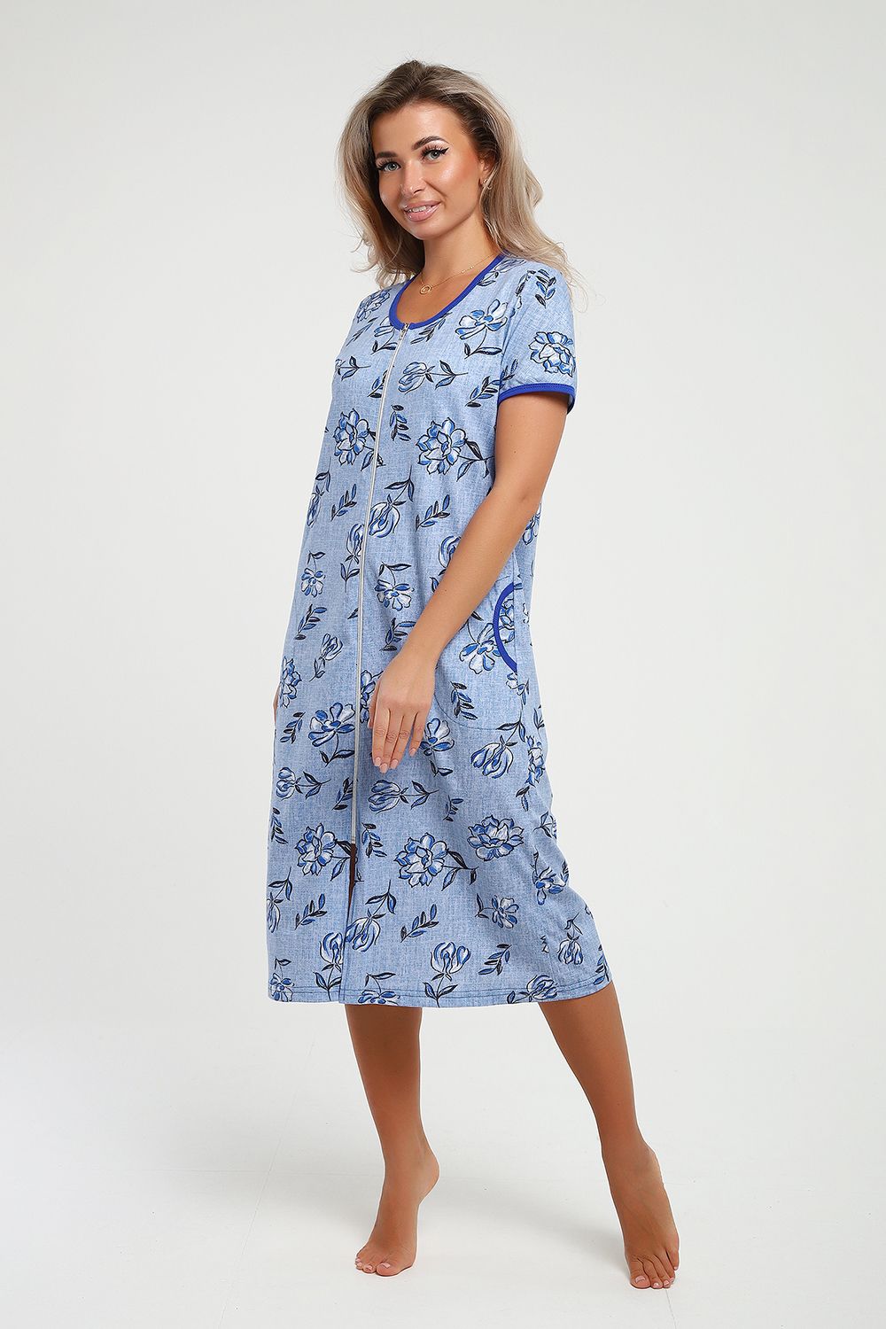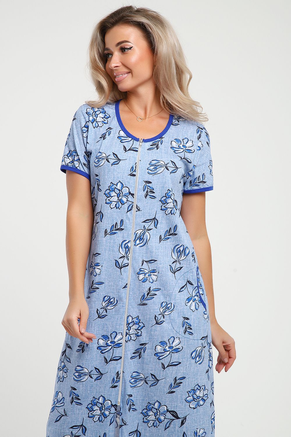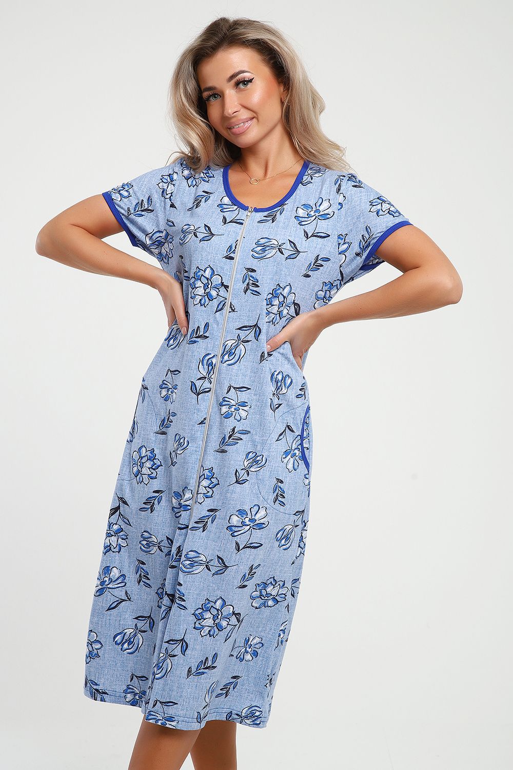 Халат женский из трикотажной хлопковой кулирки. Орнамент цветочная стилизация под вышивку. Рукава короткие, боковые карманы, декоративный кант.