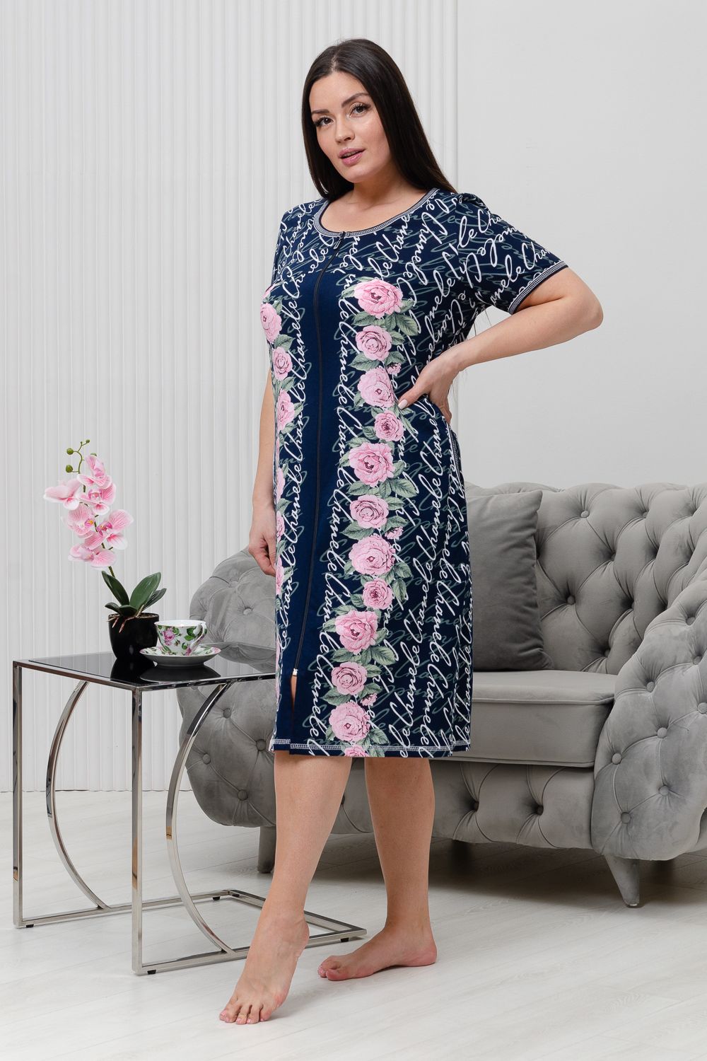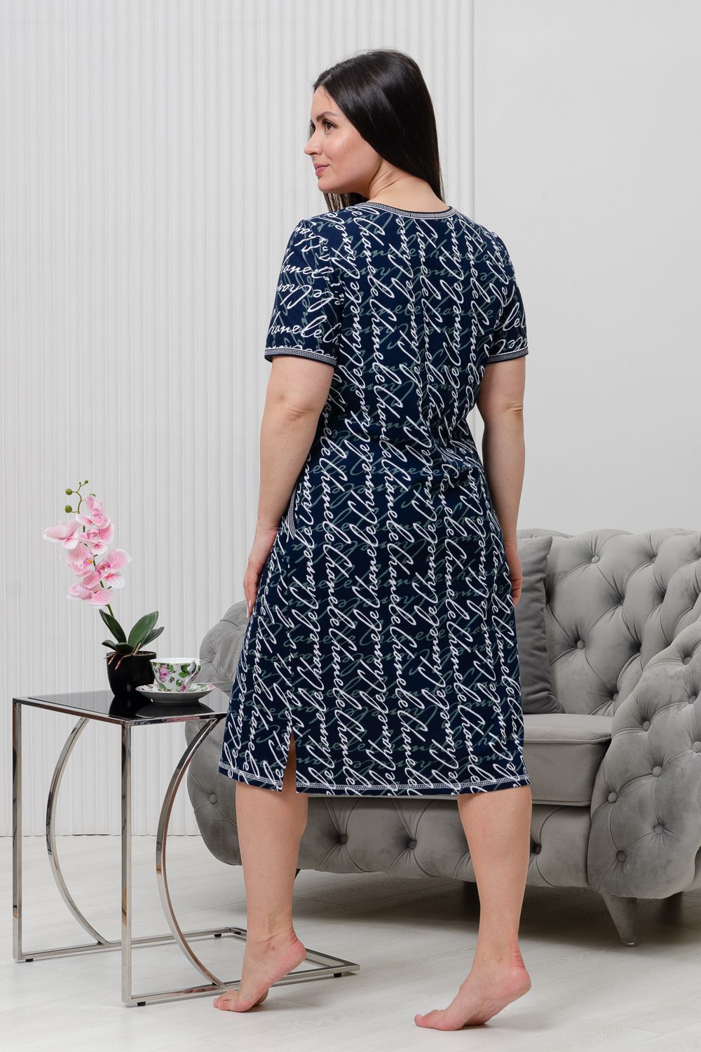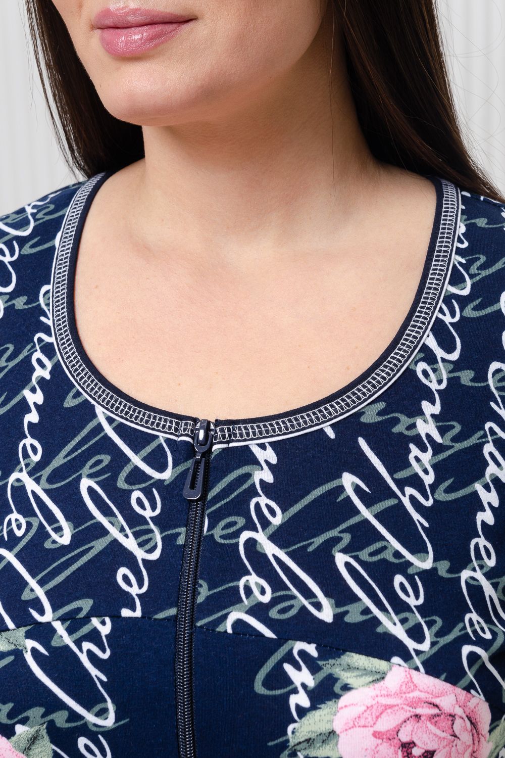 Халат на молнии, полуприлегающего силуэта, длиной ниже колена, с округлой горловиной, с боковыми карманами. Рукав втачной, короткий. В верхней части полочки расположены кокетки. С разрезами в нижней части боковых швов. Горловина, низ рукавов и карманы обработаны бейкой из отделочного полотна с белым кантом.