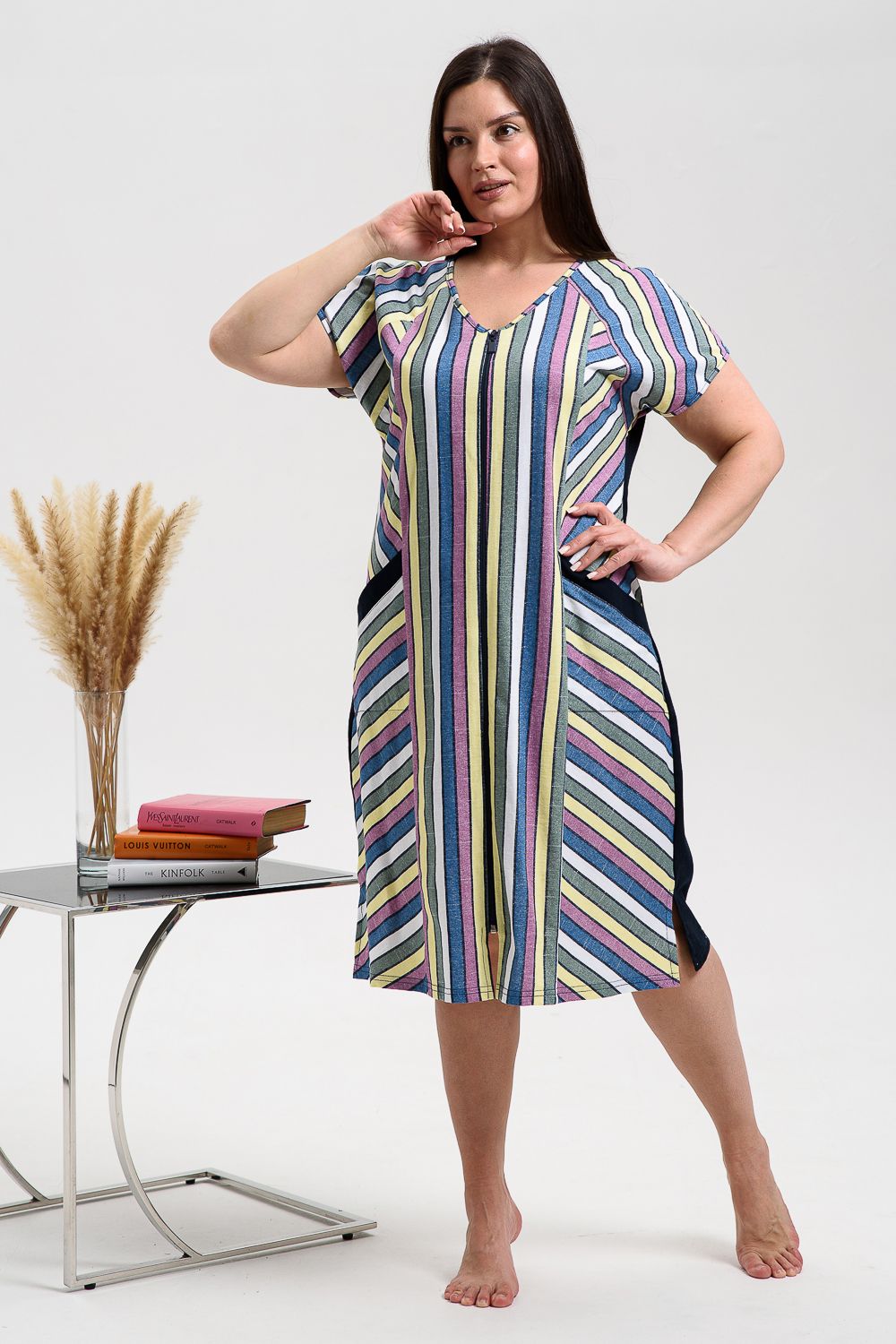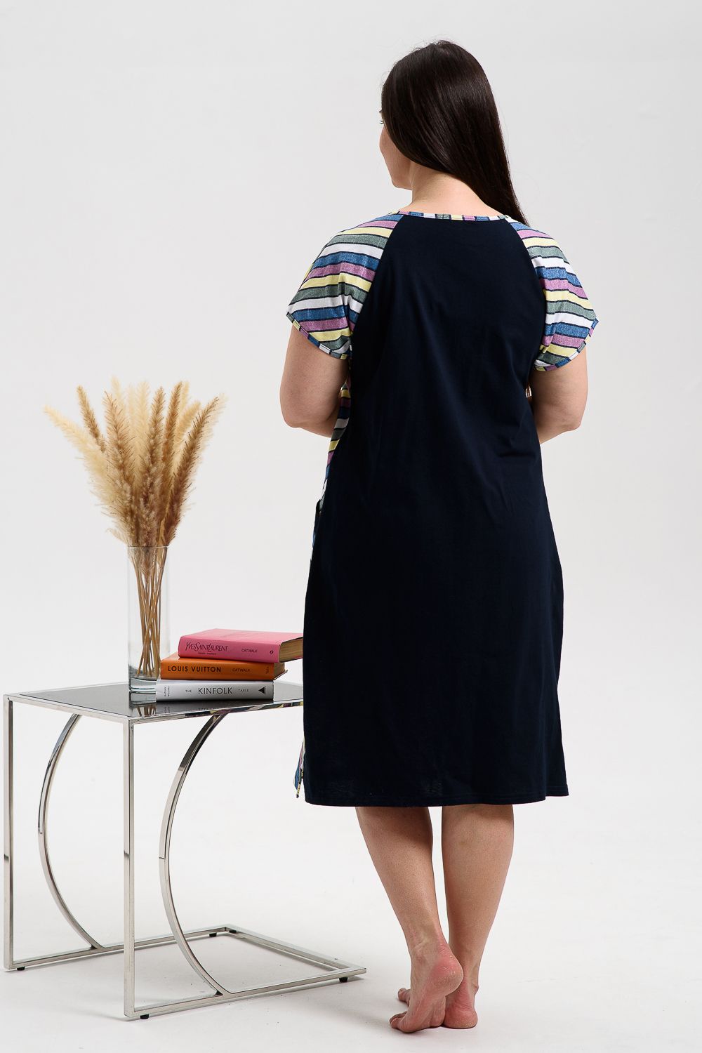 Халат с застежкой на молнию, полуприлегающего силуэта, длиной ниже колена, с V-образной горловиной, с накладными боковыми карманами. Рукав спущенный, короткий. В верхней части полочки расположены кокетки. Спинка из отделочного полотна, с кокетками. В нижней части боковых швов обработаны разрезы . Горловина, проймы обработаны бейкой из основного полотна.