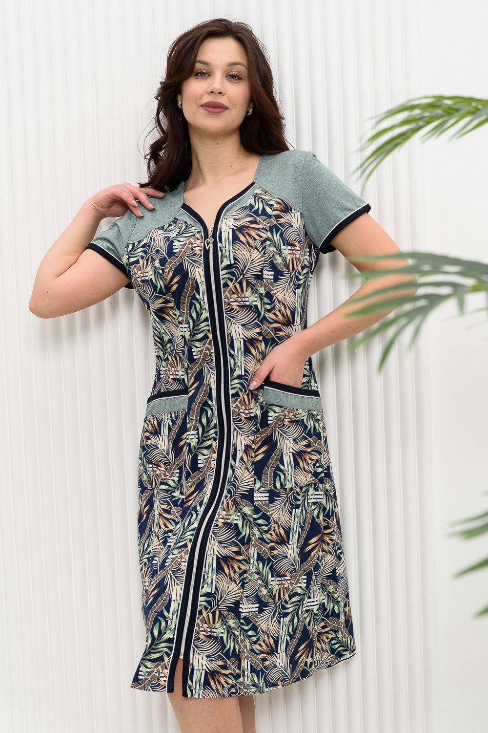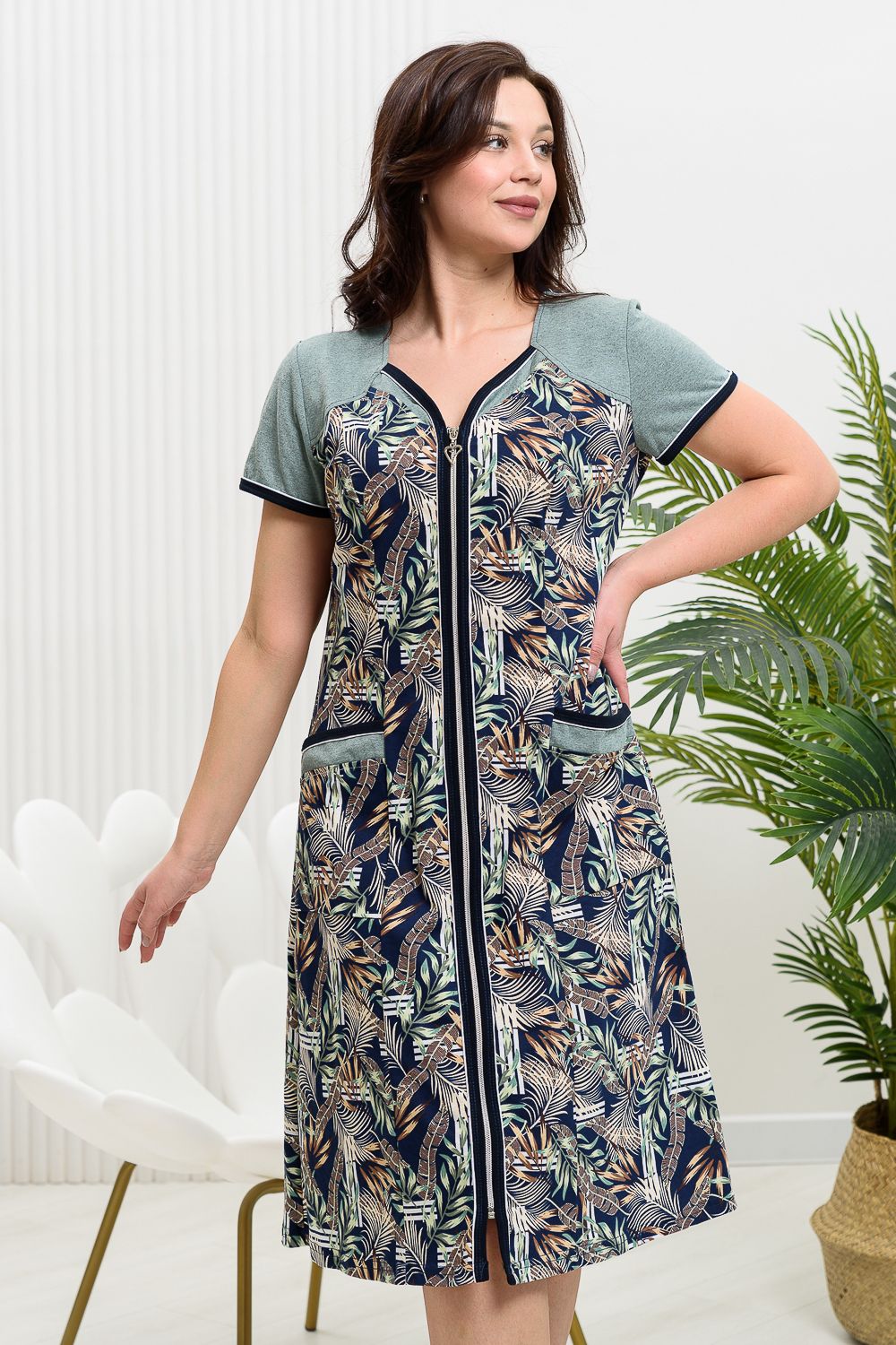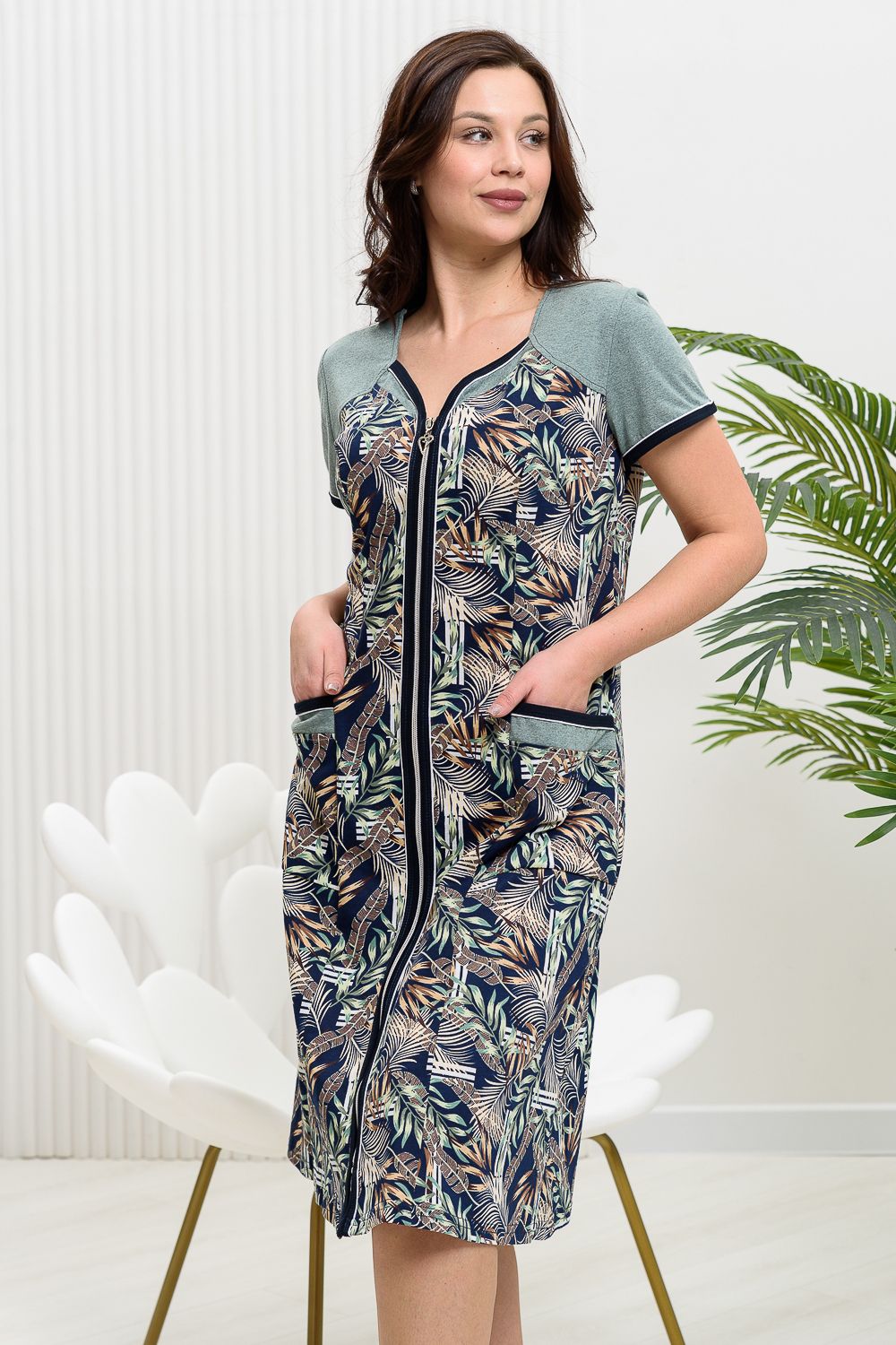 Халат полуприлегающего силуэта, слегка расширенный к низу. На полочке и спинке рельефы. Рукав втачной короткий. Застежка на тесьму- молнию. Горловина, борт, низ рукава и накладные карманы окантованы бейкой из контрастной ткани с белым кантом. Рукава, кокетки, декоративные детали полочки и карманов выполнены из отделочной ткани.