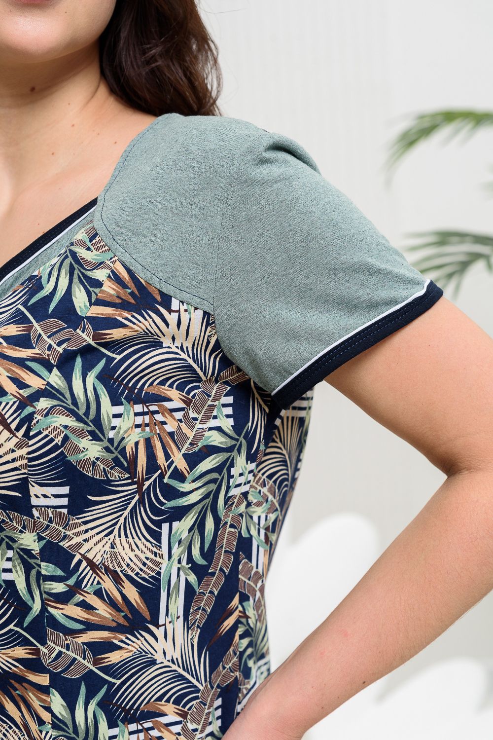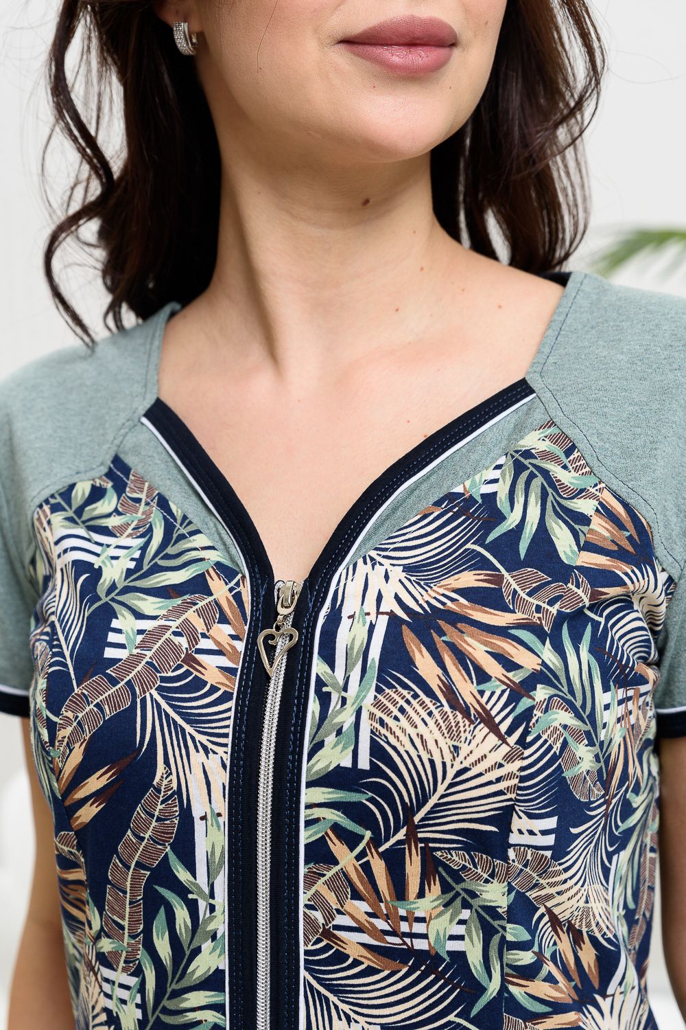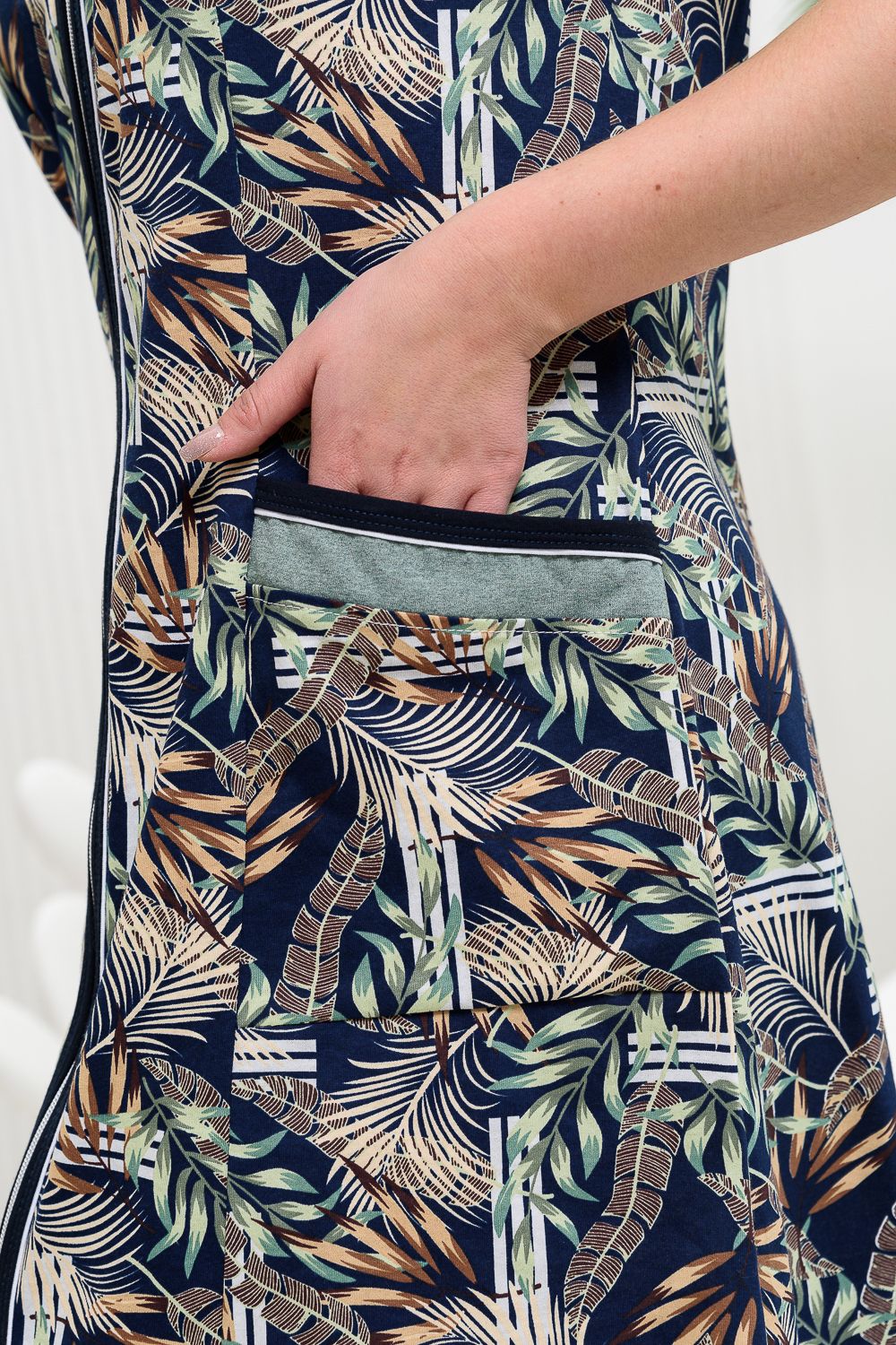 Халат полуприлегающего силуэта, слегка расширенный к низу. На полочке и спинке рельефы. Рукав втачной короткий. Застежка на тесьму- молнию. Горловина, борт, низ рукава и накладные карманы окантованы бейкой из контрастной ткани с белым кантом. Рукава, кокетки, декоративные детали полочки и карманов выполнены из отделочной ткани.