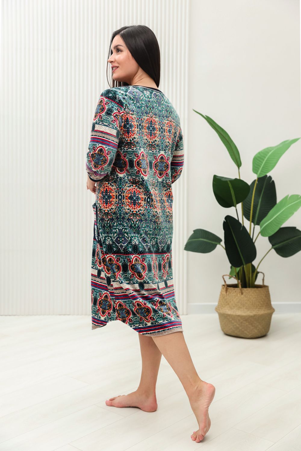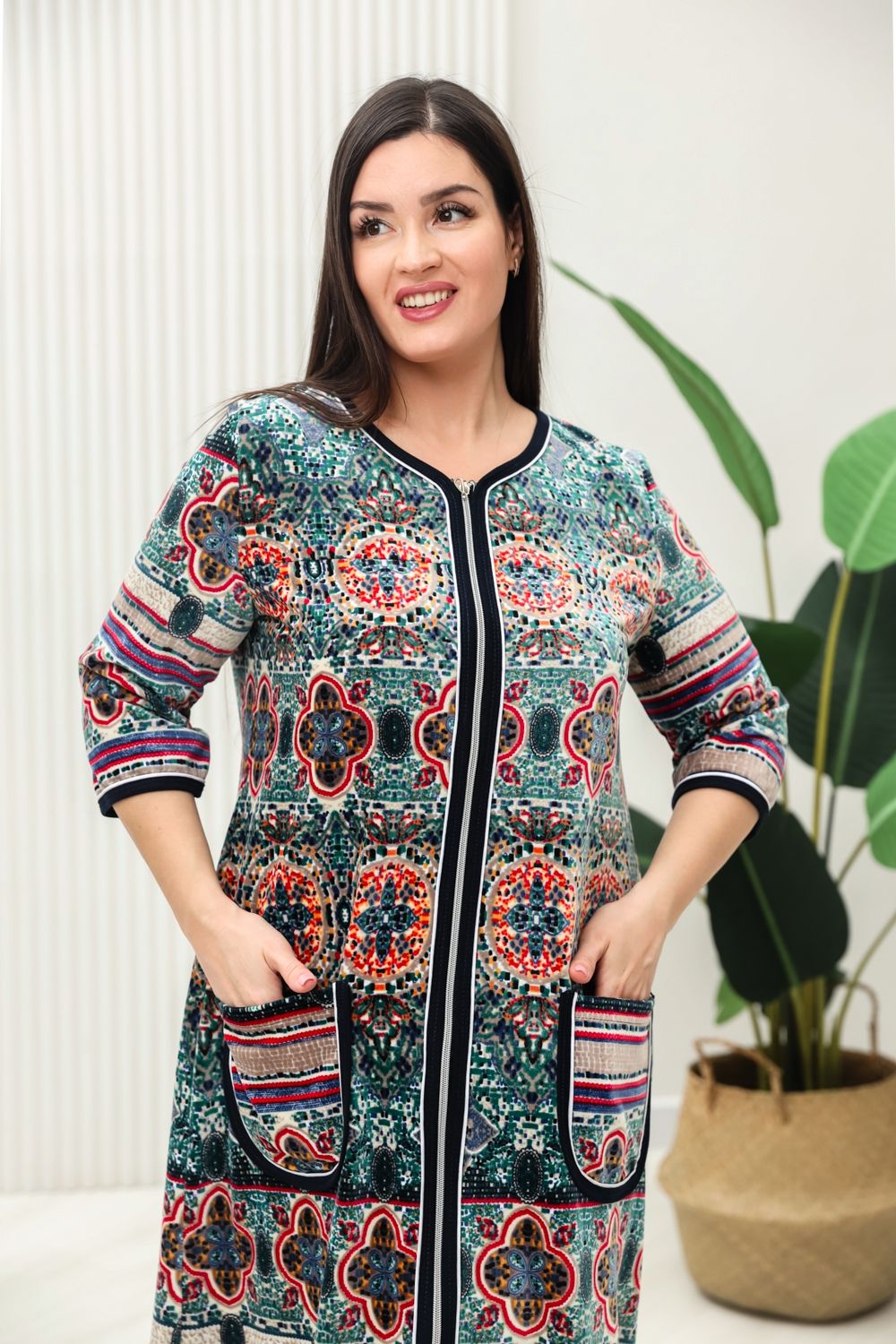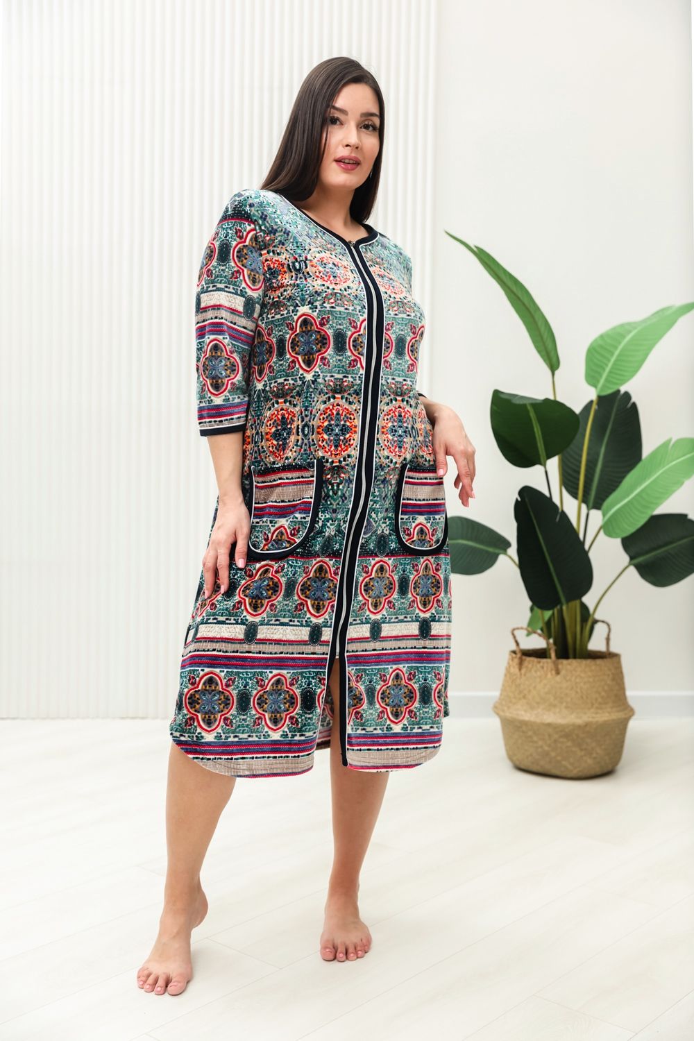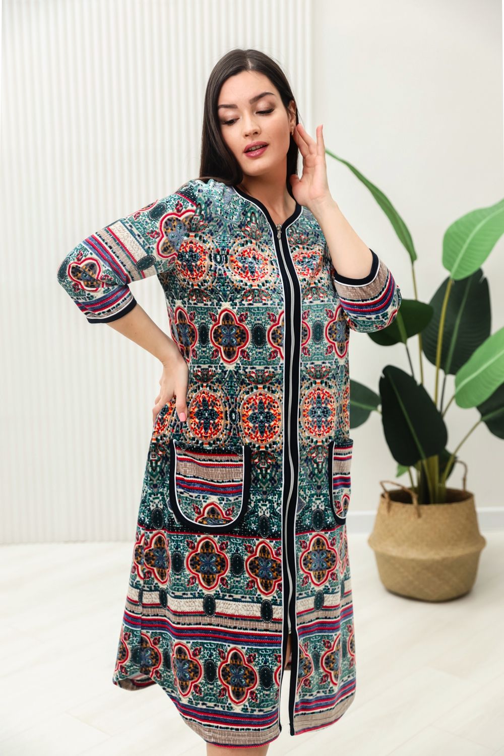 Халат женский полуприлегающий, расширенный к низу. Рукав втачной, 3/4. Застежка на тесьму-молнию. На полочке накладные карманы. Край борта, низ рукавов, карманы окантованы контрастной бейкой с белым кантом.