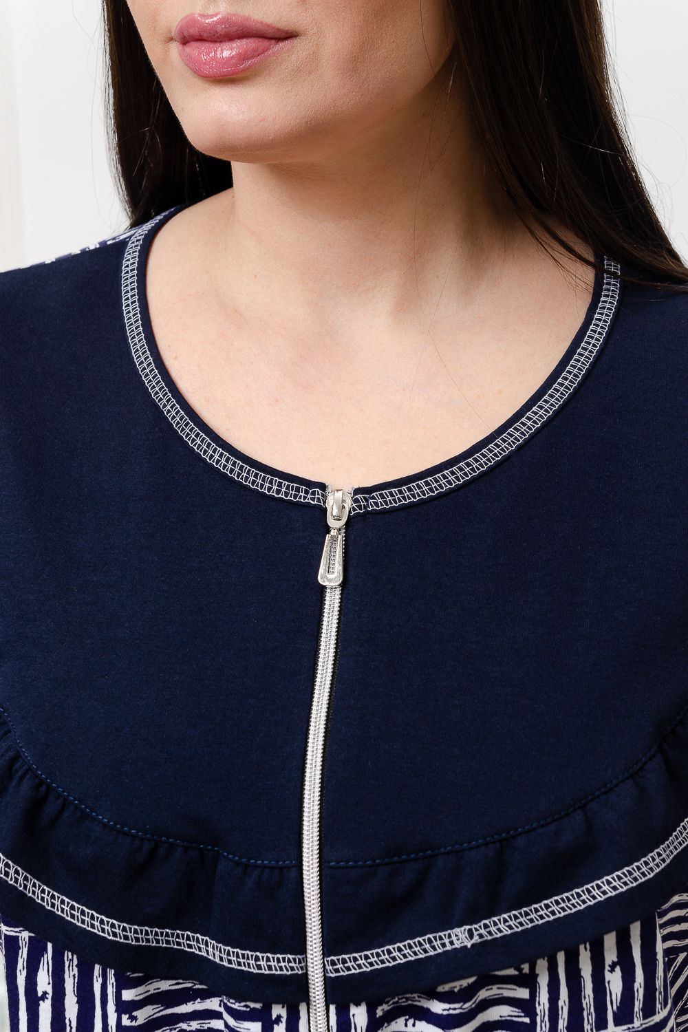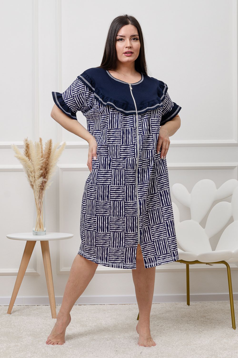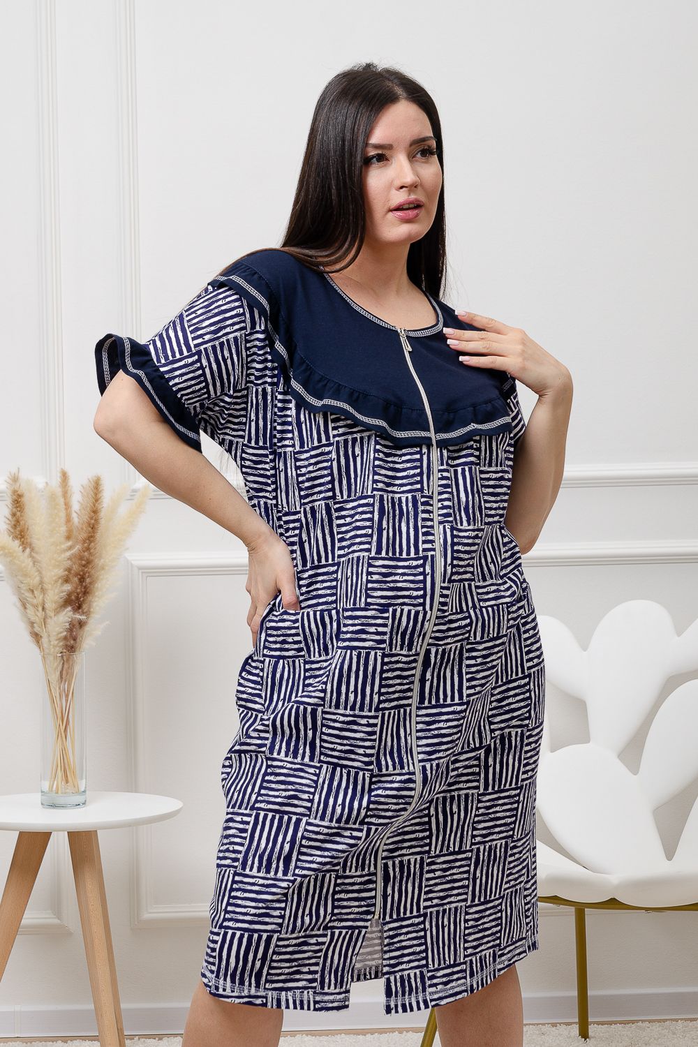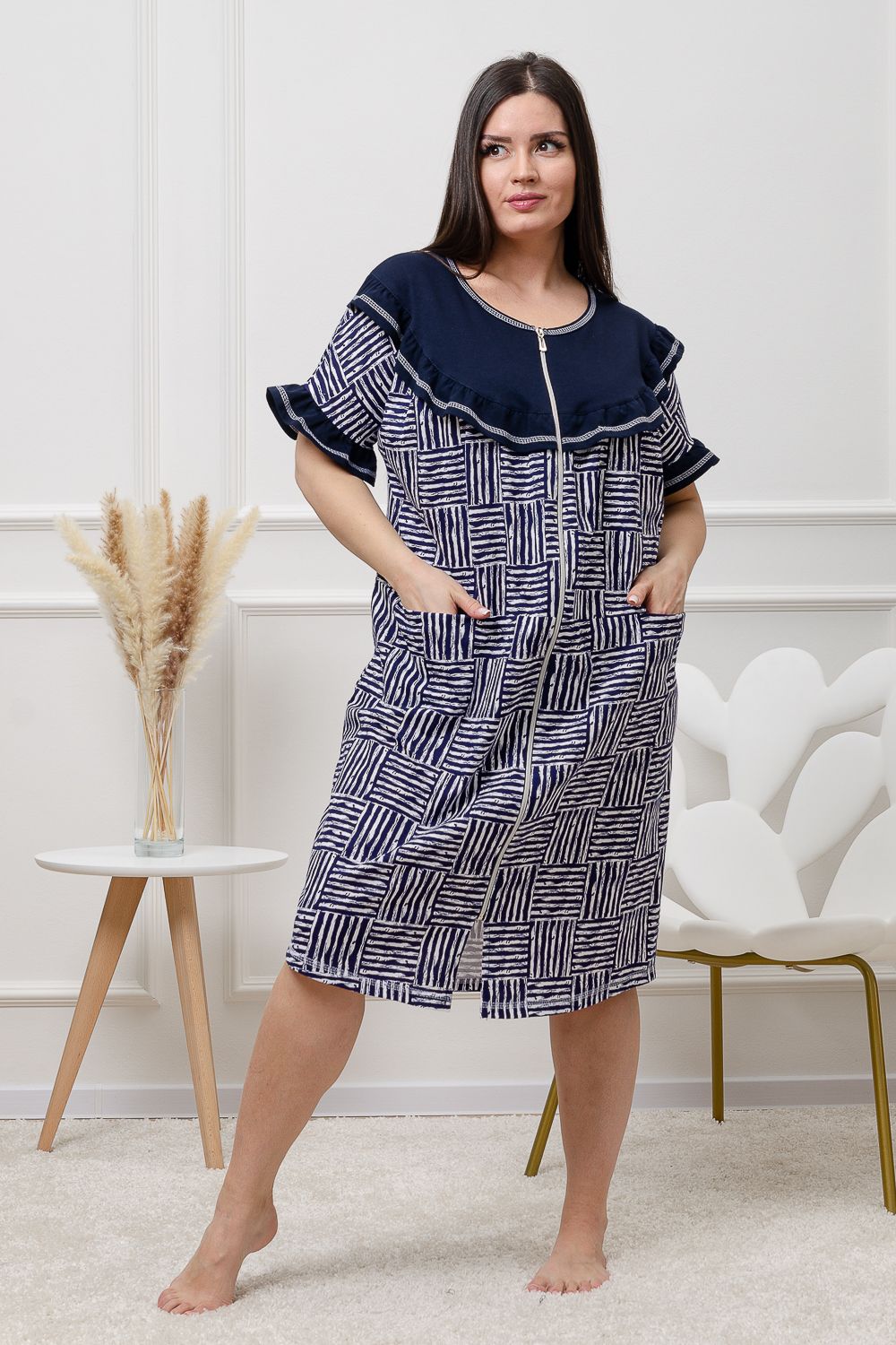 Халат женский, полуприлегающего силуэта , горловина округлая, застежка на тесьму-молнию. На полочке кокетка с рюшей, также рюша внизу цельнокроенного короткого рукава из отделочной ткани. Внутренние горизонтальные карманы в шве стачивания верхней и нижней части полочки.