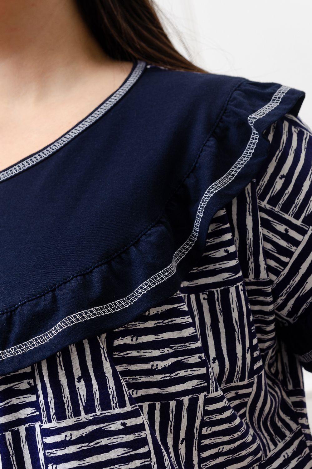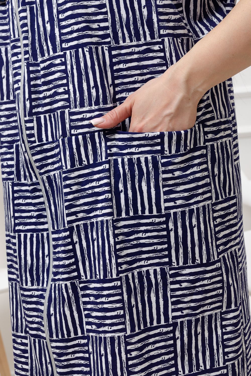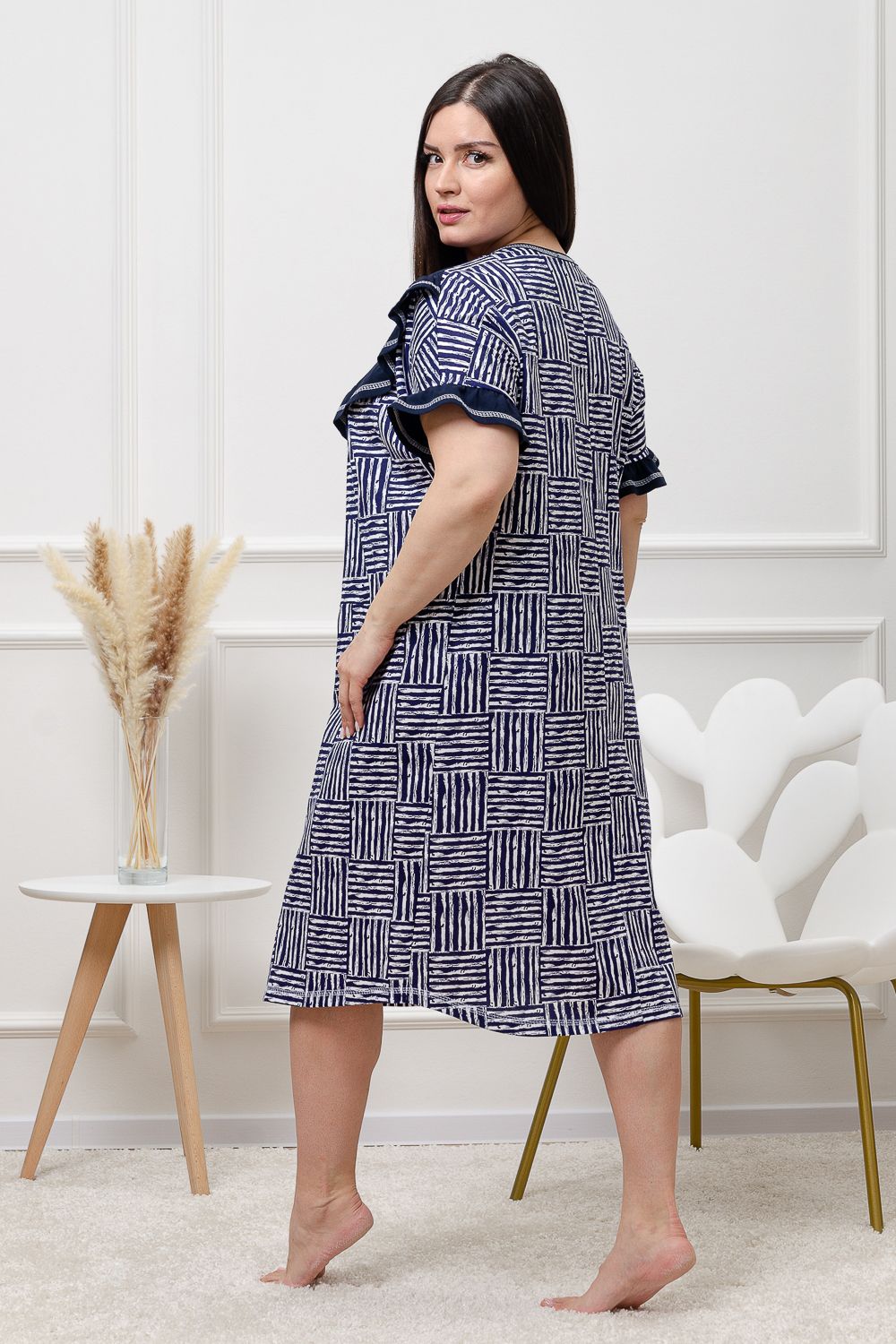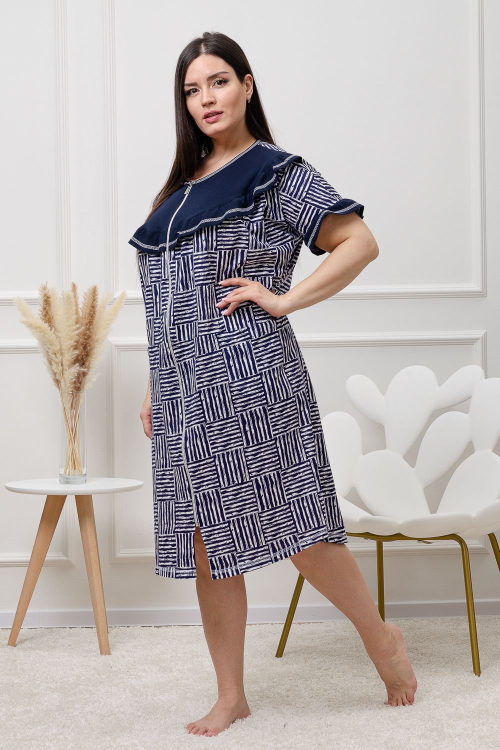Халат женский, полуприлегающего силуэта , горловина округлая, застежка на тесьму-молнию. На полочке кокетка с рюшей, также рюша внизу цельнокроенного короткого рукава из отделочной ткани. Внутренние горизонтальные карманы в шве стачивания верхней и нижней части полочки.