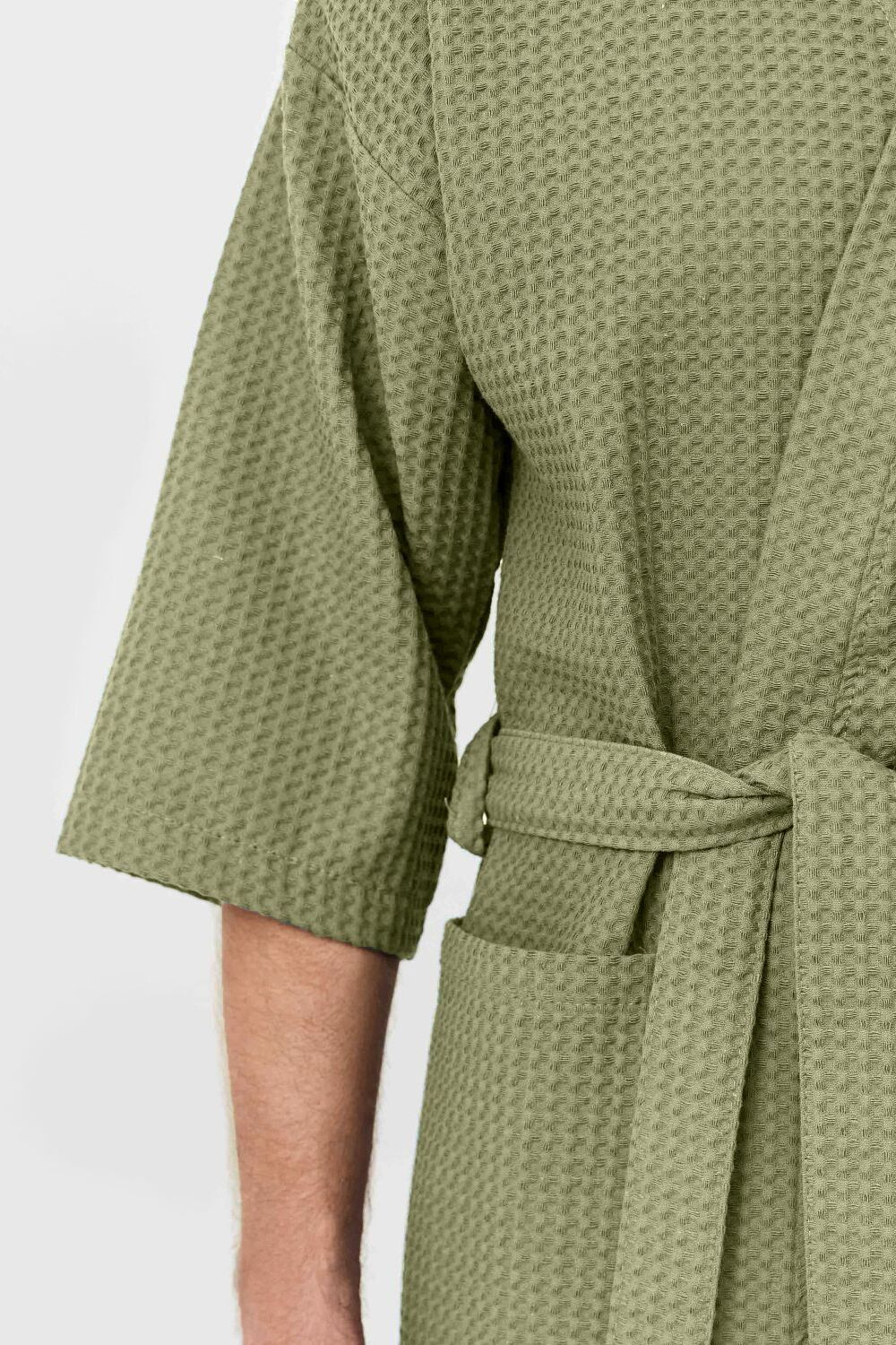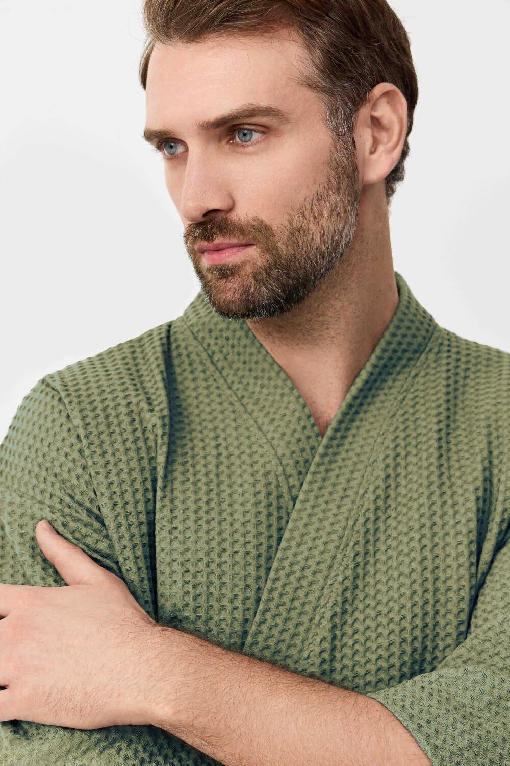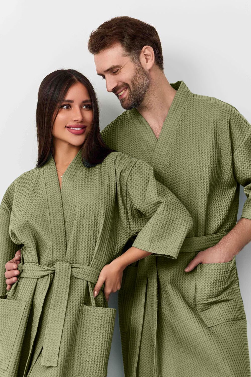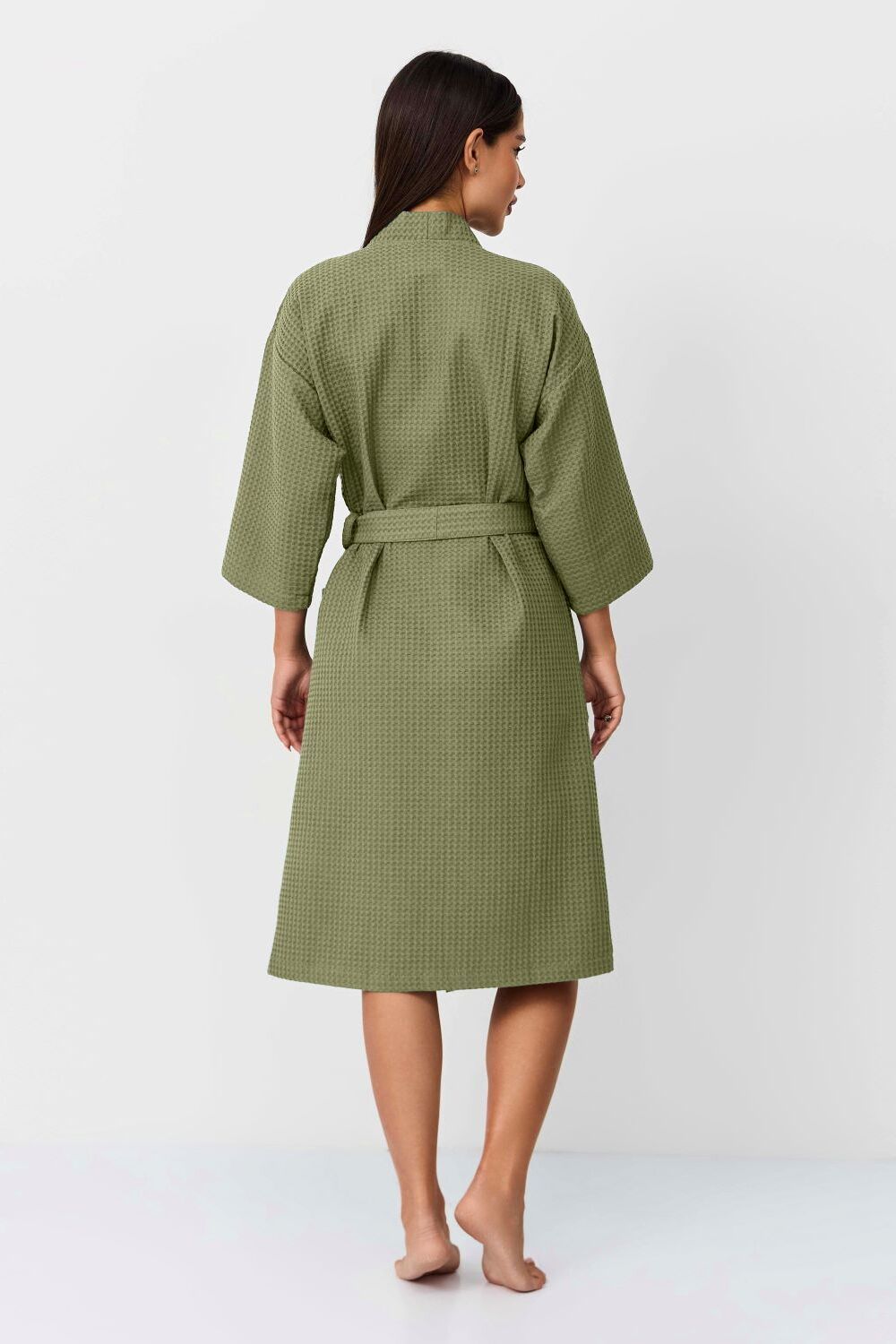 Вафельный халат-кимоно. Рукав 3/4. Карманы накладные. Воротник планка. Размерный ряд от 44/46 до 64/66. Плотность вафельного полотна 242 гр.