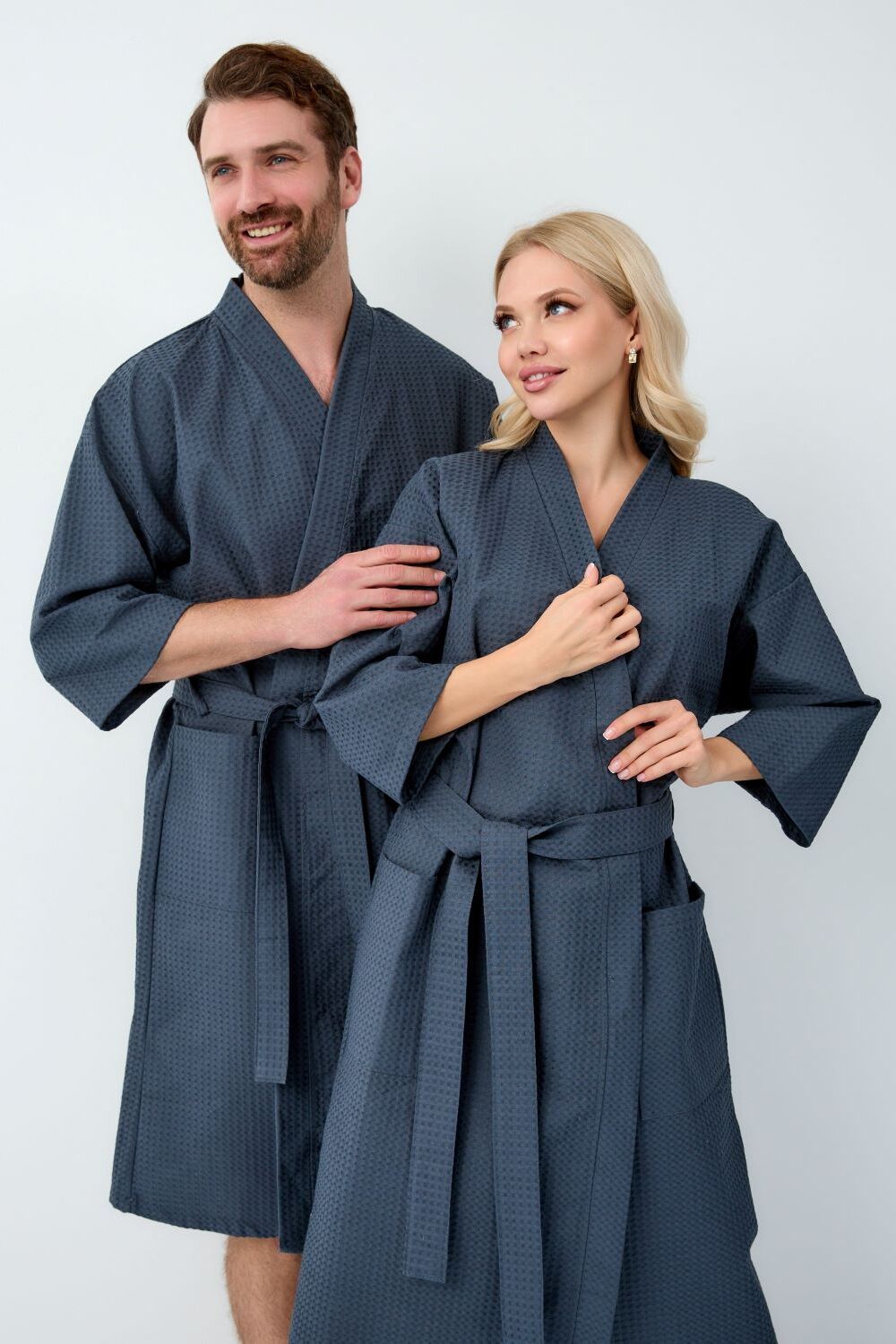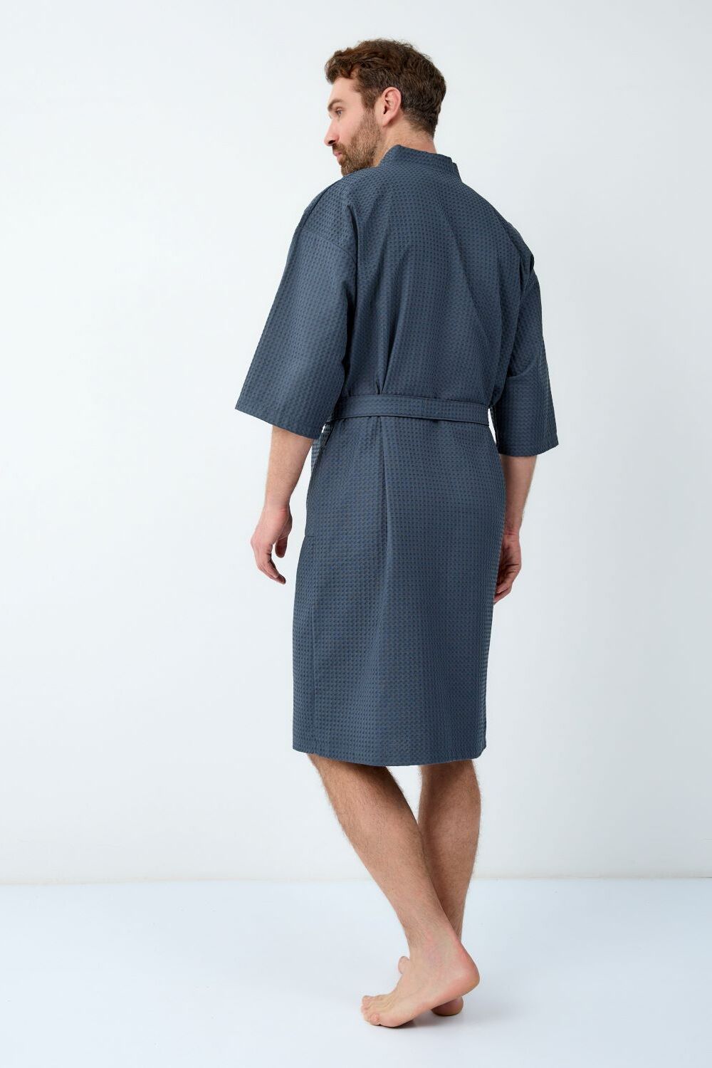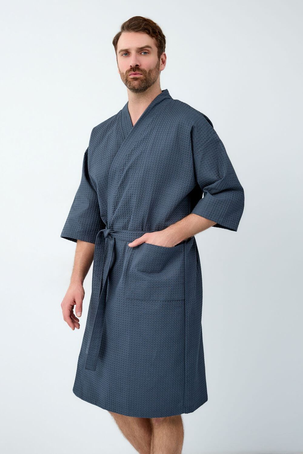 Вафельный халат-кимоно. Рукав 3/4. Карманы накладные. Воротник планка. Размерный ряд от 44/46 до 64/66. Плотность вафельного полотна 242 гр.