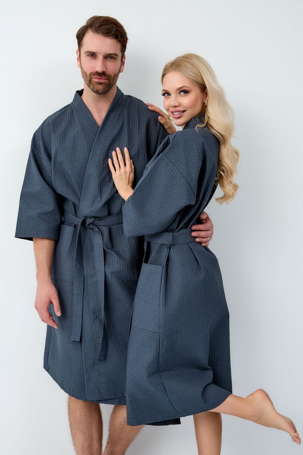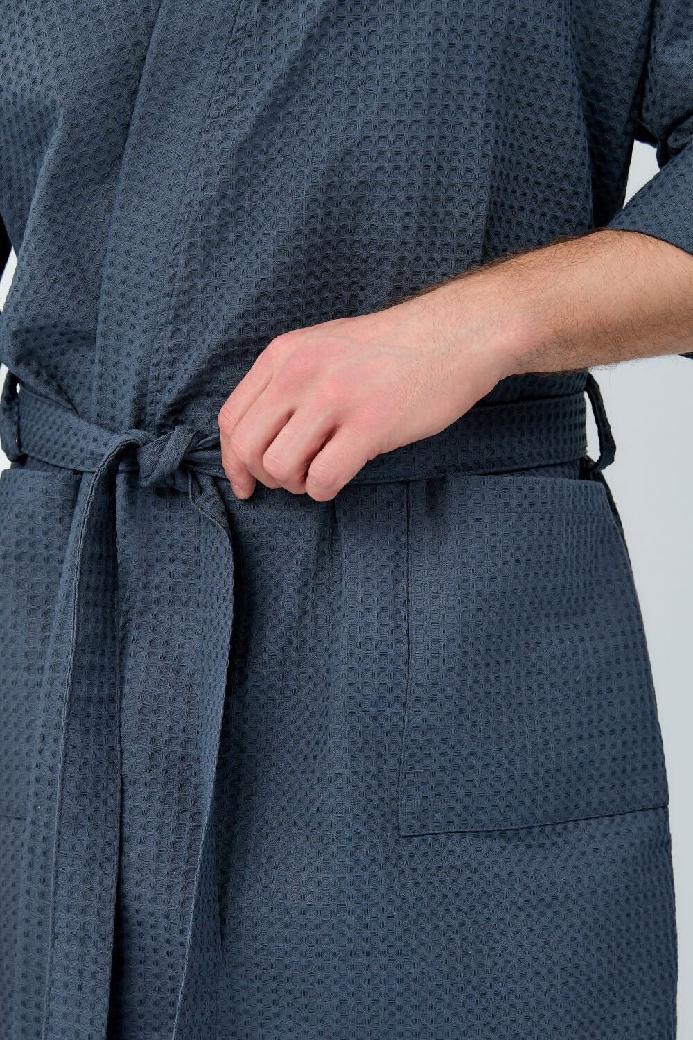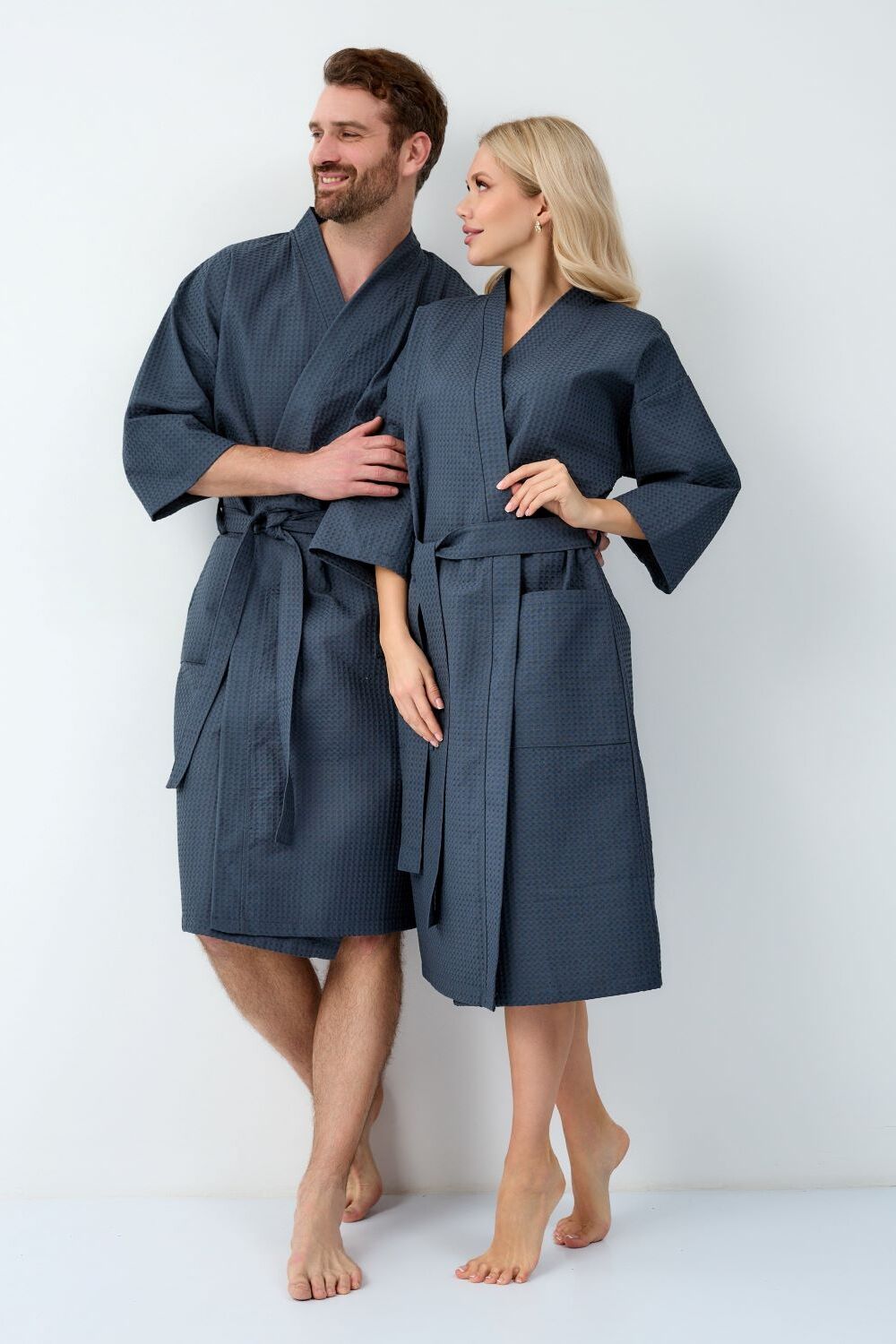 Вафельный халат-кимоно. Рукав 3/4. Карманы накладные. Воротник планка. Размерный ряд от 44/46 до 64/66. Плотность вафельного полотна 242 гр.
