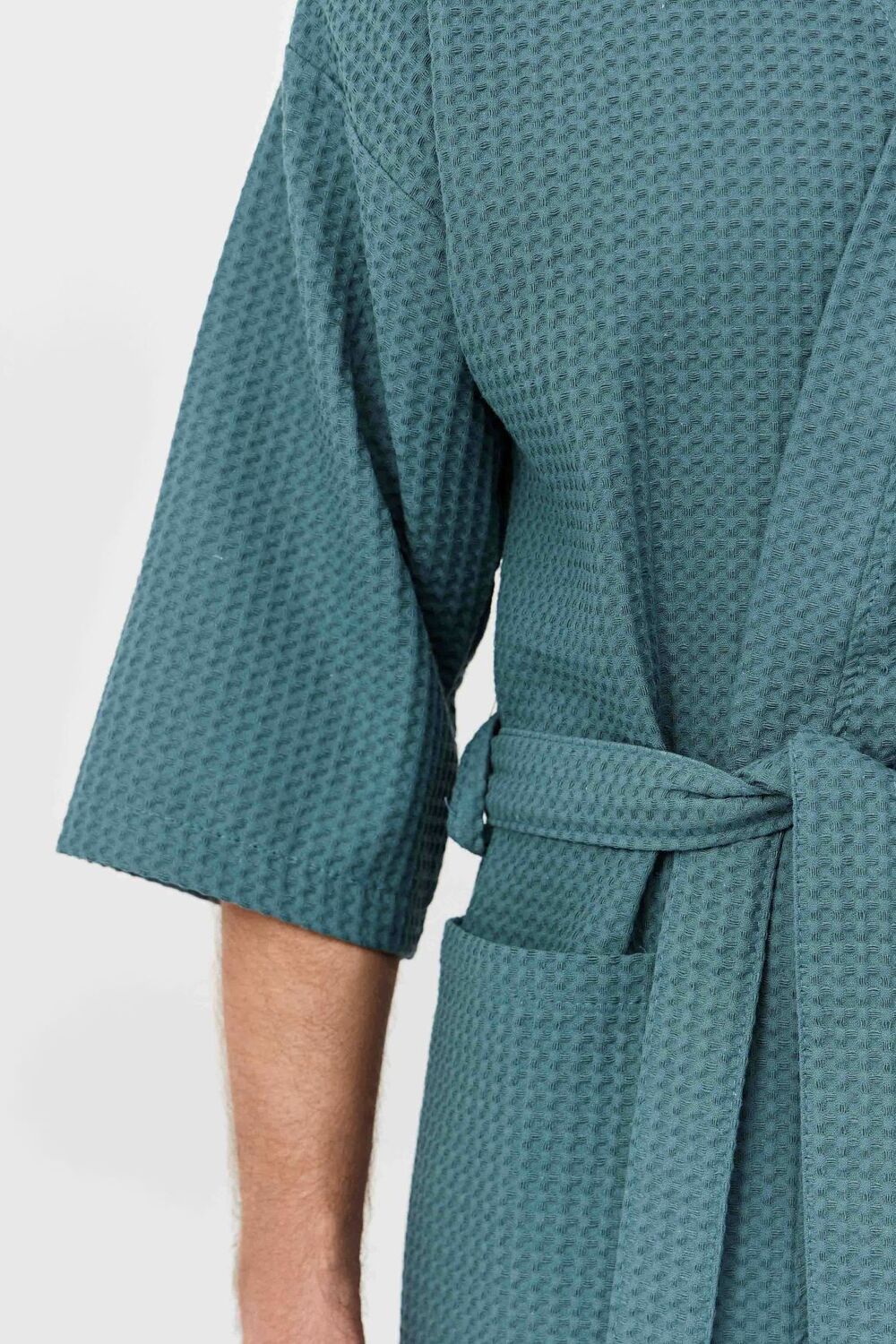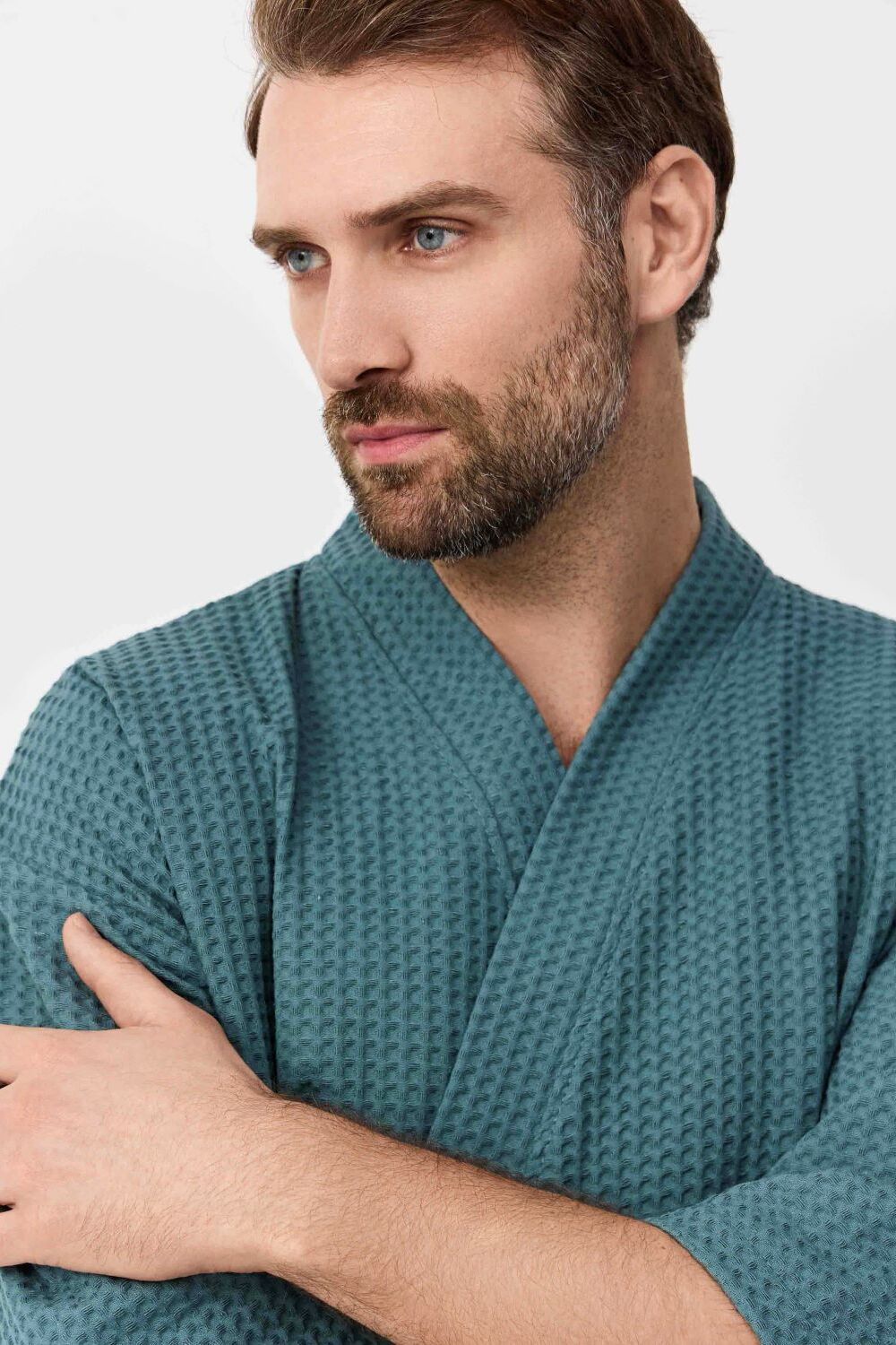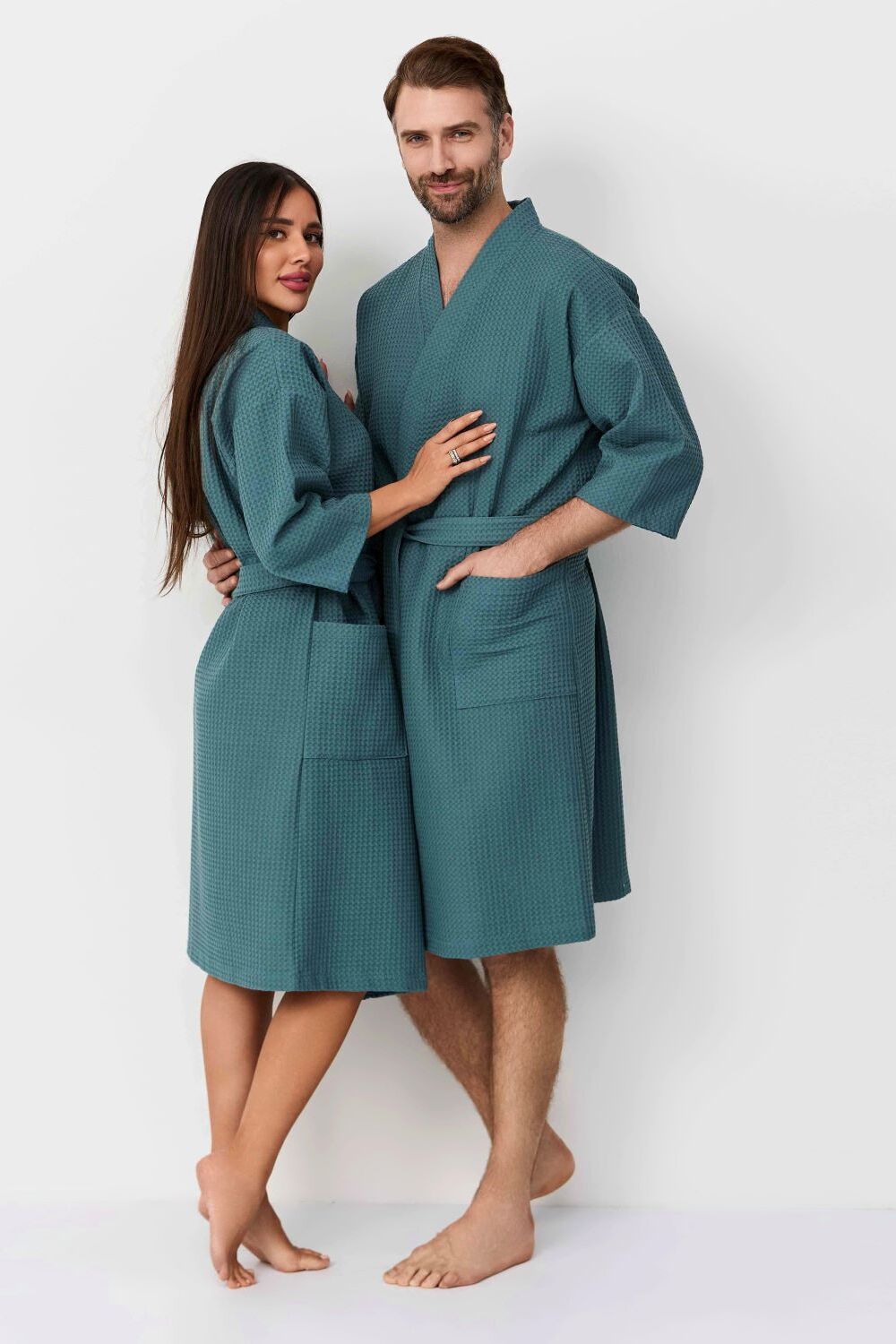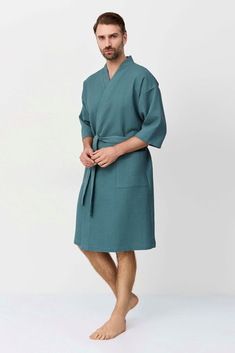 Вафельный халат-кимоно. Рукав 3/4. Карманы накладные. Воротник планка. Размерный ряд от 44/46 до 64/66. Плотность вафельного полотна 242 гр.