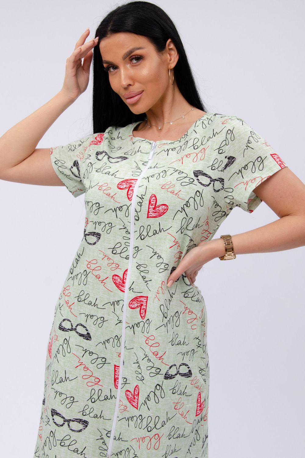 Женский халат на молнии. Рукав короткий. Красивый вырез на полочке. Халат прекрасно подойдет для дома, дачи и отдыха.