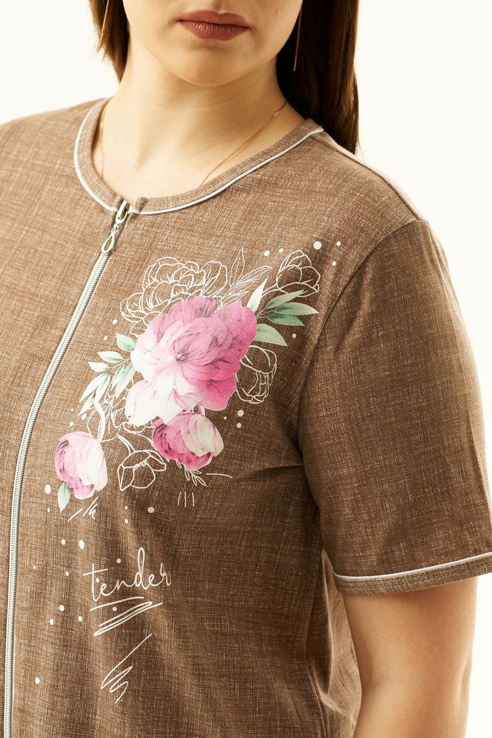 Халат женский полуприлегающего силуэта на молнии, с круглым вырезом горловины. Полочку изделия украшает цветочный принт, расположенный на груди и снизу изделия. Рукав короткий, втачной.