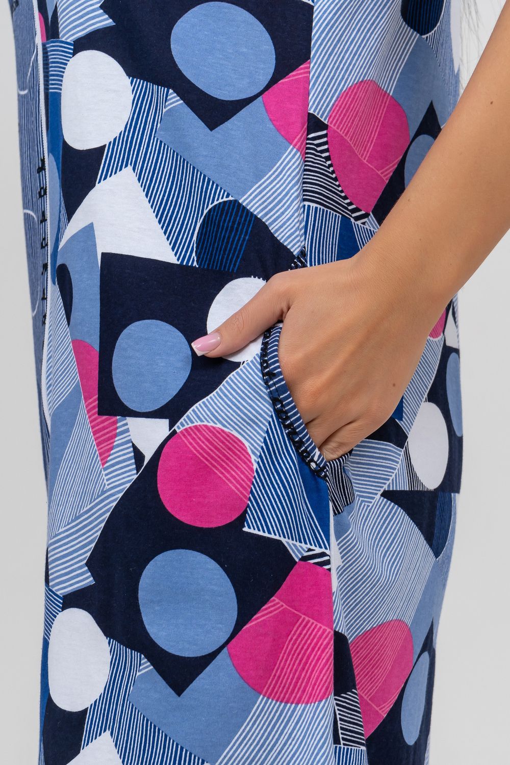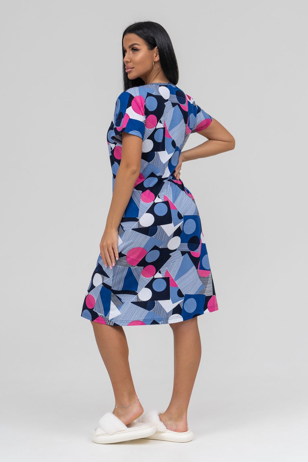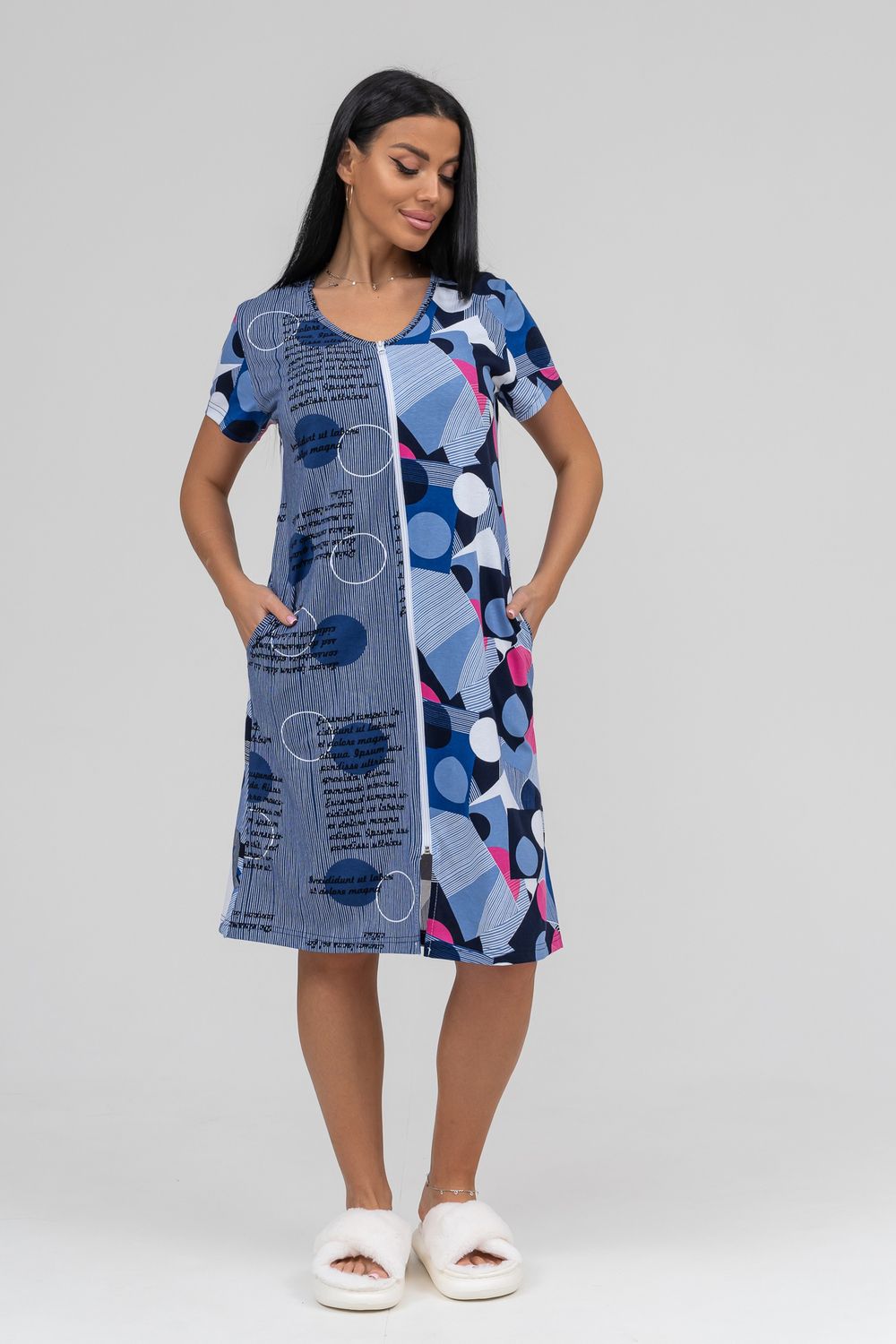 Халат женский с коротким рукавом на молнии, в боковых швах карманы.
