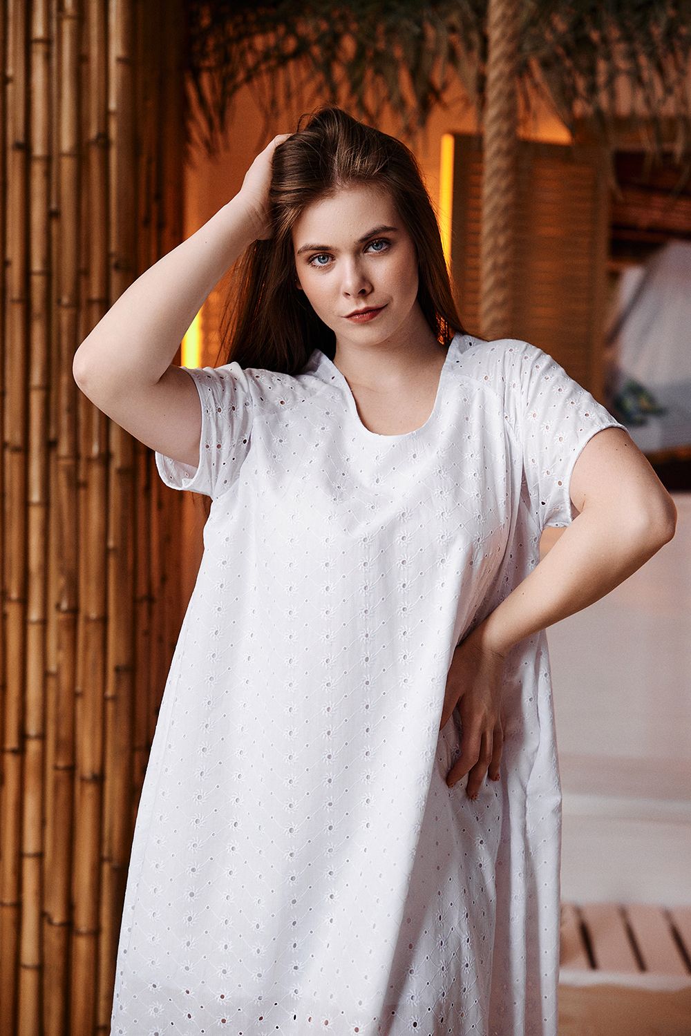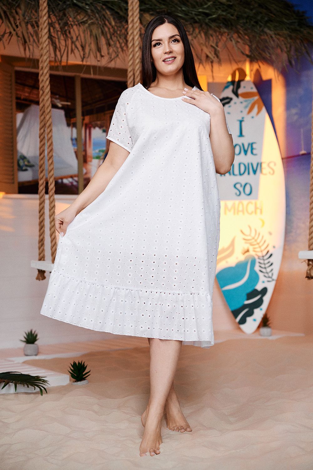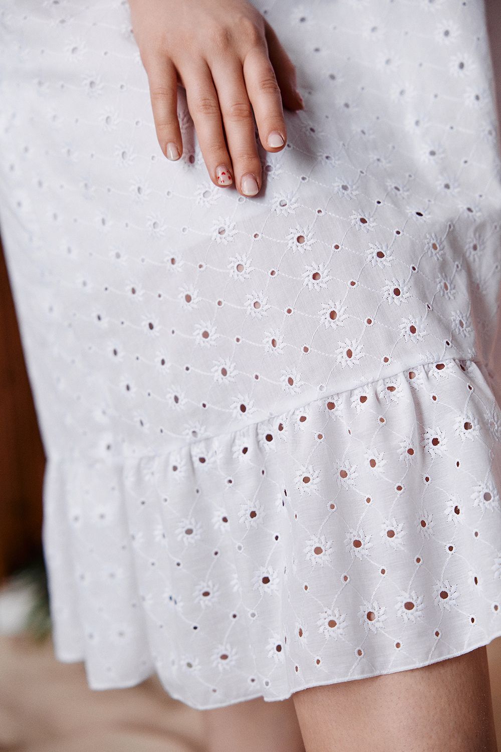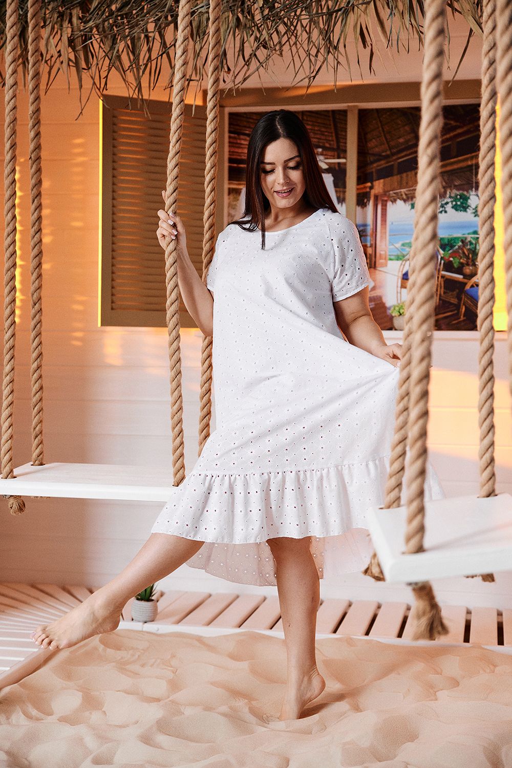Платье женское, свободное, расширенное к низу, на подкладке. Рукав реглан, короткий. Горловина округлая, внизу платья широкая рюша, в боковых швах внутренние карманы.
