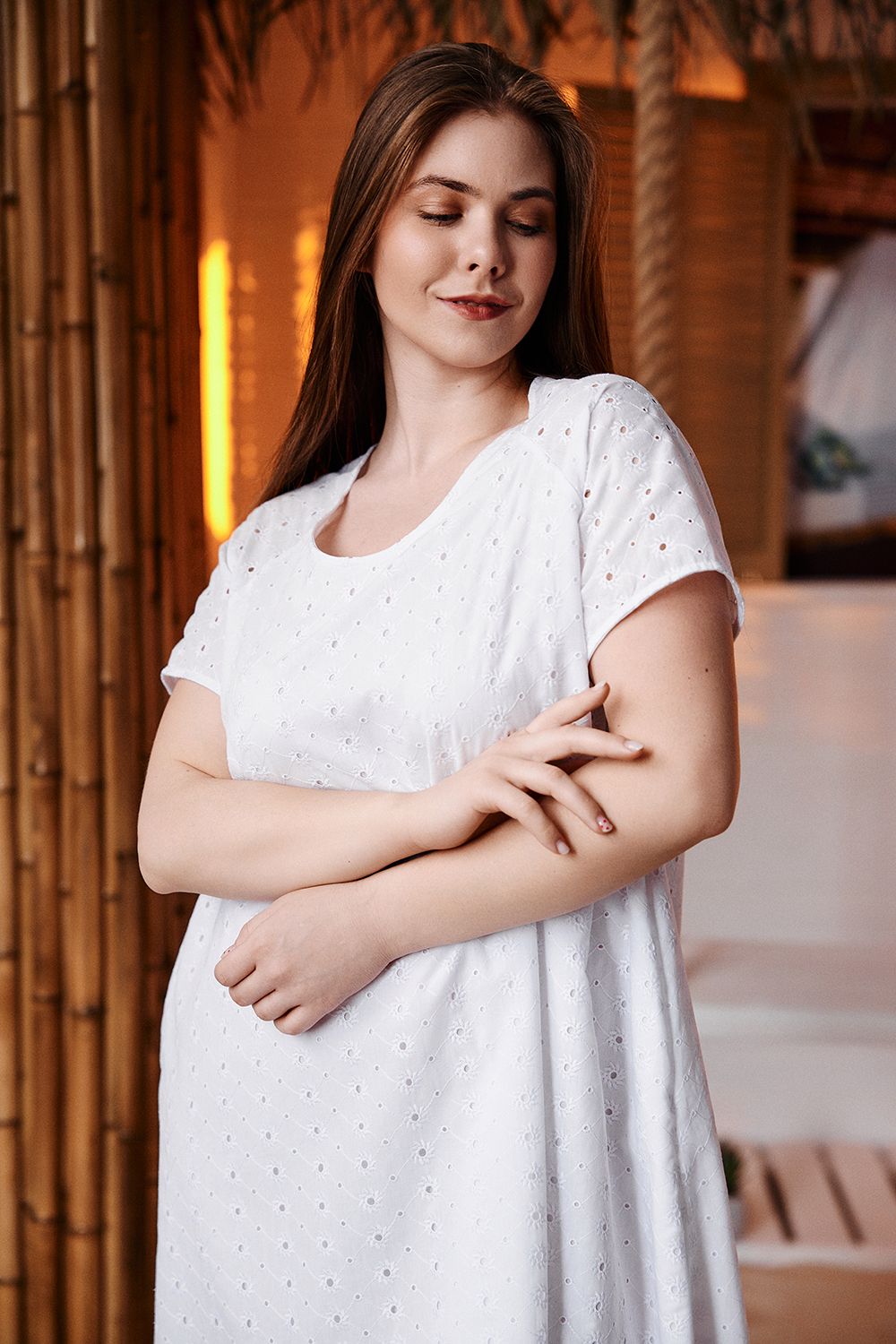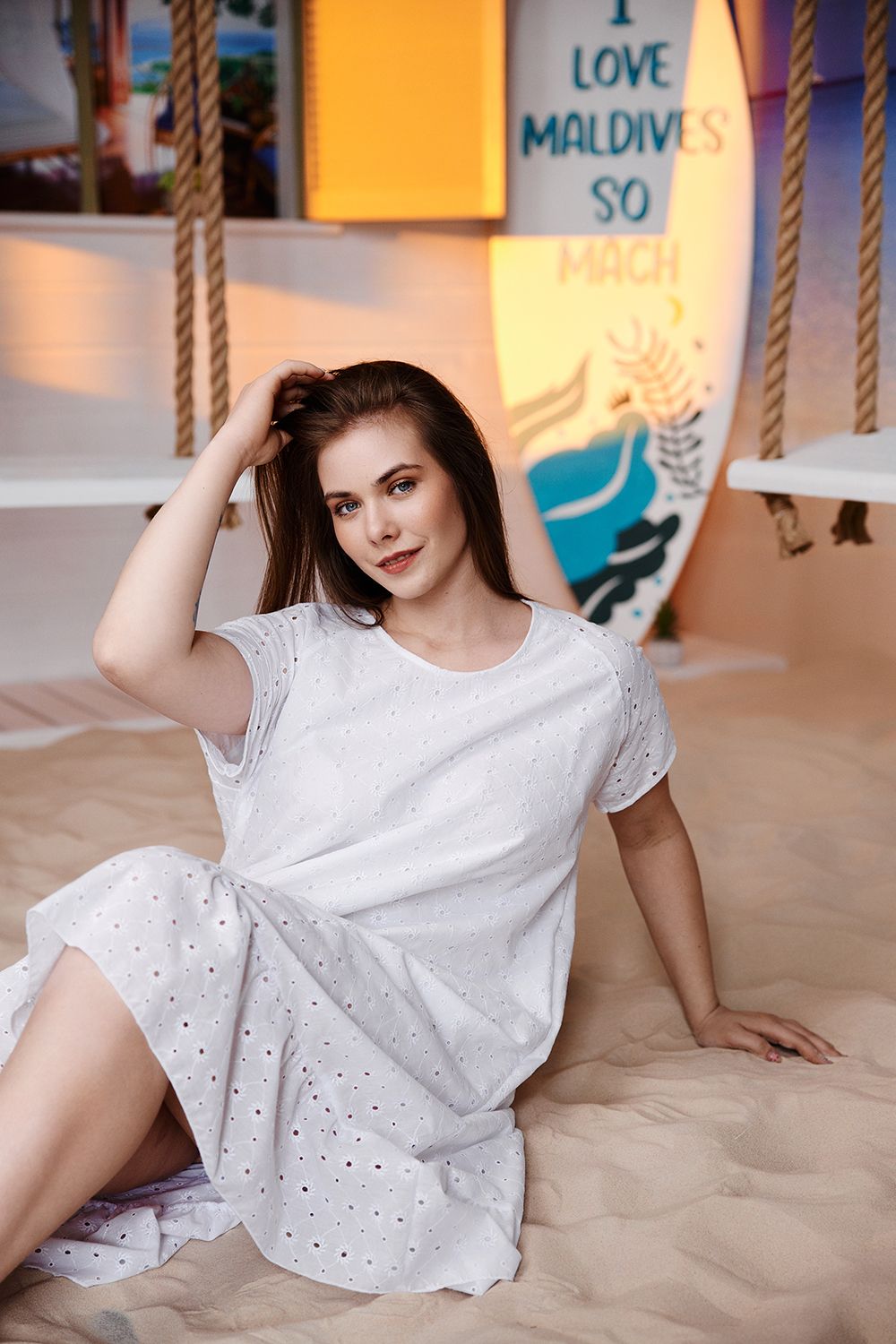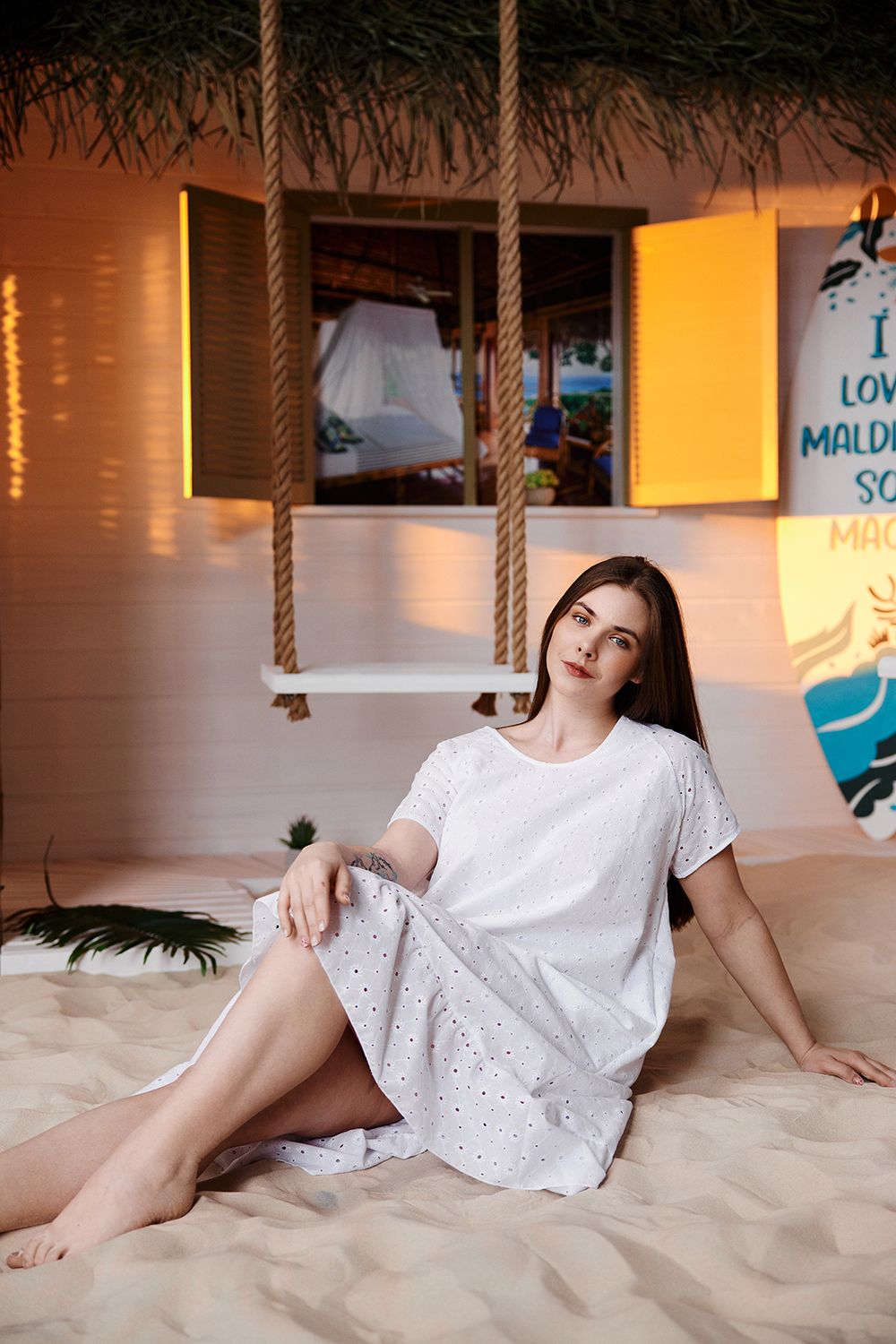 Платье женское, свободное, расширенное к низу, на подкладке. Рукав реглан, короткий. Горловина округлая, внизу платья широкая рюша, в боковых швах внутренние карманы.