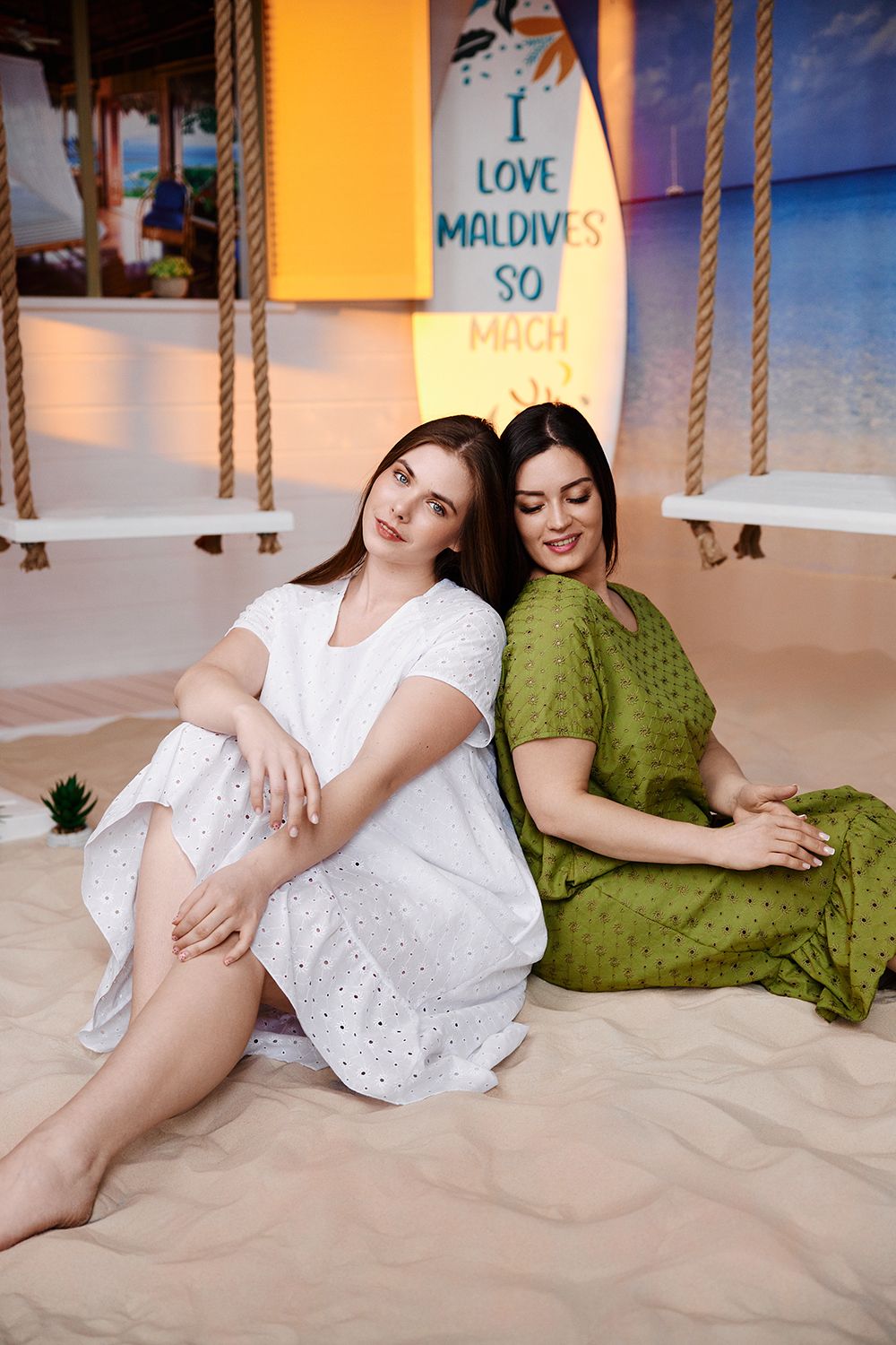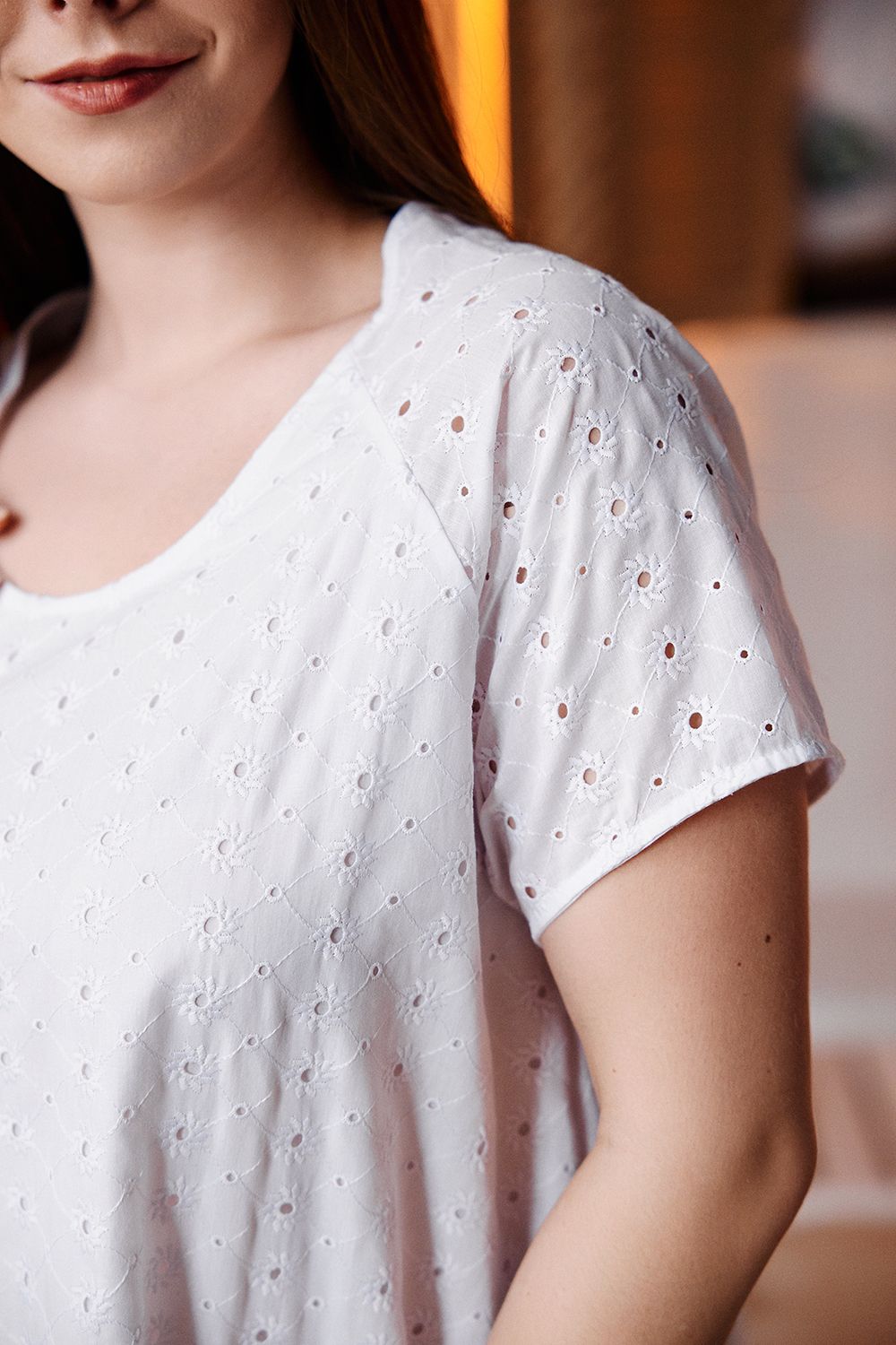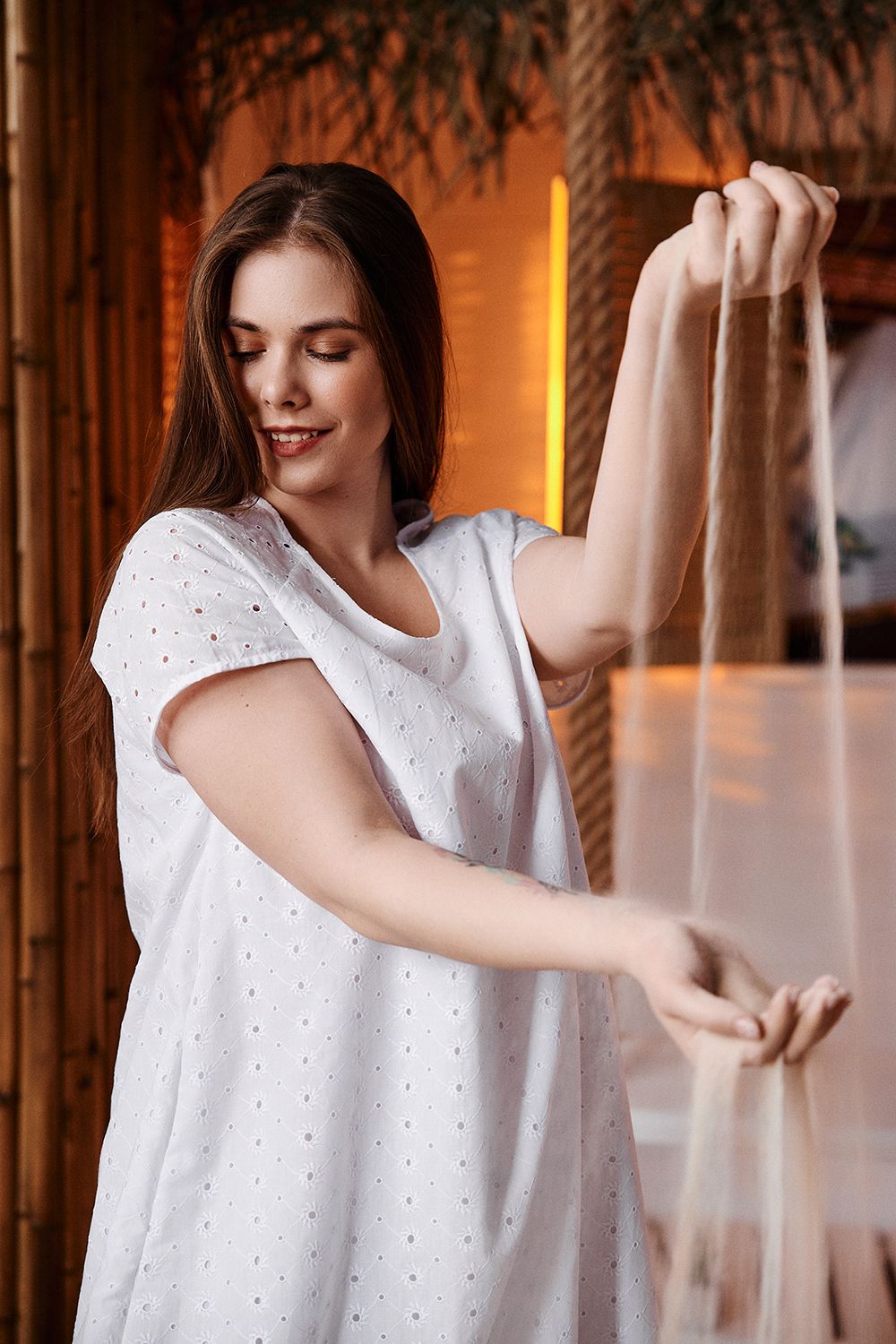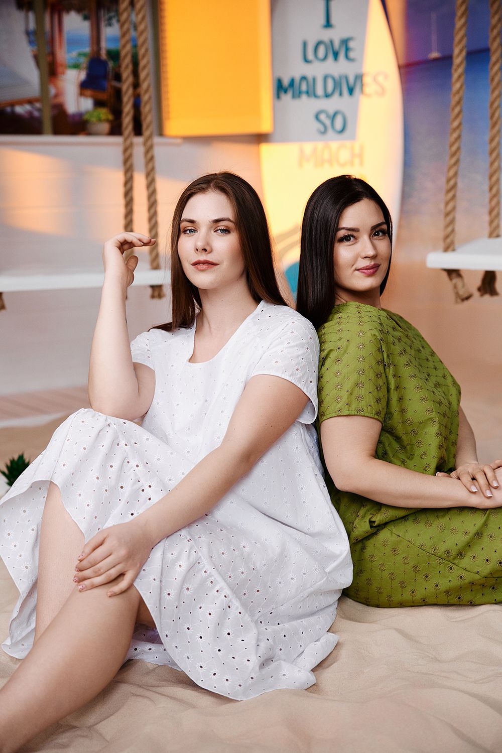 Платье женское, свободное, расширенное к низу, на подкладке. Рукав реглан, короткий. Горловина округлая, внизу платья широкая рюша, в боковых швах внутренние карманы.