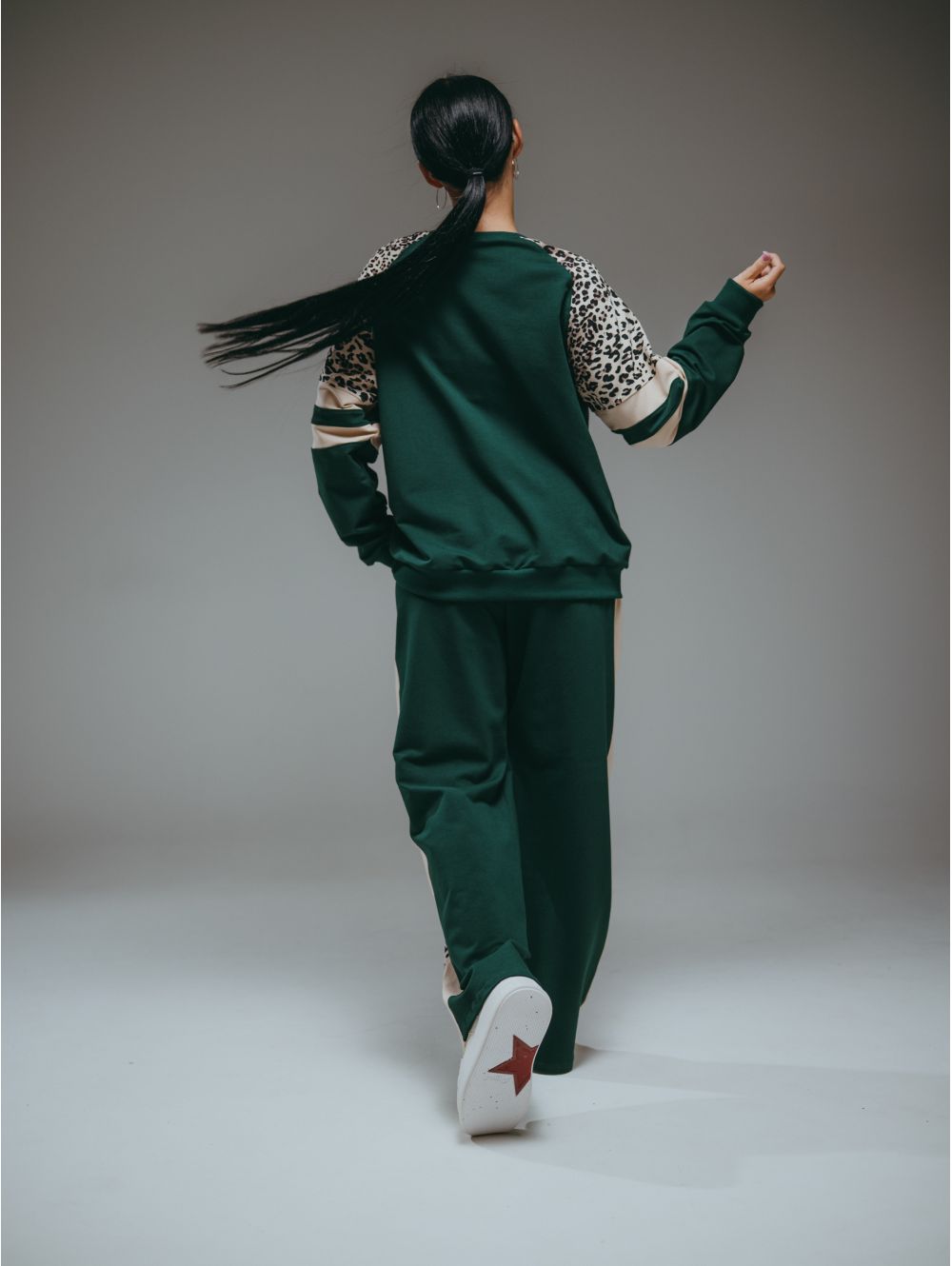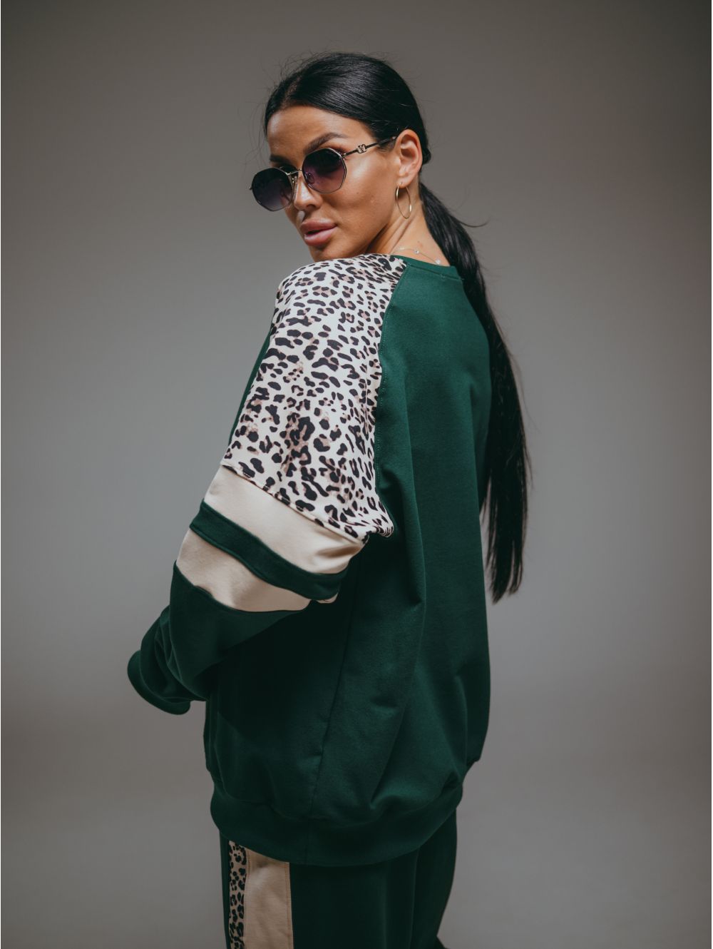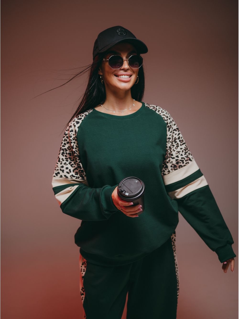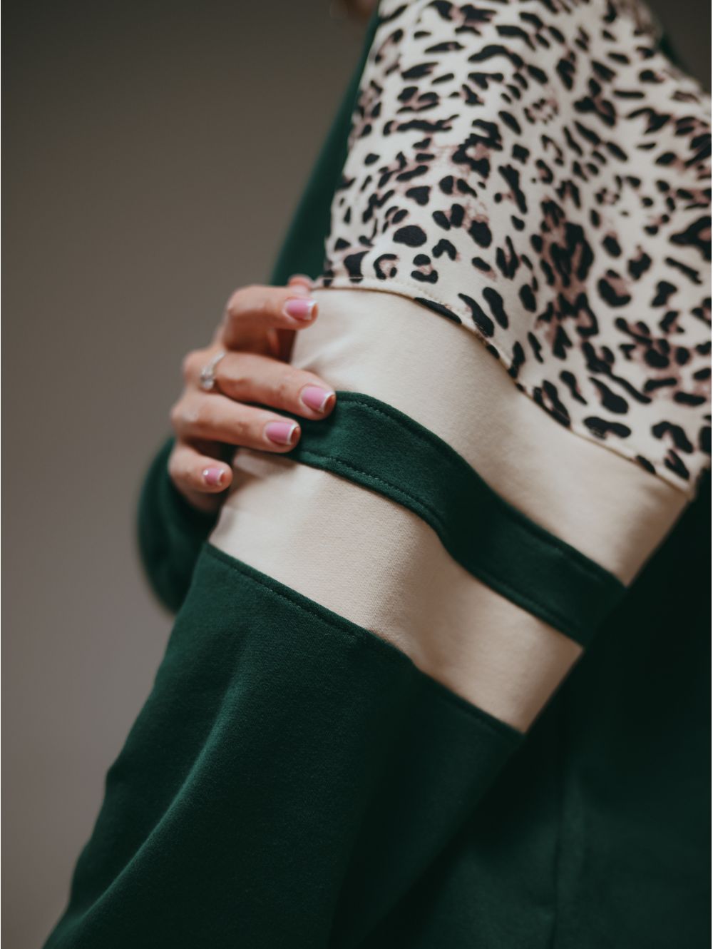 Модный дизайн свитшота: Рукав реглан обеспечивает свободу движений, а леопардовые вставки — это трендовый акцент, который легко комбинируется с базовым гардеробом.