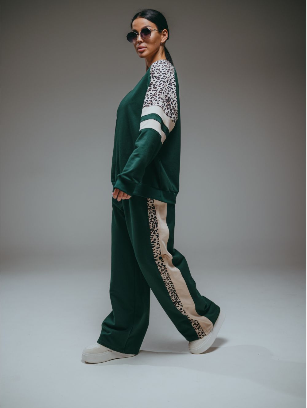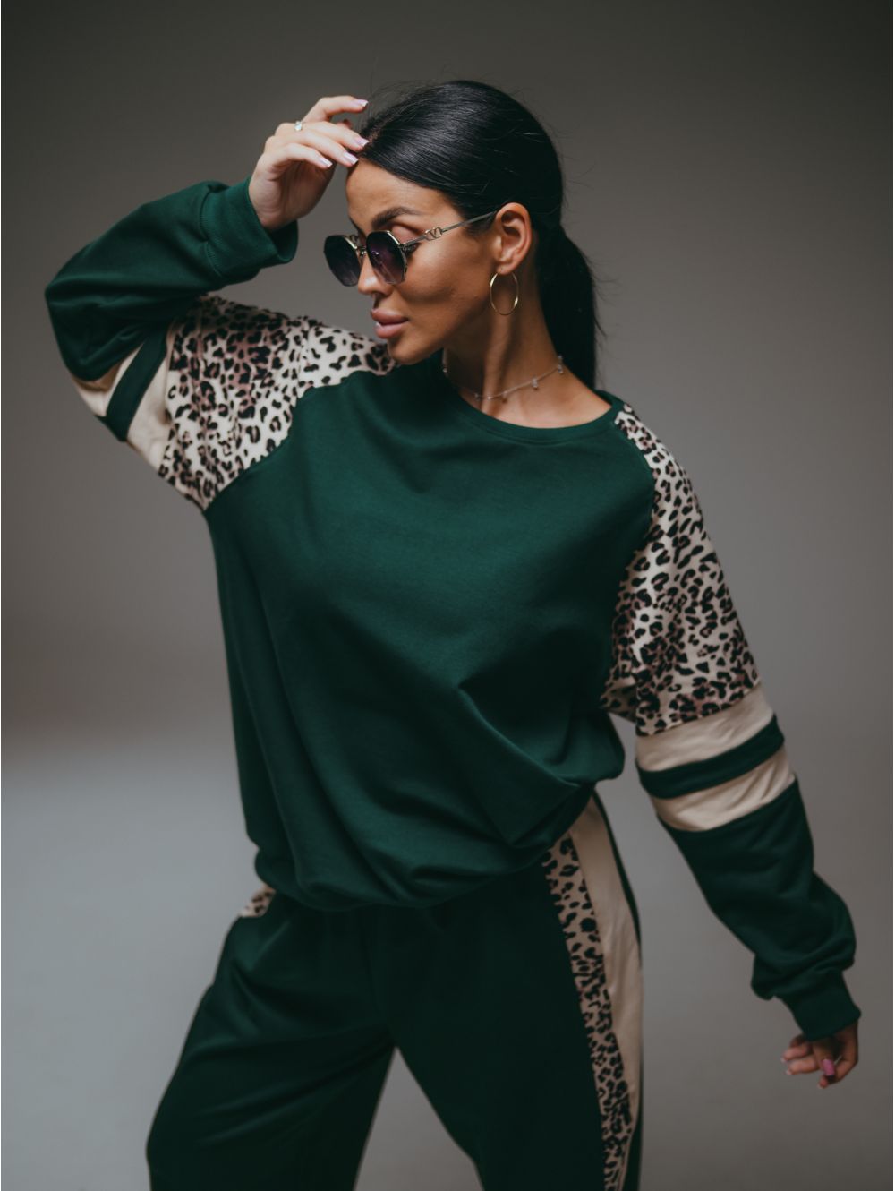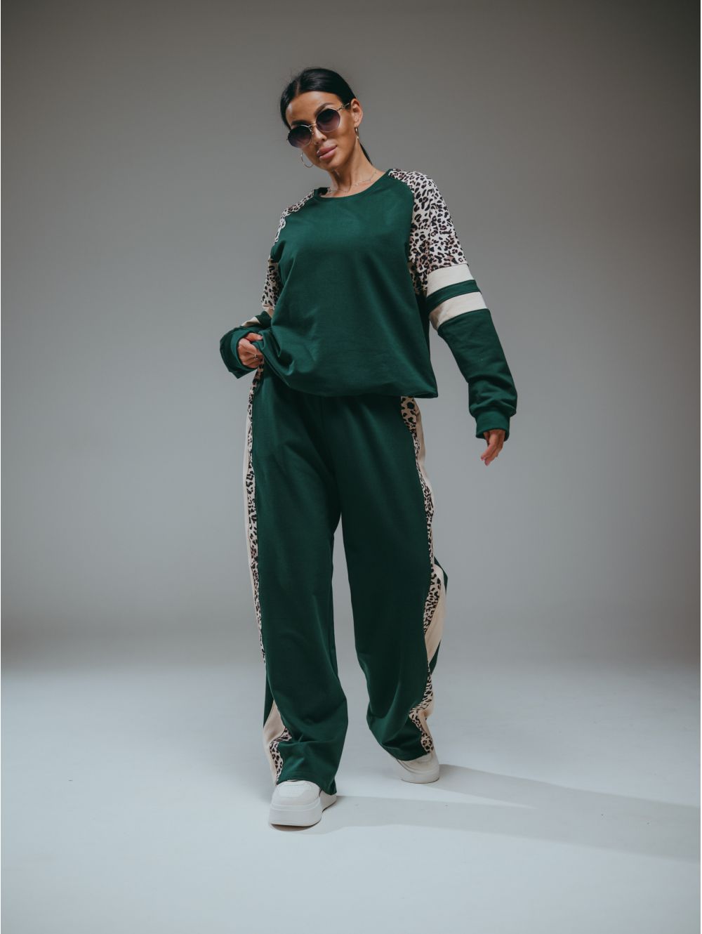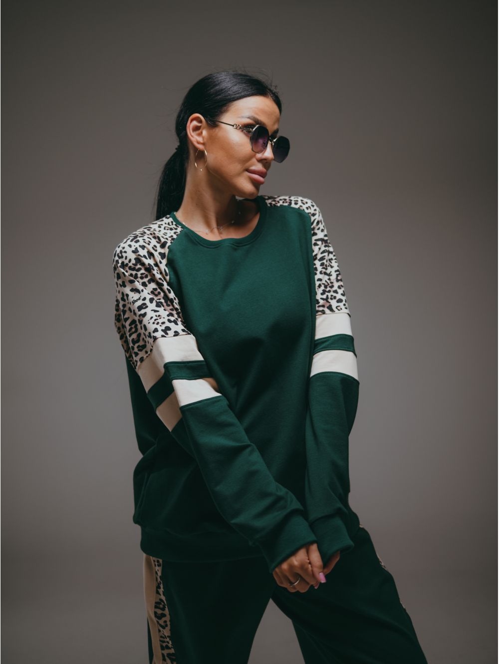 Готовый образ для тех, кто ценит комфорт и не боится ярких акцентов! Этот женский костюм из мягкого футера с лайкрой включает свитшот и брюки. Свитшот прямого силуэта с модным рукавом реглан украшен стильными леопардовыми вставками, добавляющими образу дерзости.