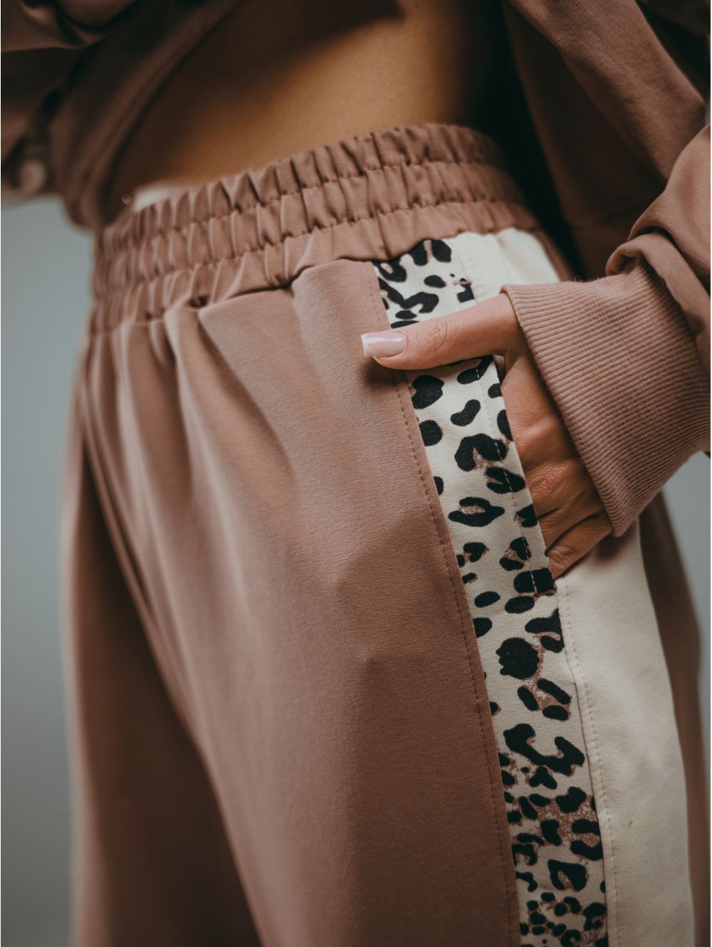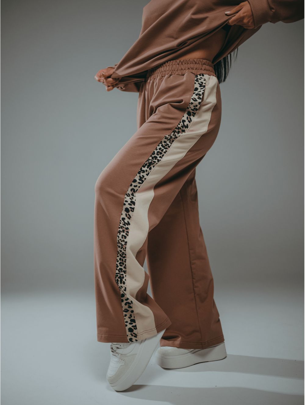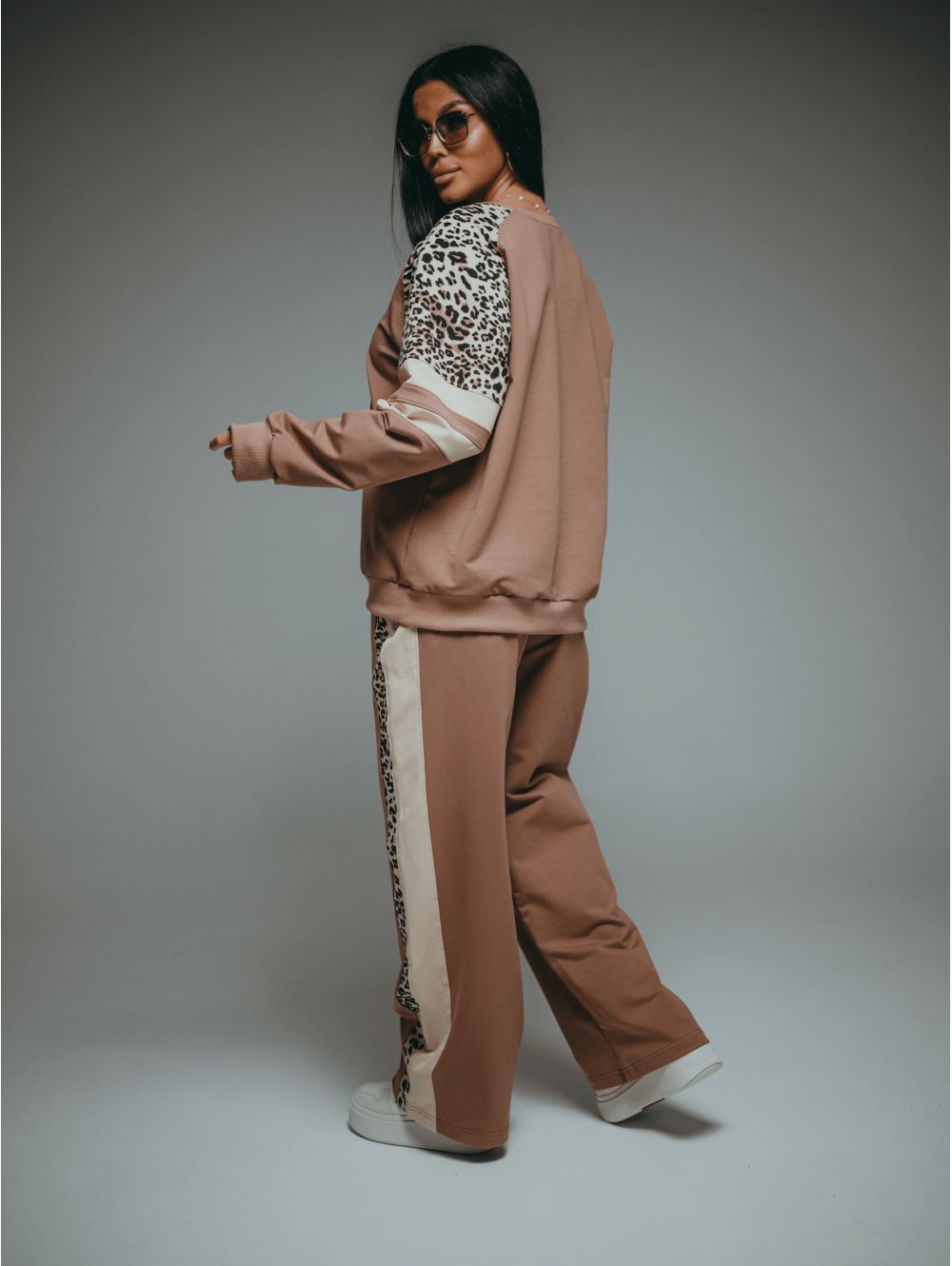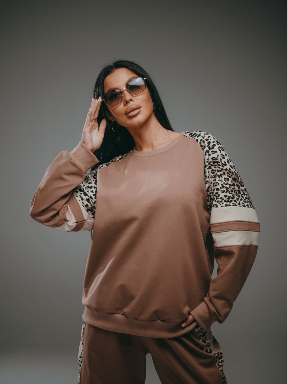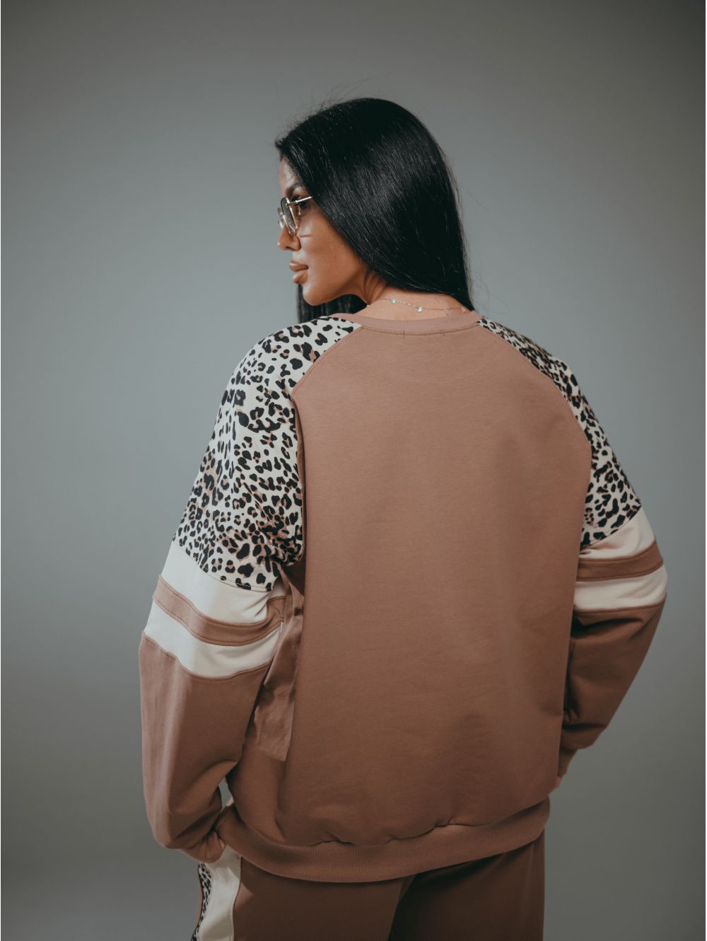 Модный дизайн свитшота: Рукав реглан обеспечивает свободу движений, а леопардовые вставки — это трендовый акцент, который легко комбинируется с базовым гардеробом.
