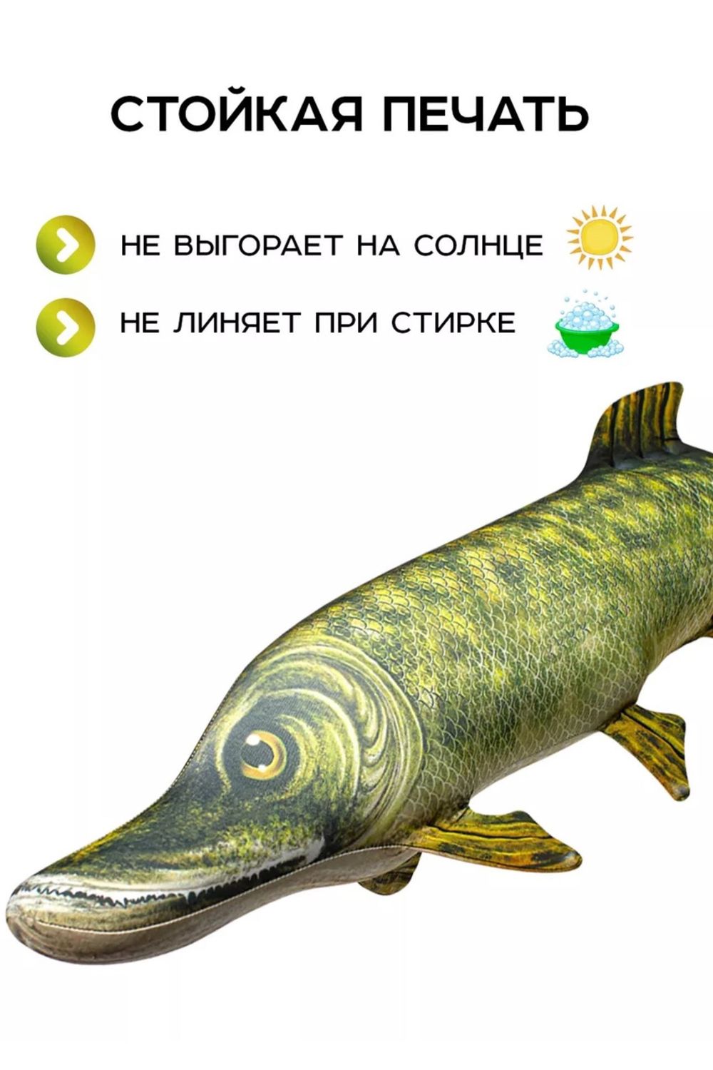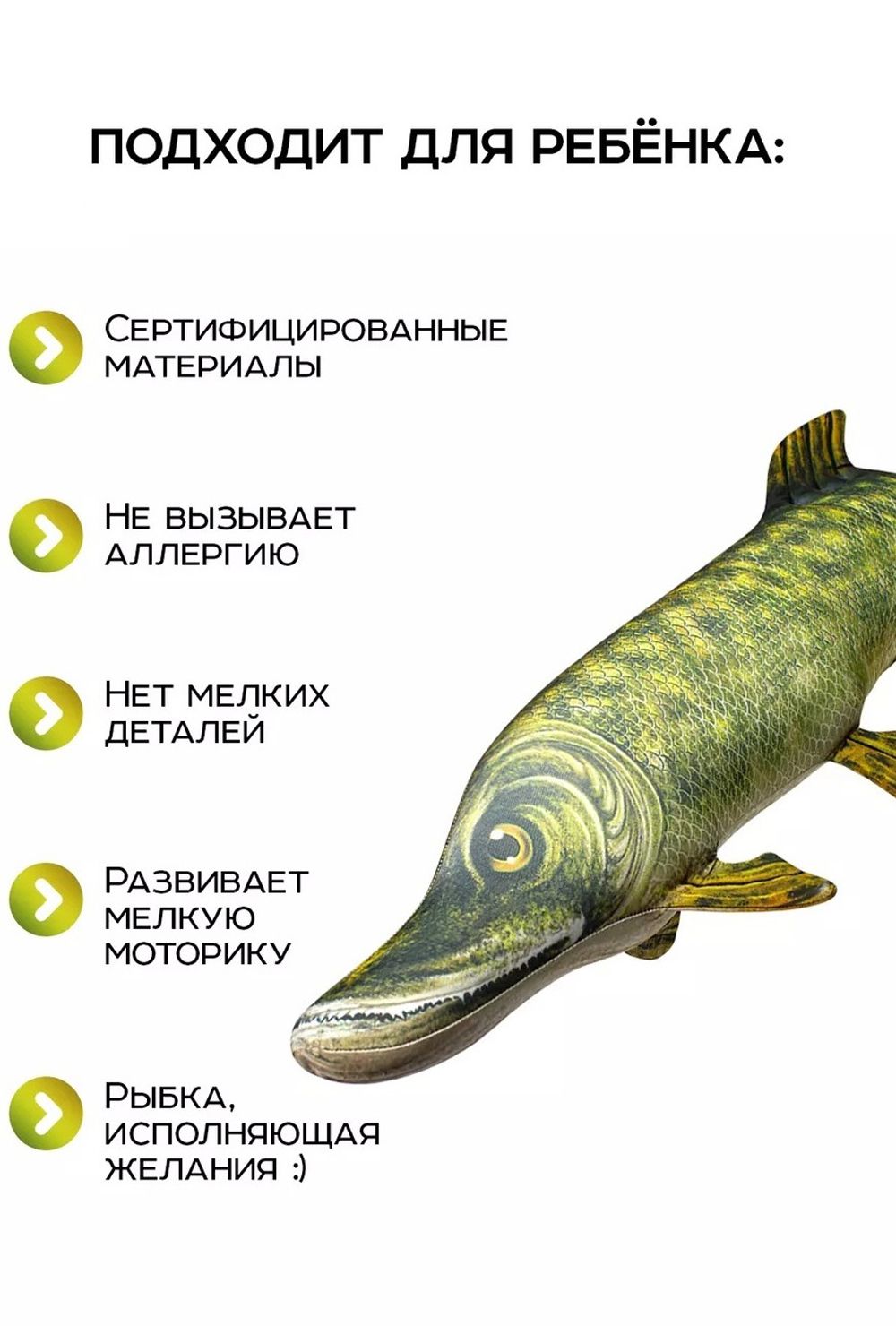 Эта большая мягкая рыба станет отличным подарком для взрослых и детей. Каждый рыбак мечтает о таком оригинальном и полезном сувенире. Украсит любой интерьер, будь то комната увлечённого рыбалкой мужчины или уютное семейное гнездышко, детская. Это верный компаньон на диване во время просмотра фильмов о рыбалке или обсуждения новых трофеев с друзьями, хороша при поездках на машине, походах - её можно использовать как удобную подушечку, которая поддерживает голову и шею в комфортном положении.