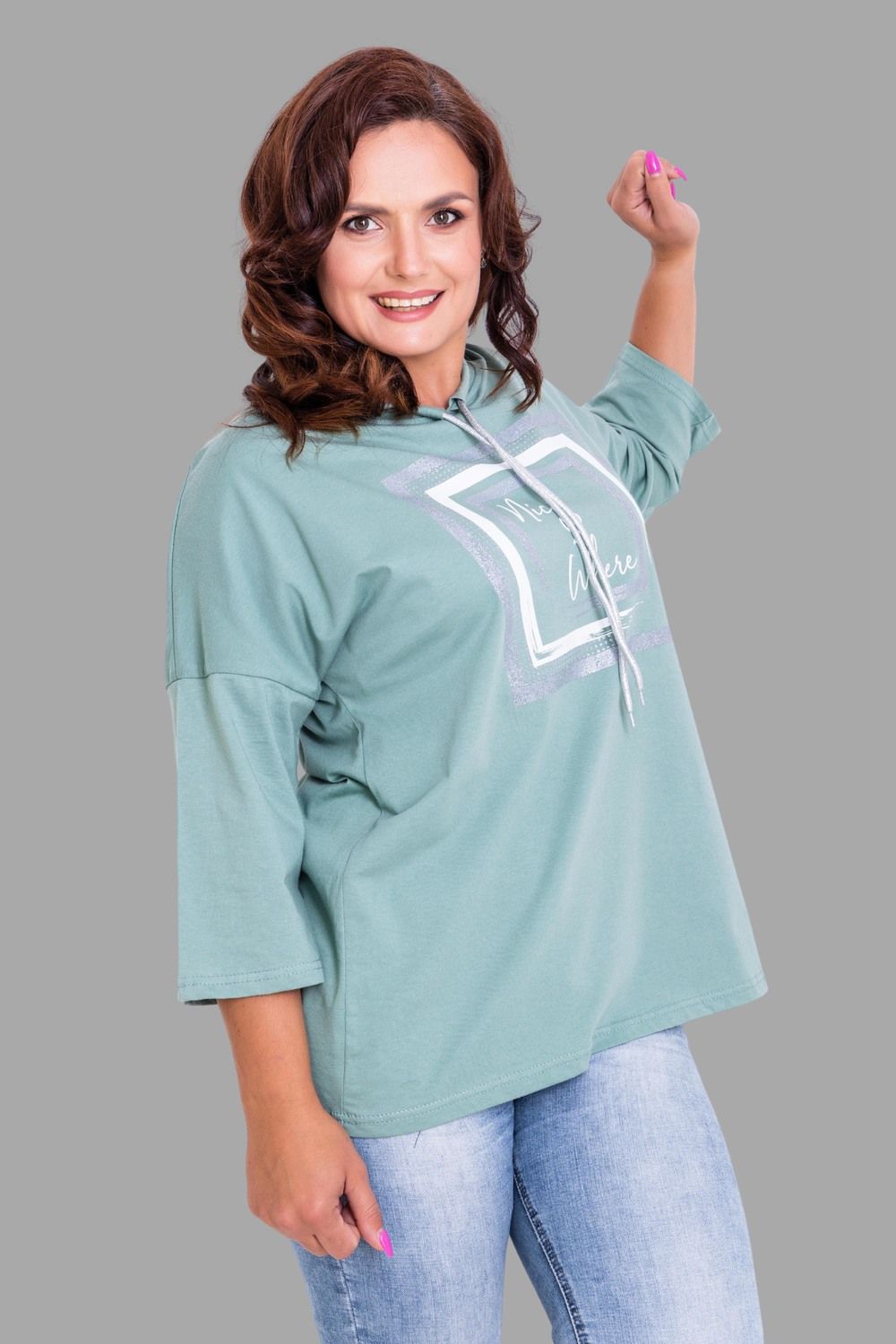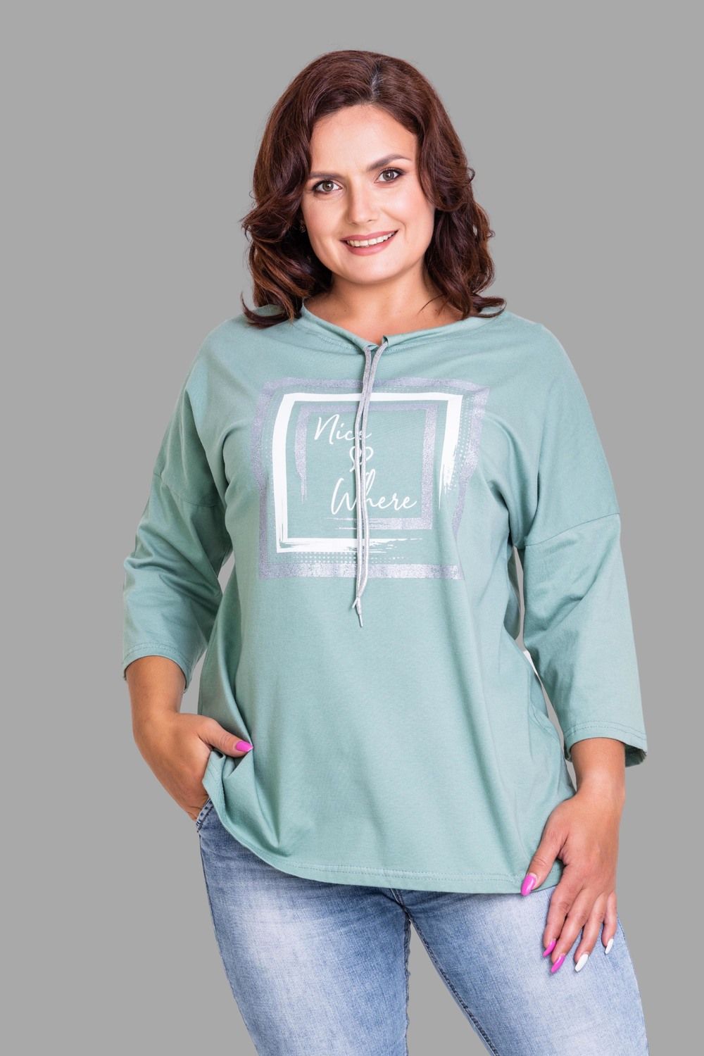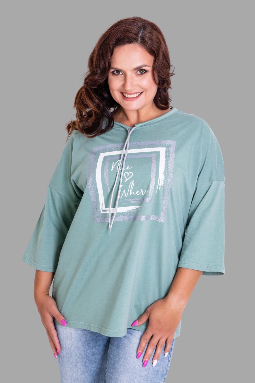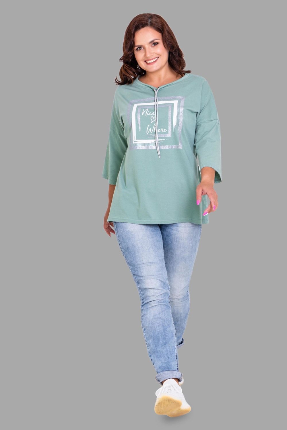 Удлиненная женская футболка длиной до середины бедра с округлым вырезом горловины. Классические красный, зеленый, черный и, конечно же, белый цвета не утратят своей актуальности. Модели средней длины прекрасно смотрятся с брюками-дудочками или облегающими джинсами. В прохладную погоду хорошо будет смотреться в паре с утепленной жилеткой или курткой. Принт из блестящего глиттера прекрасно гармонирует с серебристым шнурком. Модель выполнена из хлопка высшего качества.