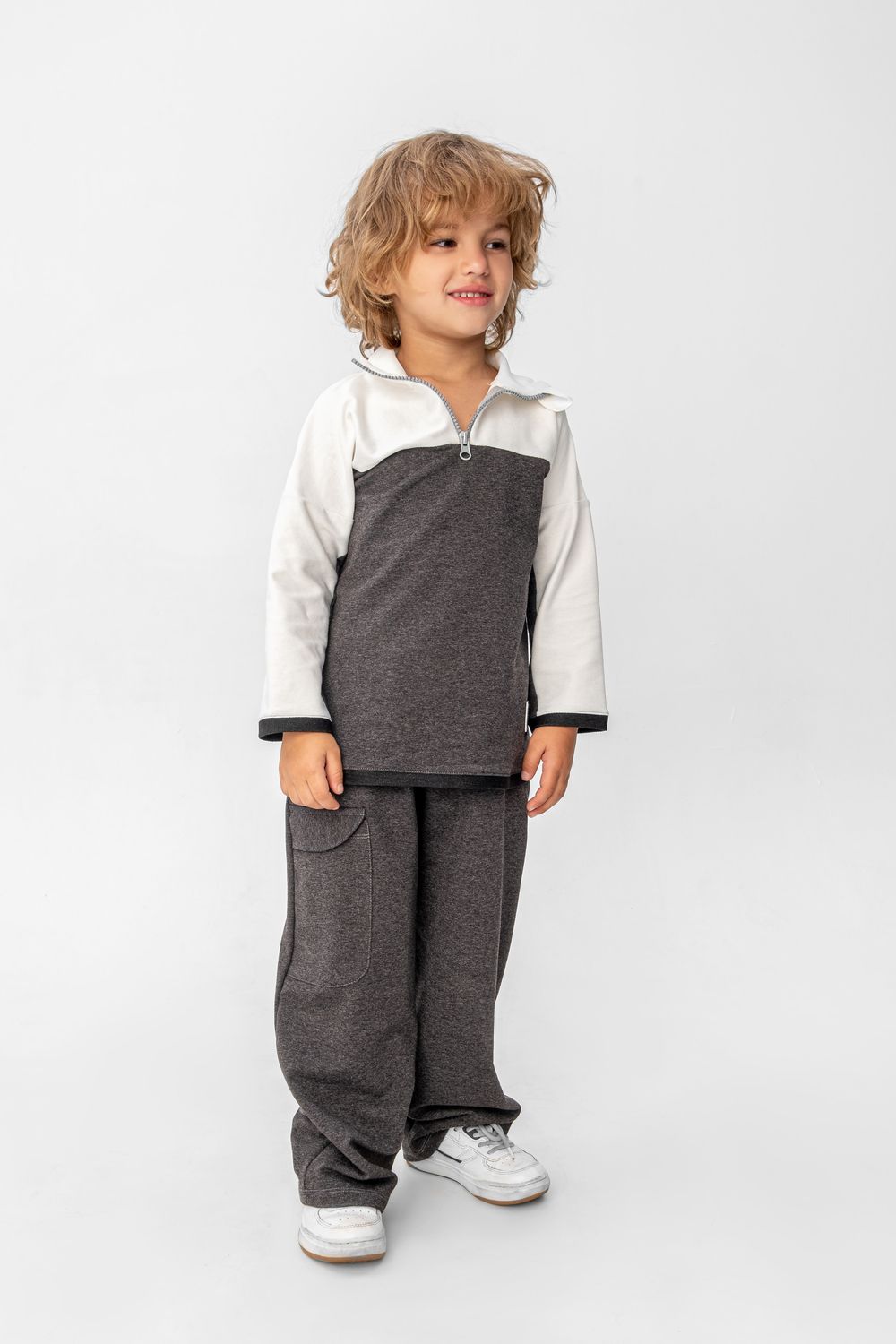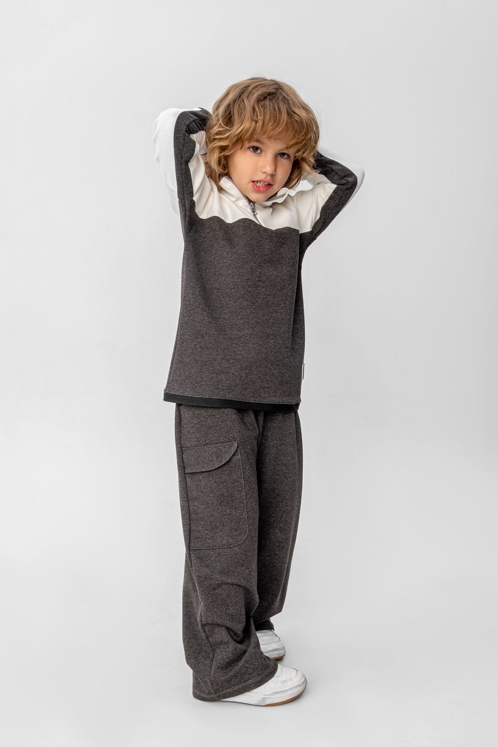 Костюм из футера двунитки. Свитшот и брюки. Свитшот дополнен нашитыми световозвращающими элементами. Брюки прямого кроя с боковыми карманами и накладным карманом на брючине.