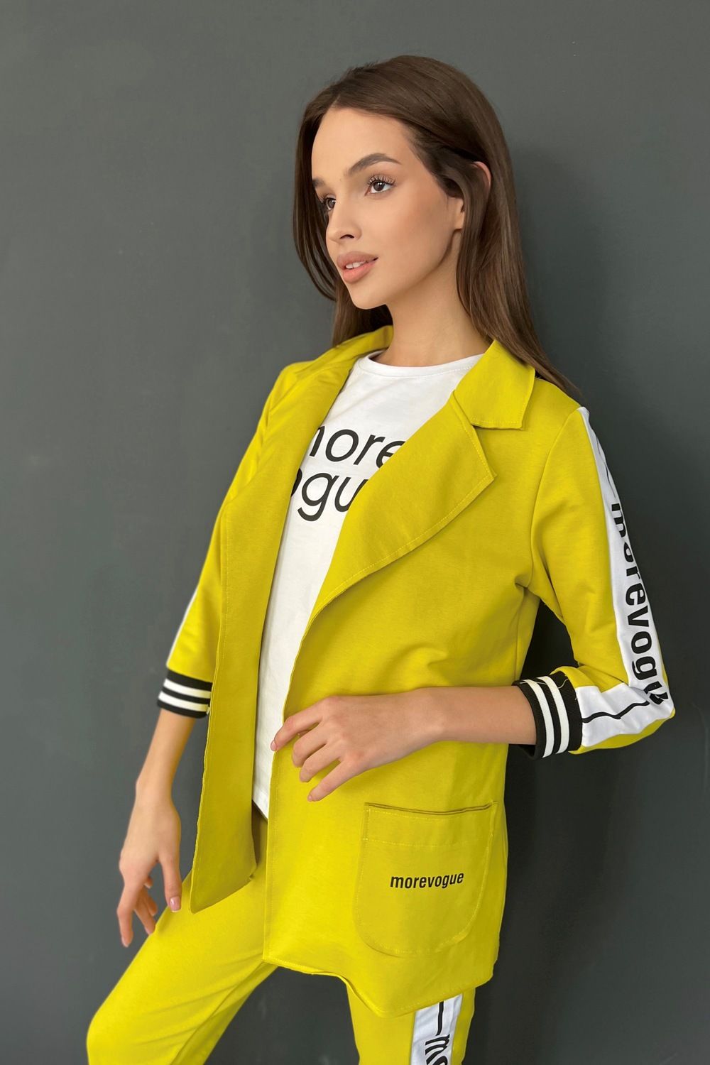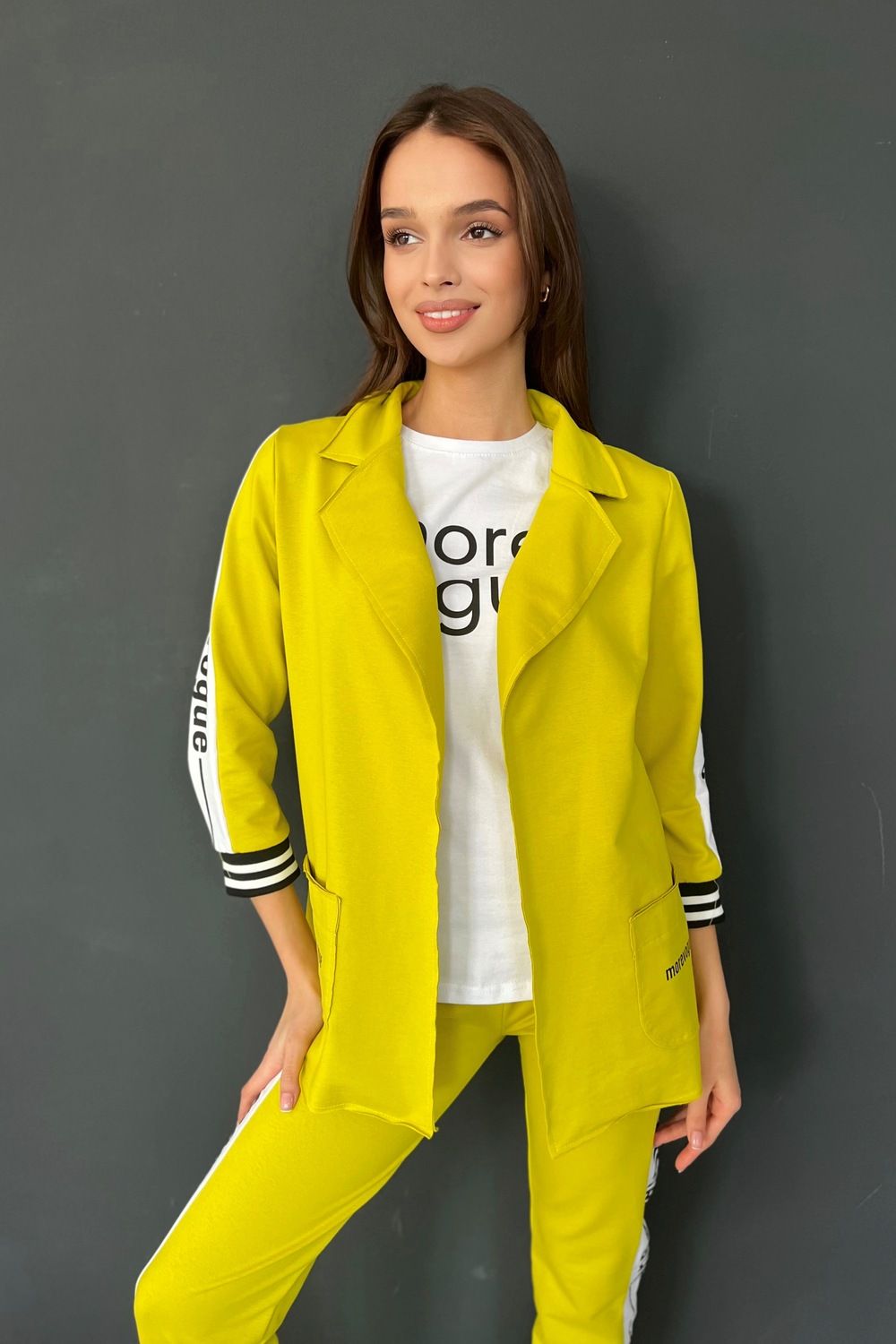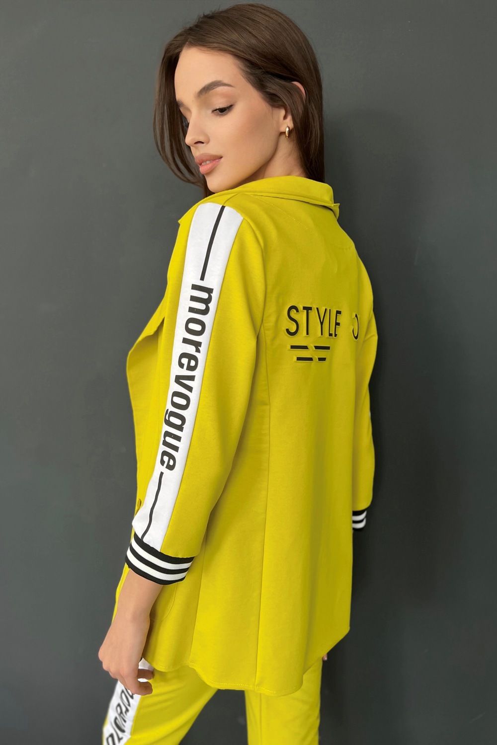 Жакет полуприлегающего силуэта, длиной до середины бедра, с английским воротником. Рукав втачной, длинной 7/8, с отделочным лампасом вдоль рукава, на эластичном манжете. В нижней части полочки расположены накладные карманы. Спинка с рельефами.