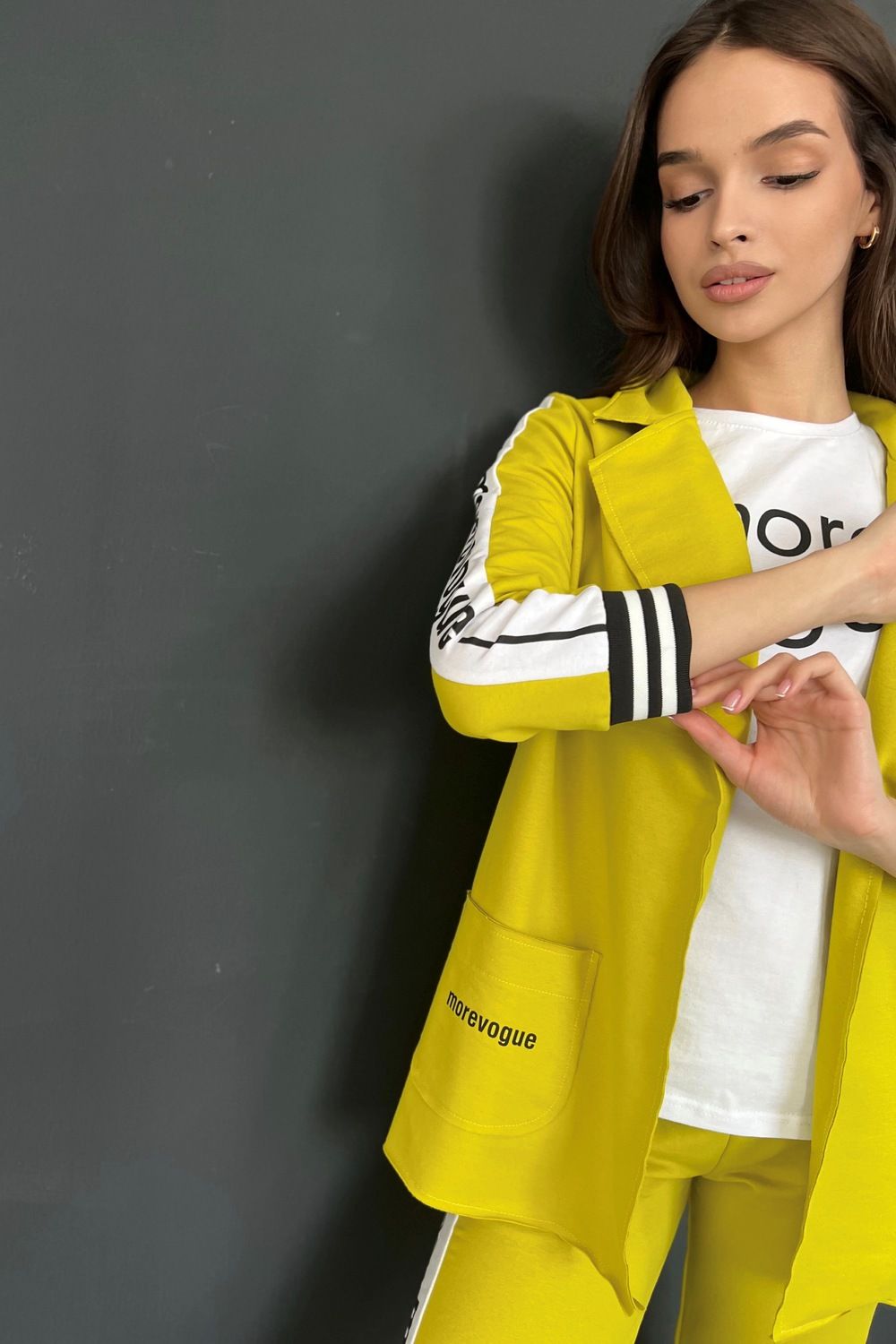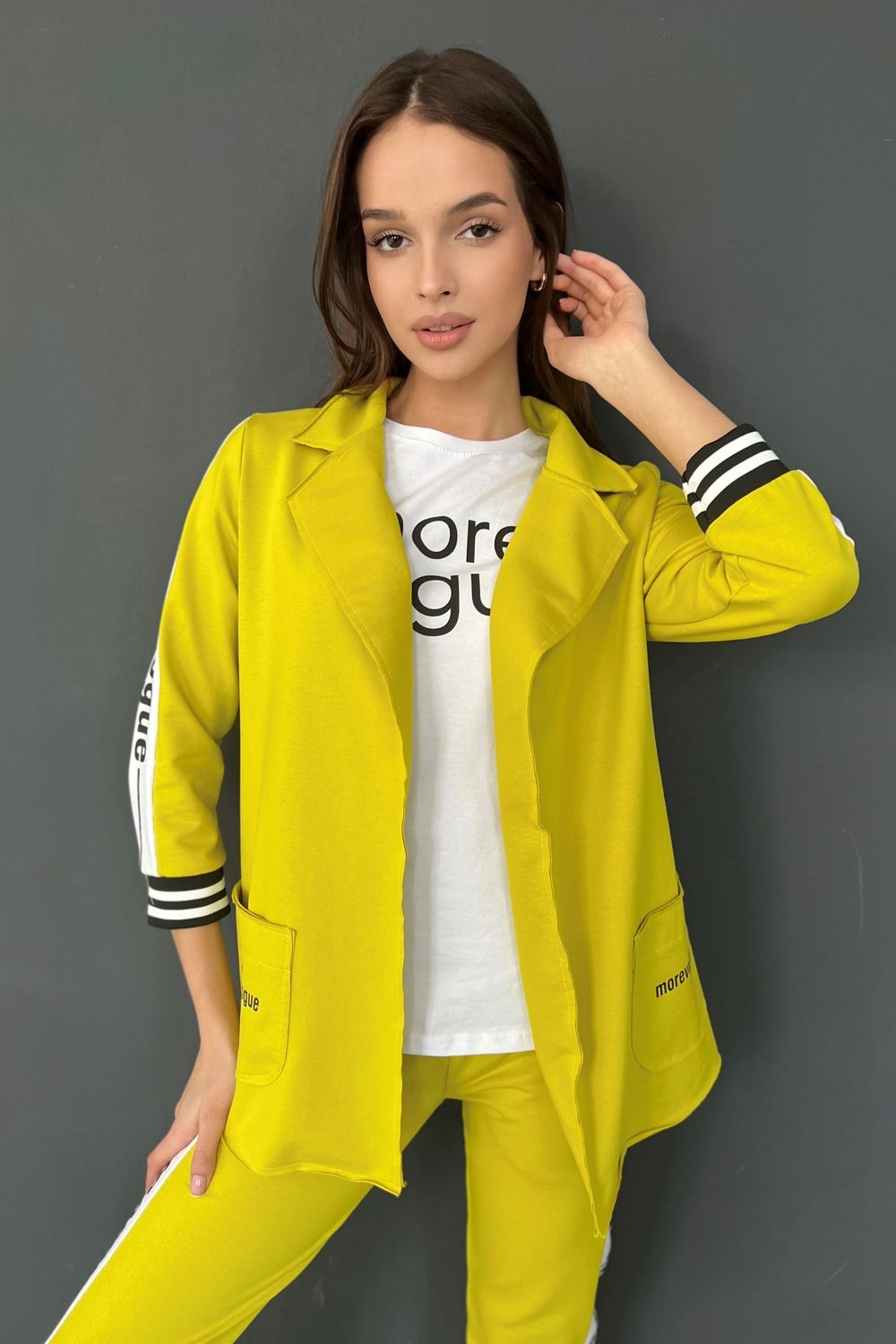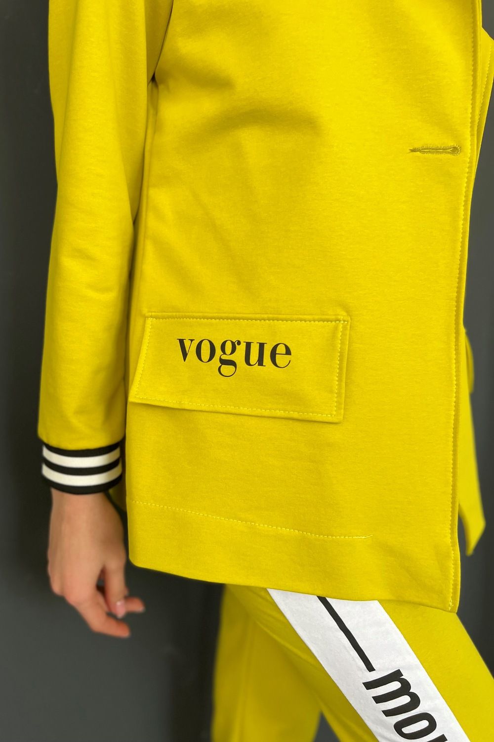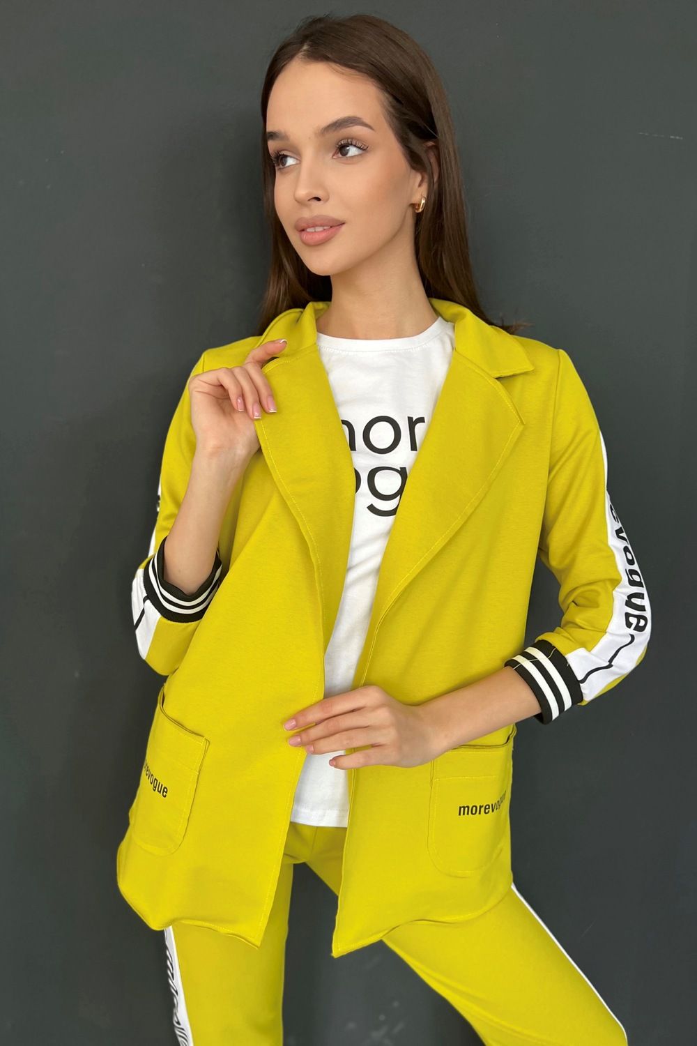 Жакет полуприлегающего силуэта, длиной до середины бедра, с английским воротником. Рукав втачной, длинной 7/8, с отделочным лампасом вдоль рукава, на эластичном манжете. В нижней части полочки расположены накладные карманы. Спинка с рельефами.