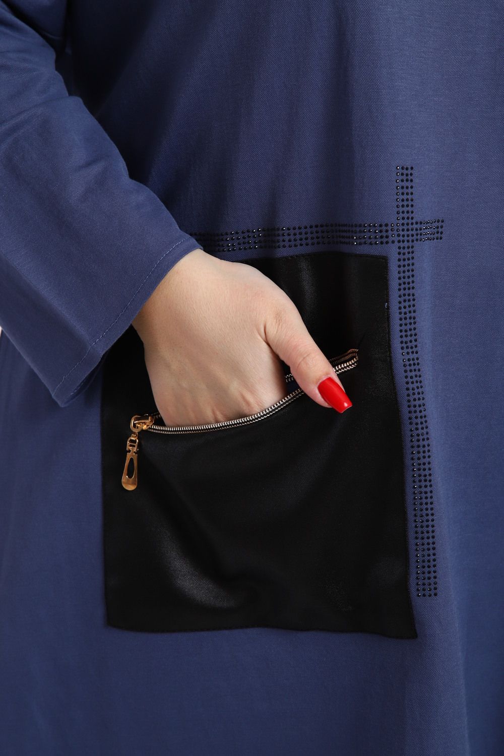 Материалы и качество: Туника выполнена из высококачественного материала, обеспечивающего комфорт и долговечность. Использование стрейч-кожи для кармана подчеркивает внимание к деталям и обеспечивает дополнительную износостойкость.