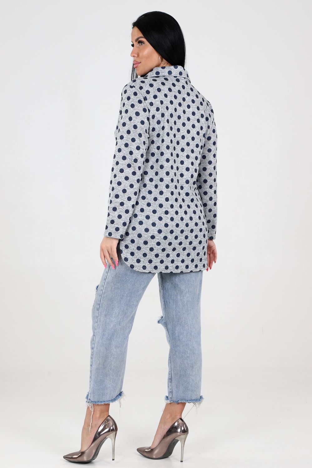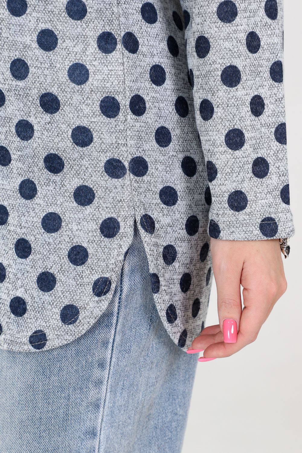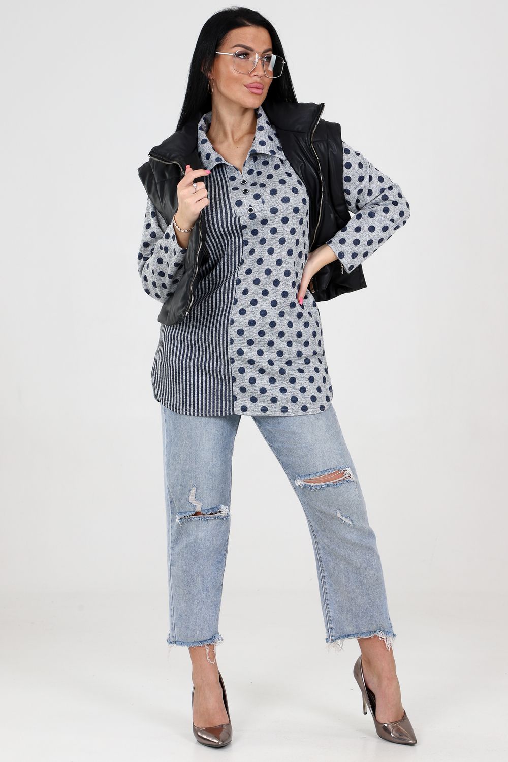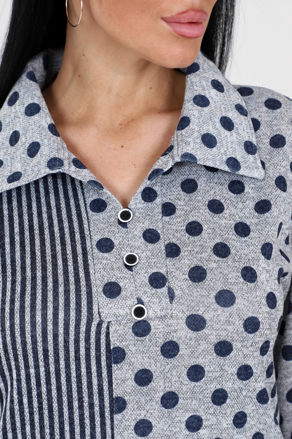 Туника выделяется своим необычным сочетанием узоров: изысканные горохи и полосы создают интересный визуальный эффект, выделяющий вас из толпы. Такая комбинация подходит для создания ярких и запоминающихся образов.