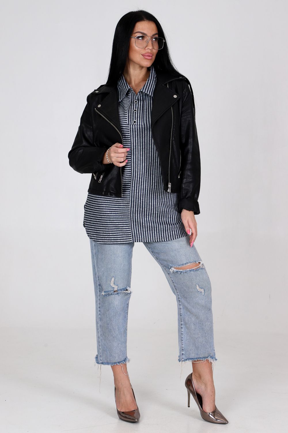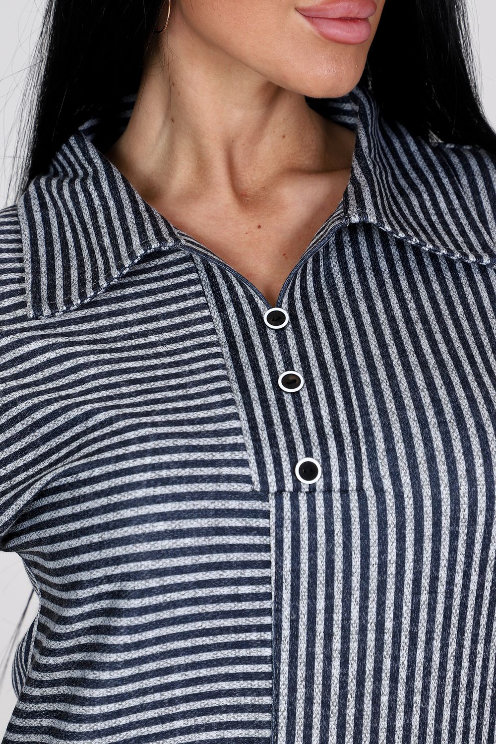 Передняя полочка туники – это игра линий и текстур. Вертикальная полоса визуально вытягивает силуэт, делая фигуру стройнее, а горизонтальная добавляет образу динамичности и оригинальности.