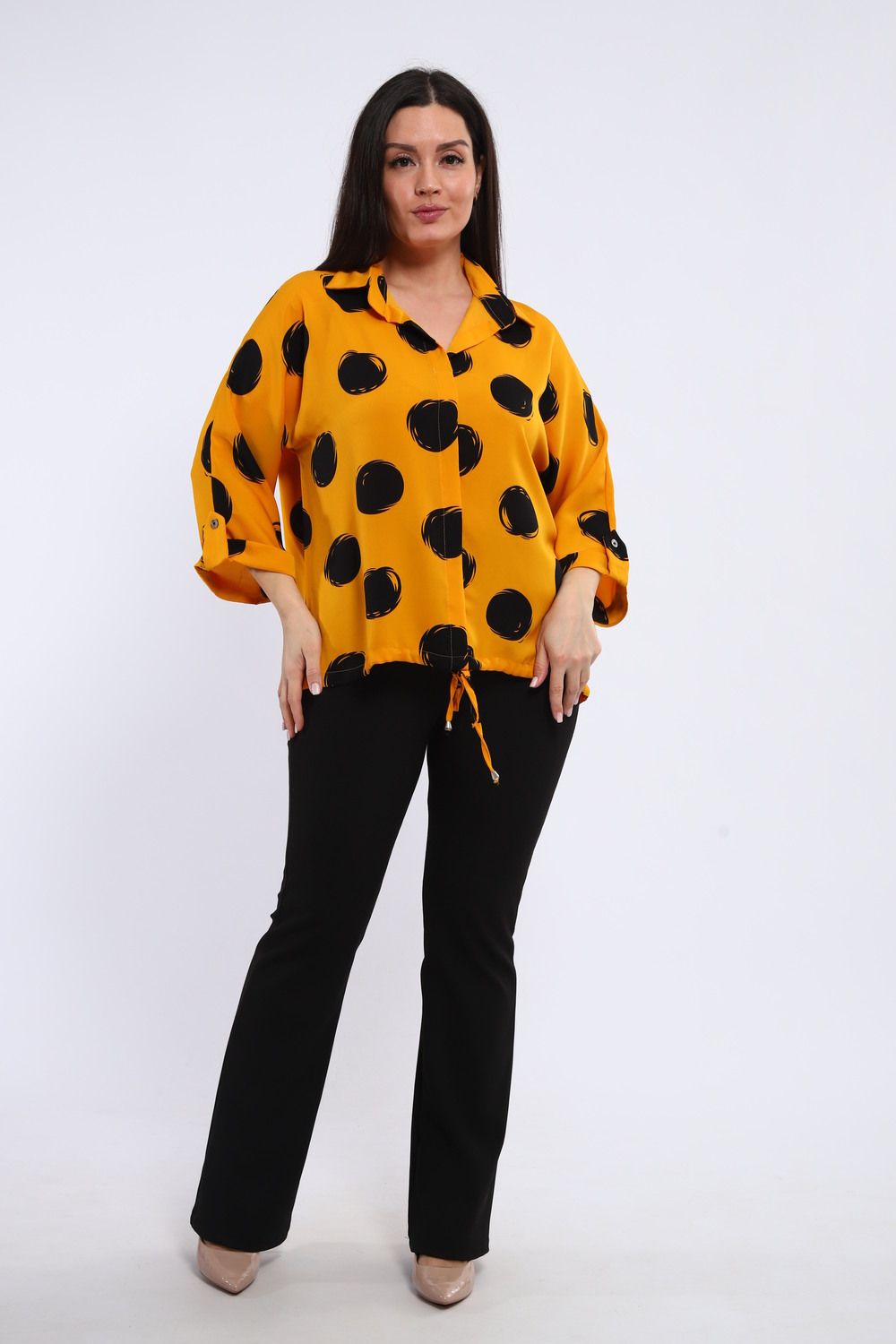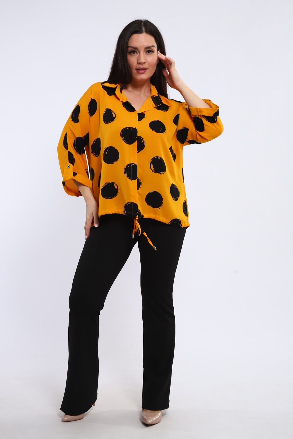 Низ туники, оформленный на шнурке, предоставляет возможность регулировать ширину и создавать различные силуэты. Затянув шнурок, можно подчеркнуть талию и придать образу более женственный вид, а оставив его свободным – создать расслабленный и непринужденный образ. Эта деталь делает тунику универсальной и позволяет адаптировать ее под любой стиль и настроение.