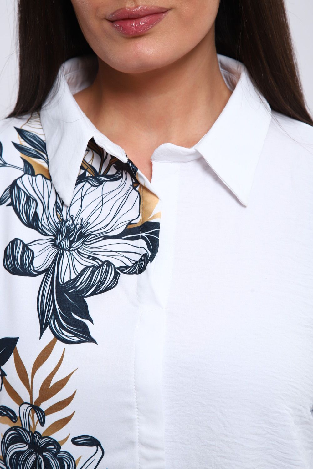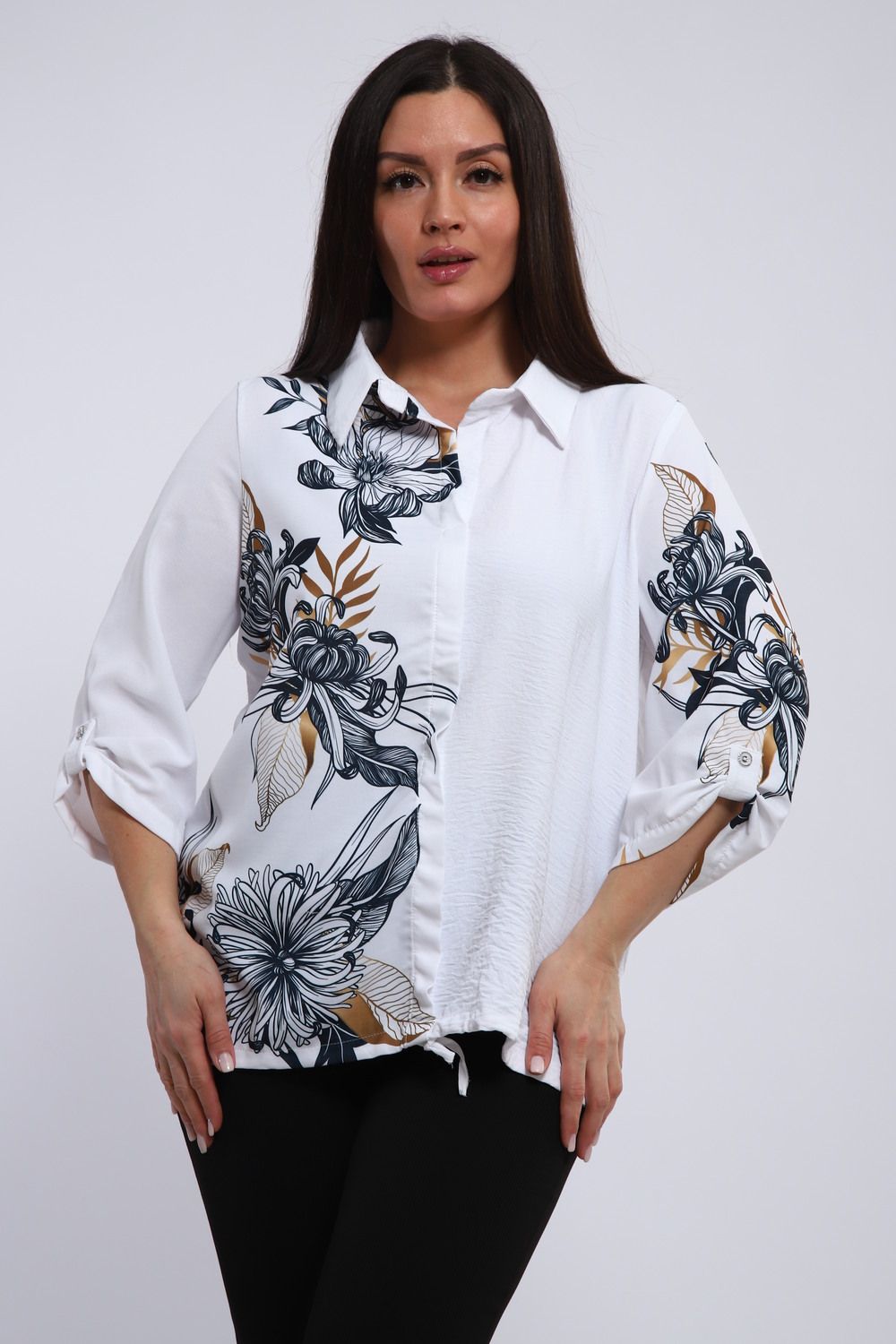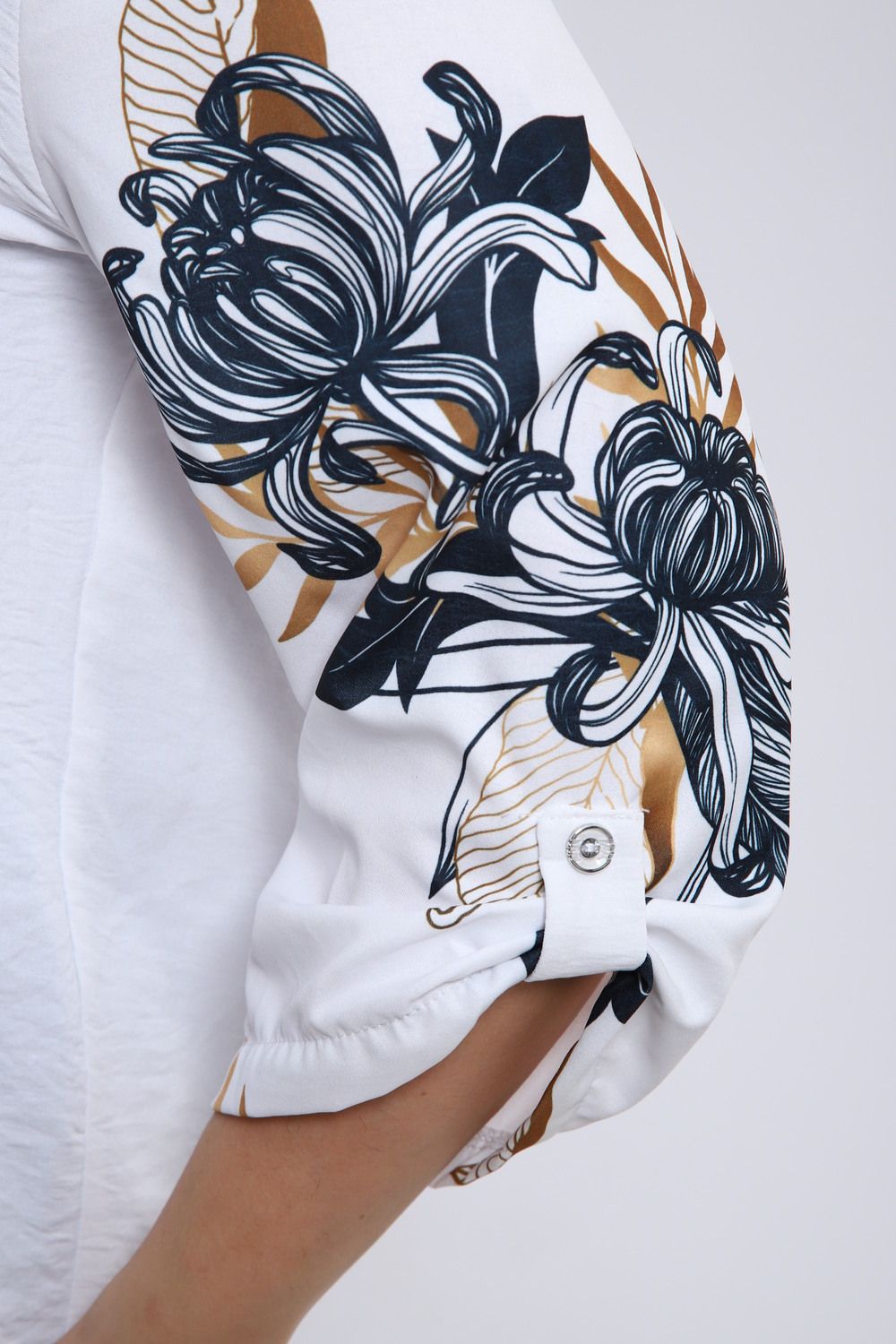 Эта стильная женская туника станет отличным дополнением вашего гардероба. Она украшена изысканным цветочным принтом, который добавляет яркости и свежести в любой образ. Рубашечный воротник придает изделию элегантный вид, а декоративная платна на полочке добавляет интересный акцент. Рукава три четверти, подобранные на паты, обеспечивают комфорт и свободу движений. Низ туники оформлен шнурком, что позволяет регулировать силуэт и подчеркивать талию. Эта туника идеально подойдет как для повседневной носки, так и для более нарядных случаев, создавая стильный и женственный образ