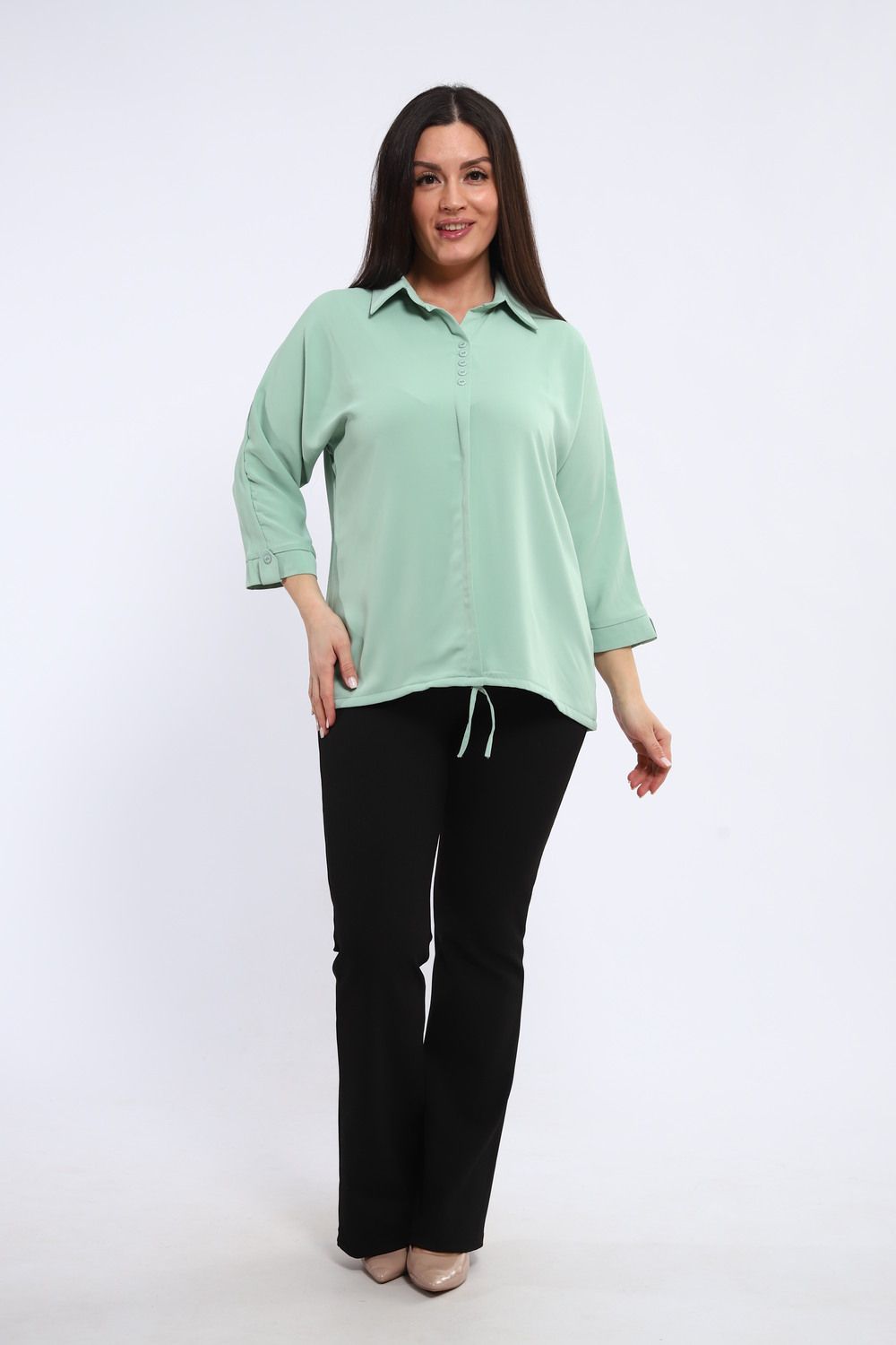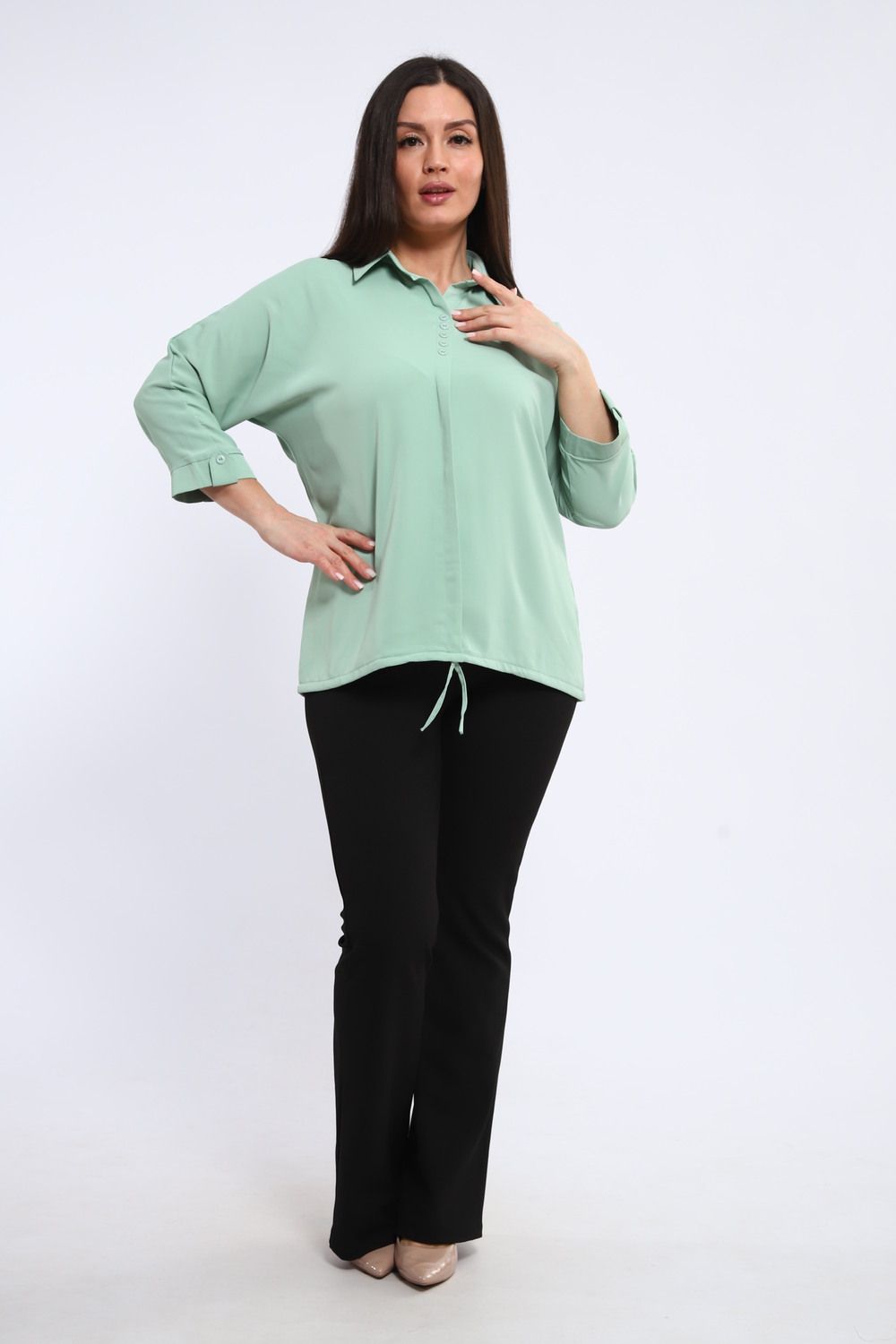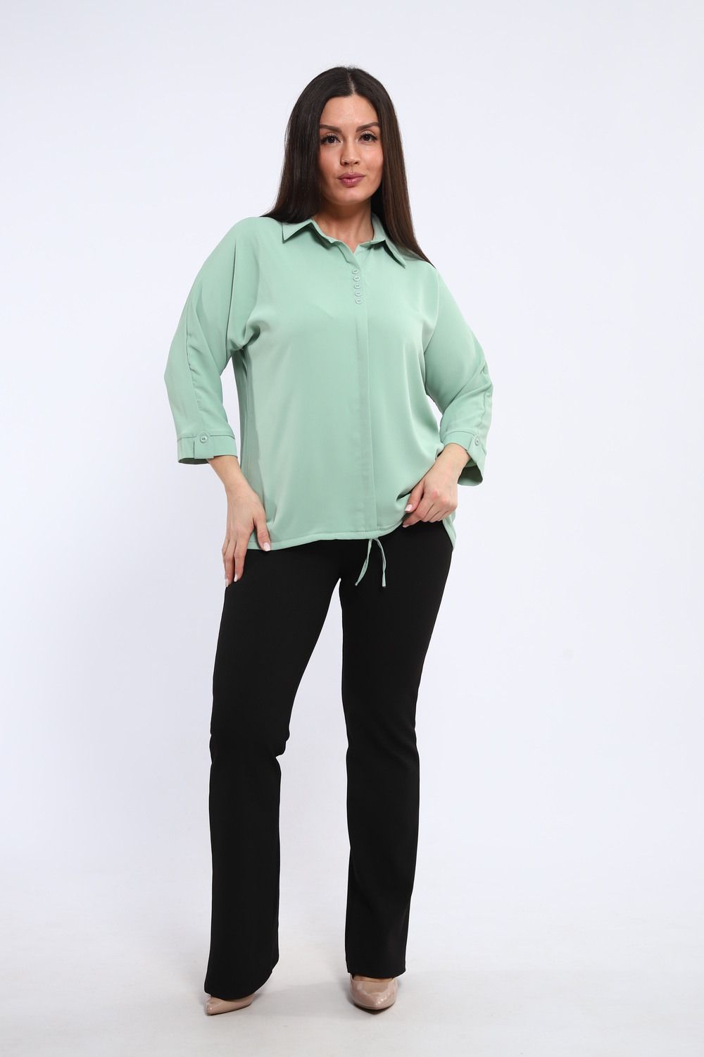 Элегантная однотонная туника – воплощение комфорта и стиля в каждой детали. Рукав три четверти, искусно подобранный на паты, придает образу непринужденную легкость, позволяя адаптировать длину в зависимости от настроения и обстоятельств. Декоративная планка на полочке добавляет изысканности и визуально вытягивает силуэт, создавая стройный и грациозный вид.