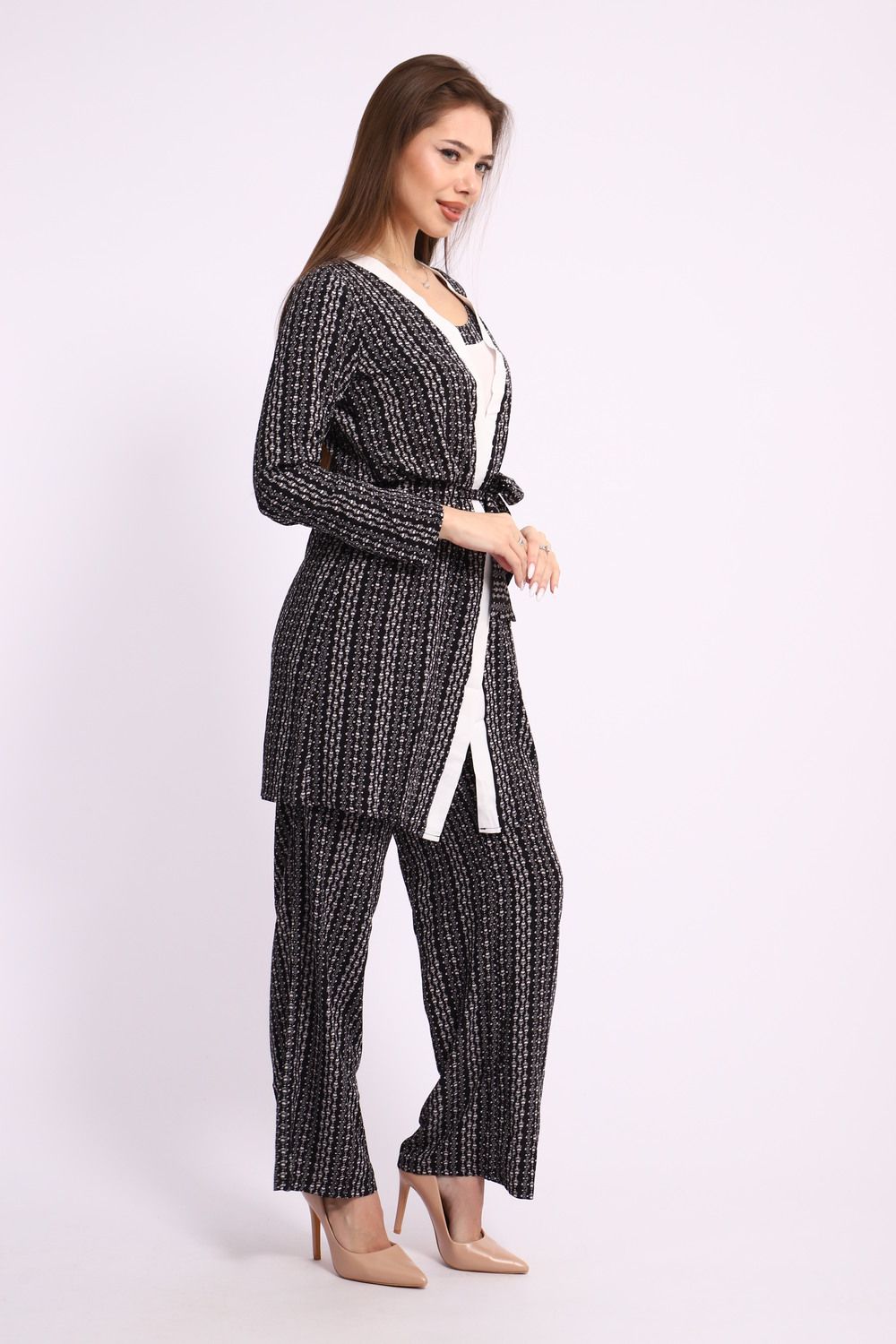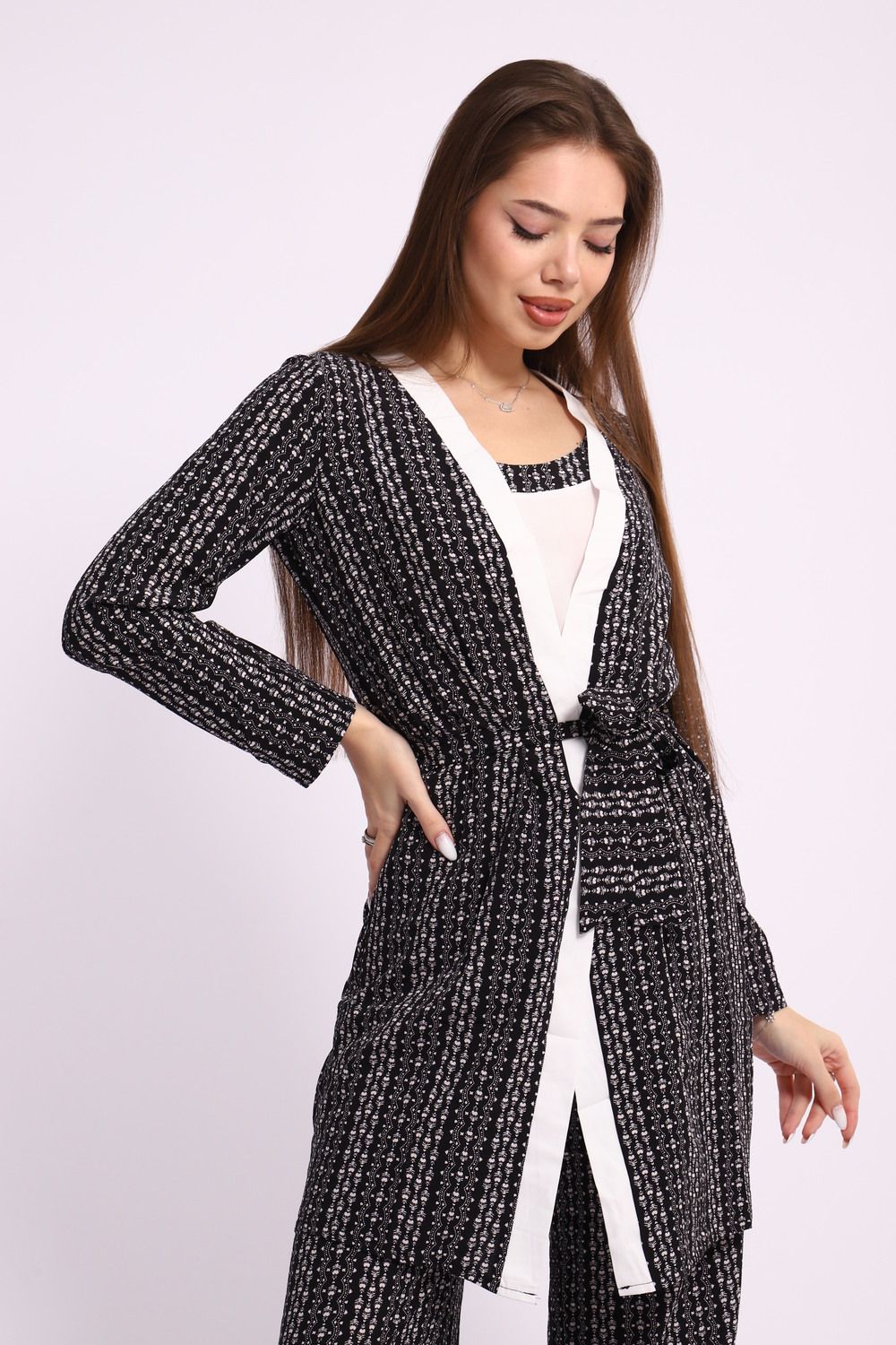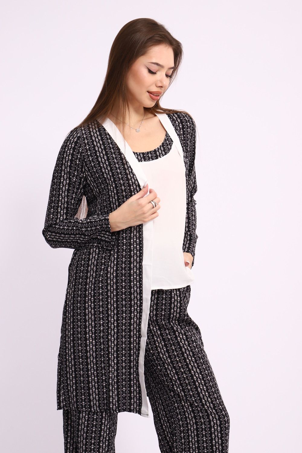 Погрузитесь в комфорт и стиль с нашим роскошным женским домашним костюмом, который станет неотъемлемой частью вашего гардероба. Этот элегантный комплект состоит из трех тщательно подобранных предметов: топ, брюки и халат, создающих гармоничный ансамбль для домашнего уюта и расслабления.