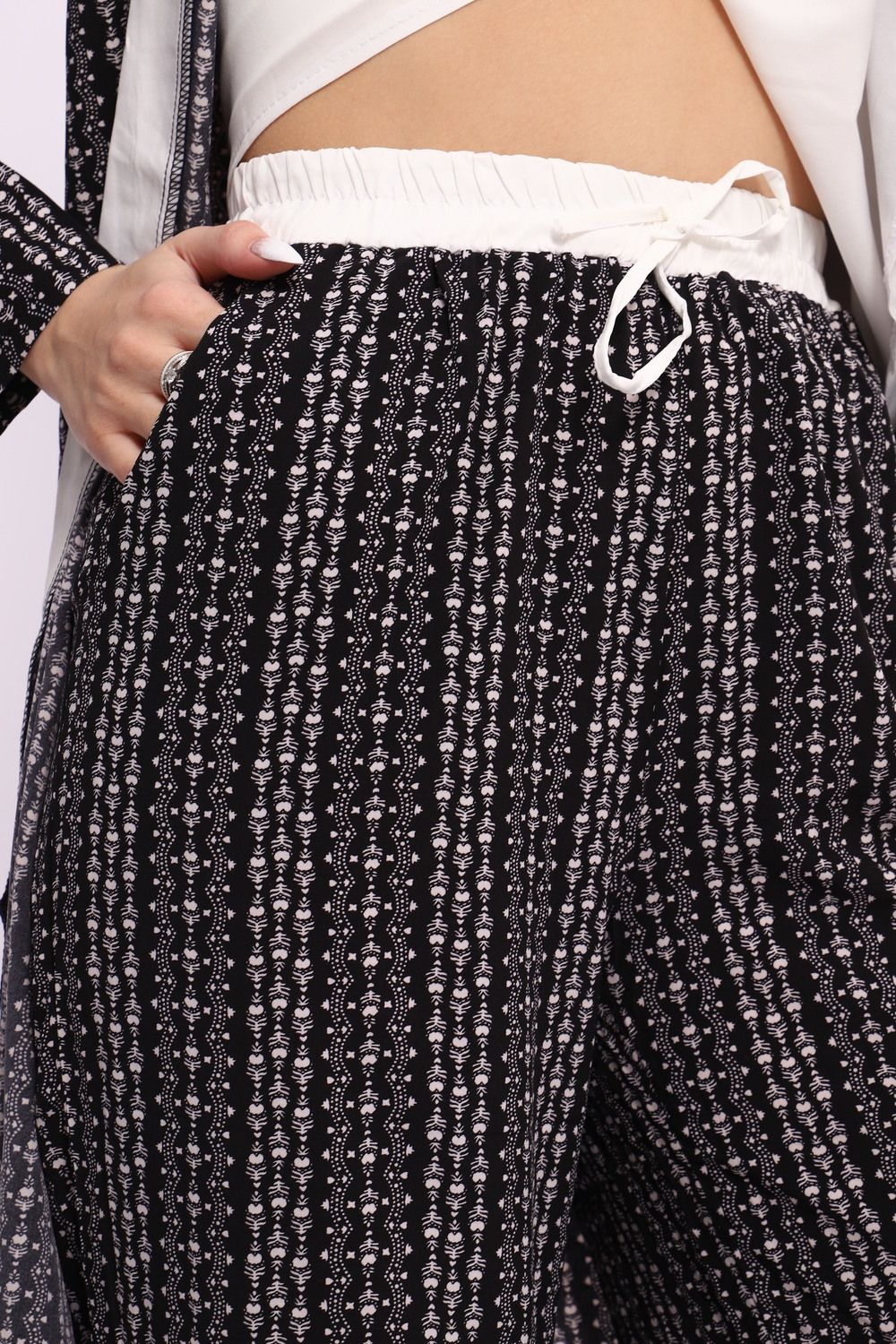 Продолжая тему комфорта, наш домашний костюм включает свободные брюки на резинке. Этот элемент обеспечит полную свободу движений и идеально подойдет для отдыха в домашних условиях. Едва ли найдется более удобный предмет гардероба для долгих вечеров с книгой или просмотра любимых фильмов. Брюки украшены аккуратными швами и тщательно продуманным кроем, подчеркивающим элегантность и стиль.
