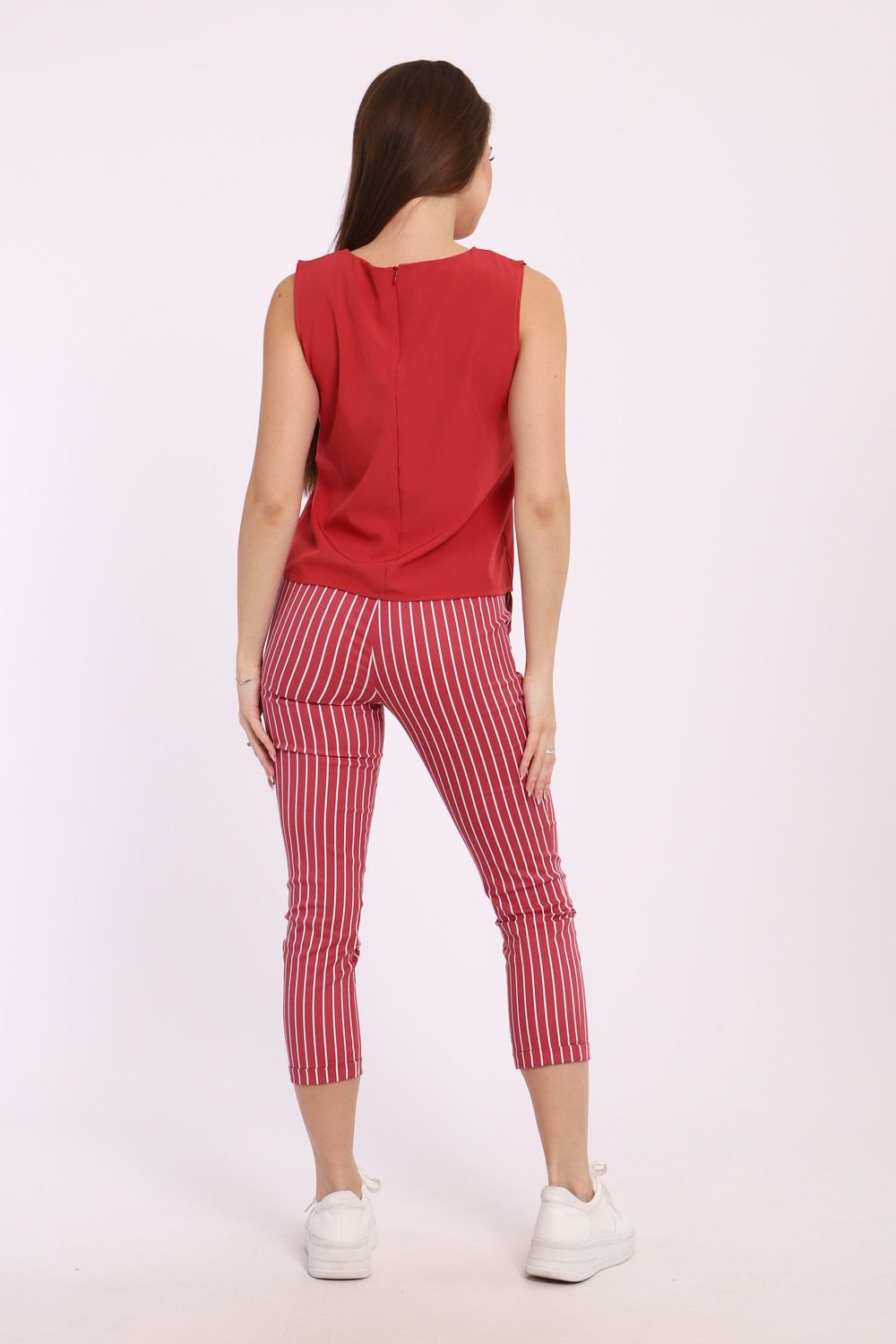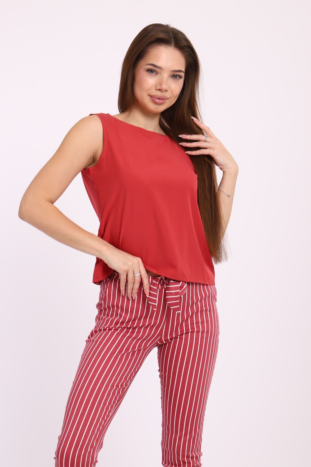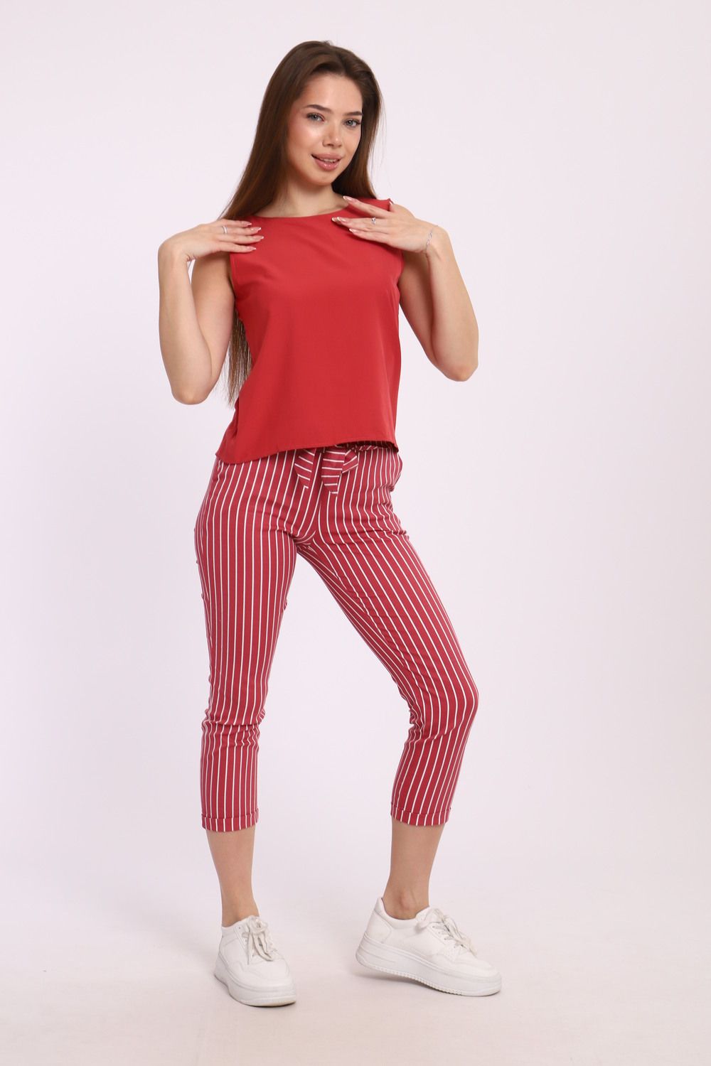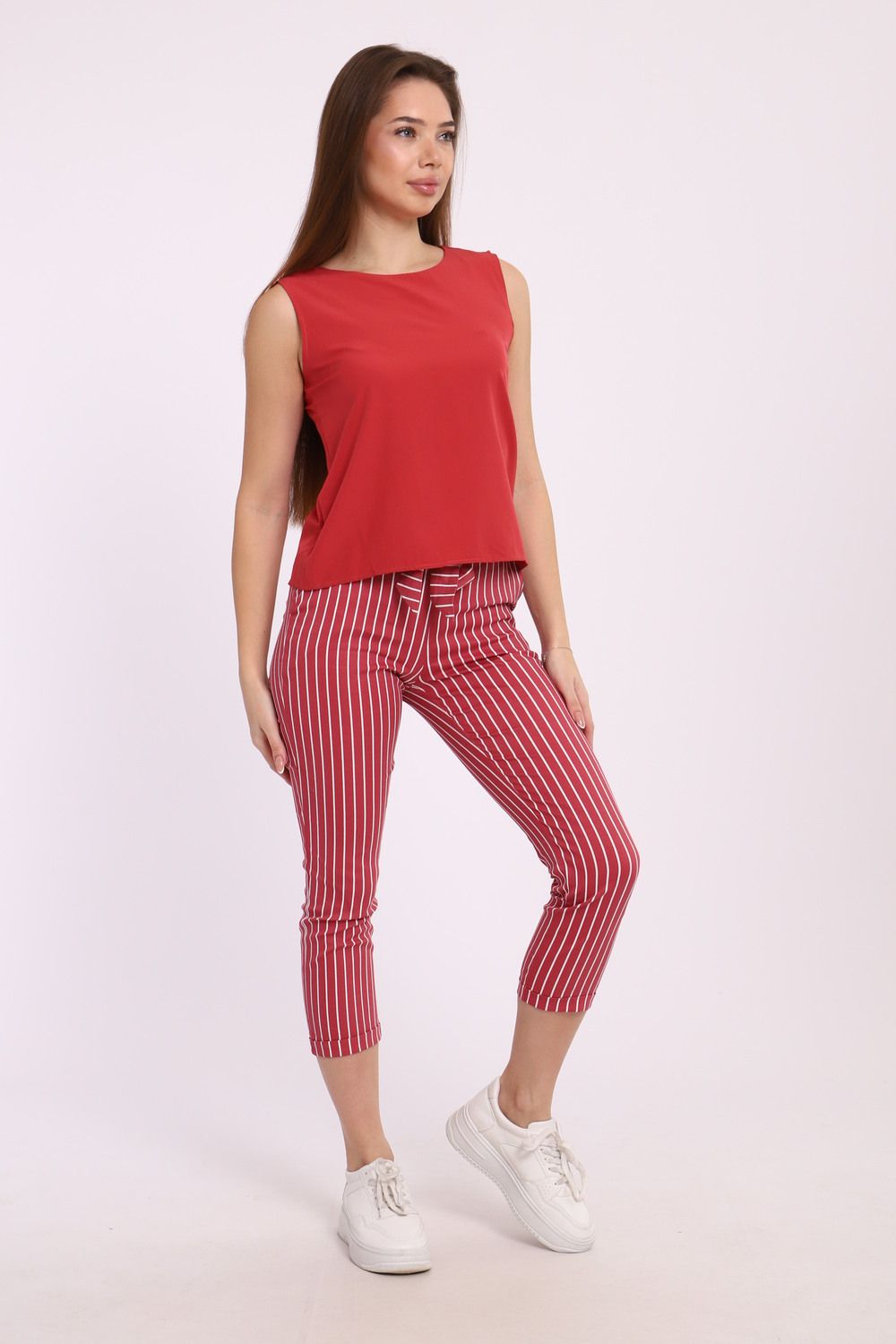 Наш однотонный топ, входящий в комплект, создан для того, чтобы гармонично дополнять полосатые брюки. Этот элемент гардероба выполнен в классическом дизайне, что позволяет легко сочетать его как с другими частями вашего гардероба, так и с различными аксессуарами. Материал топа мягкий и приятный к телу, он отлично сохраняет форму и не теряет цвет после множества стирок.