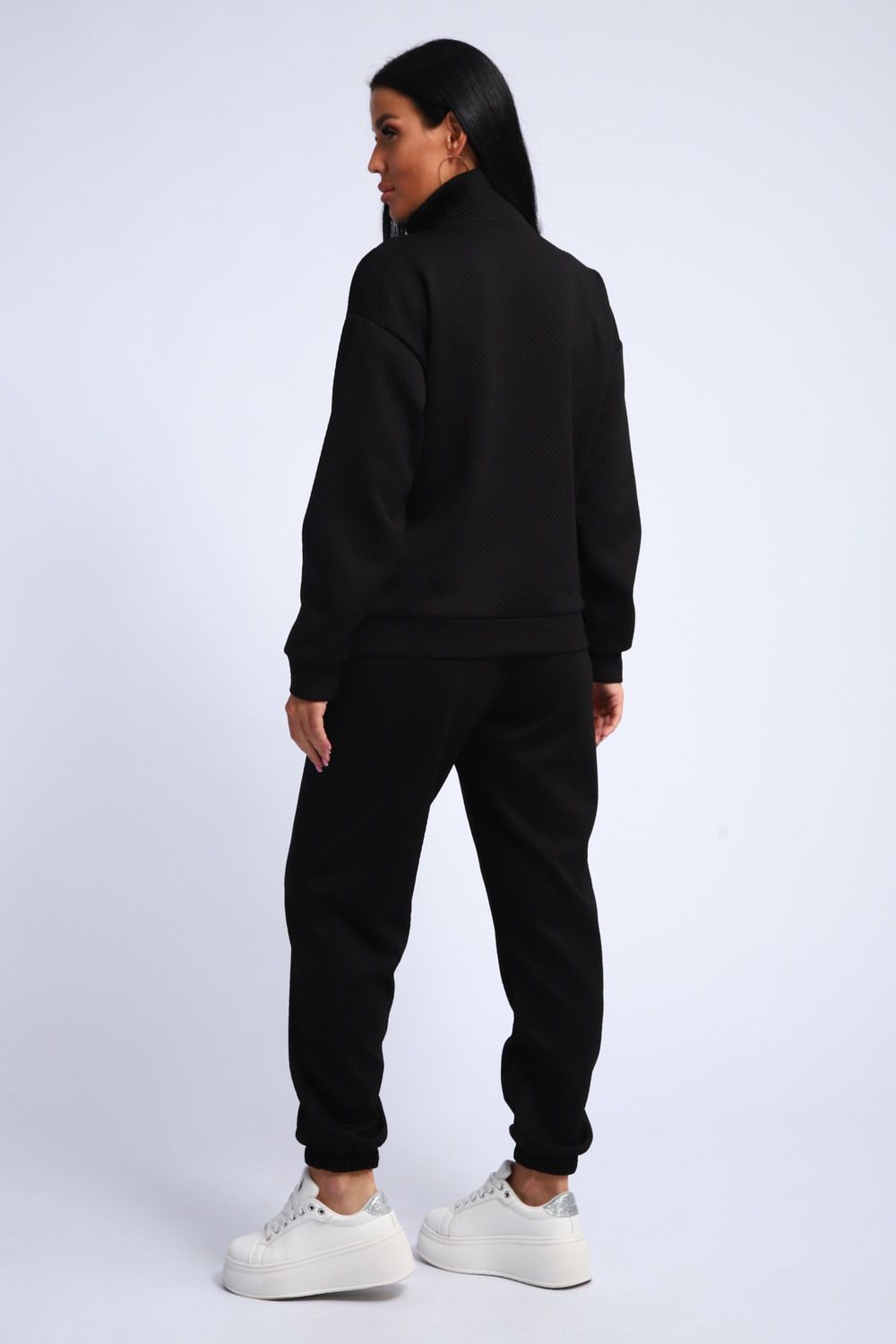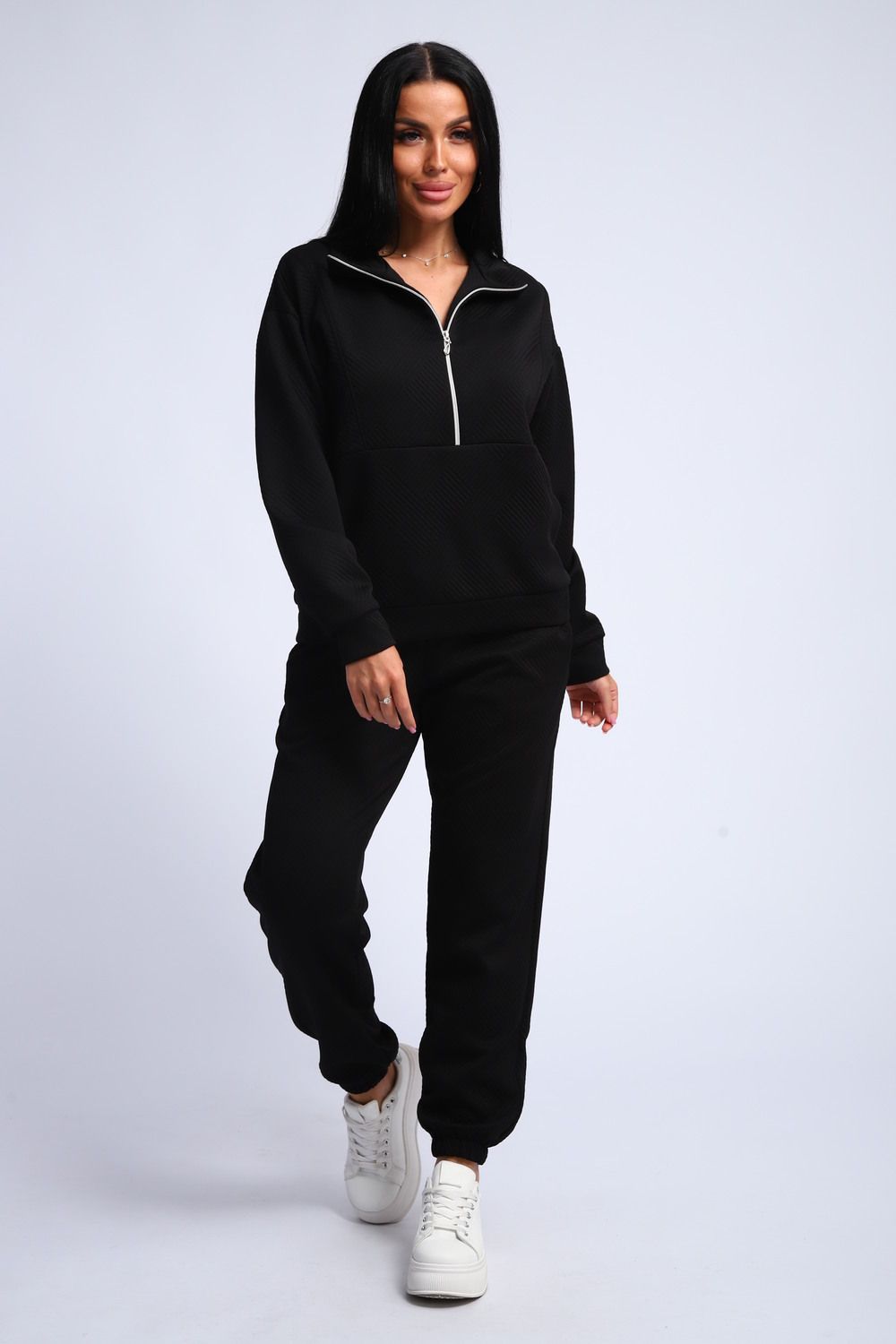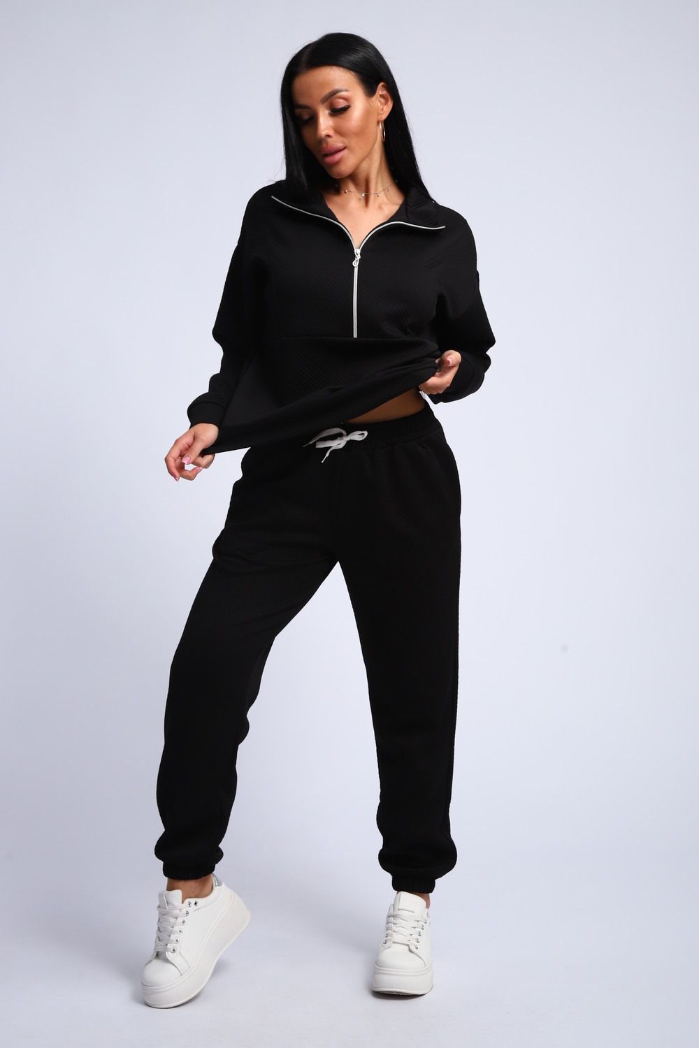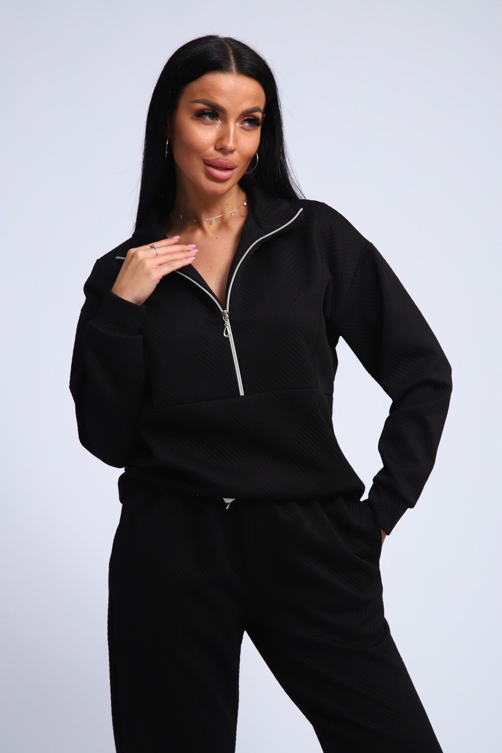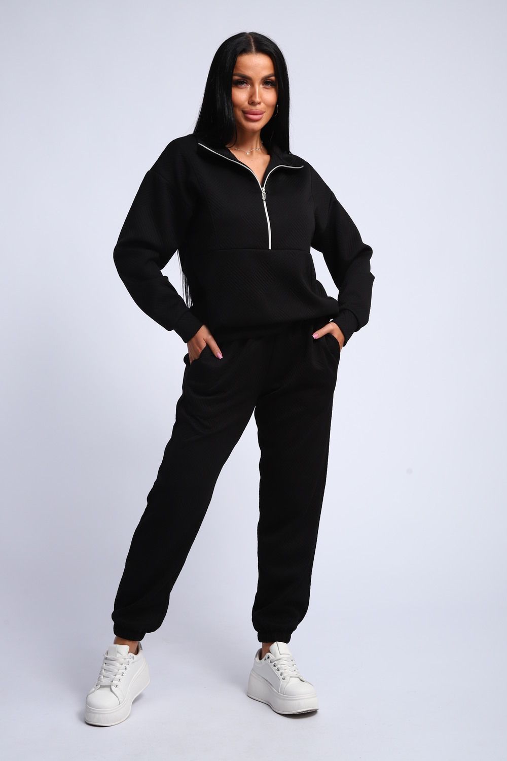 Ищете идеальный спортивный костюм? Этот женский костюм из мягкой и уютной ткани фукра – воплощение комфорта и стиля! Толстовка с манжетами и воротником-стойкой, застегивающаяся на молнию, обеспечит тепло и защиту от ветра. Горловина на молнии позволяет регулировать температуру и создавать различные образы.